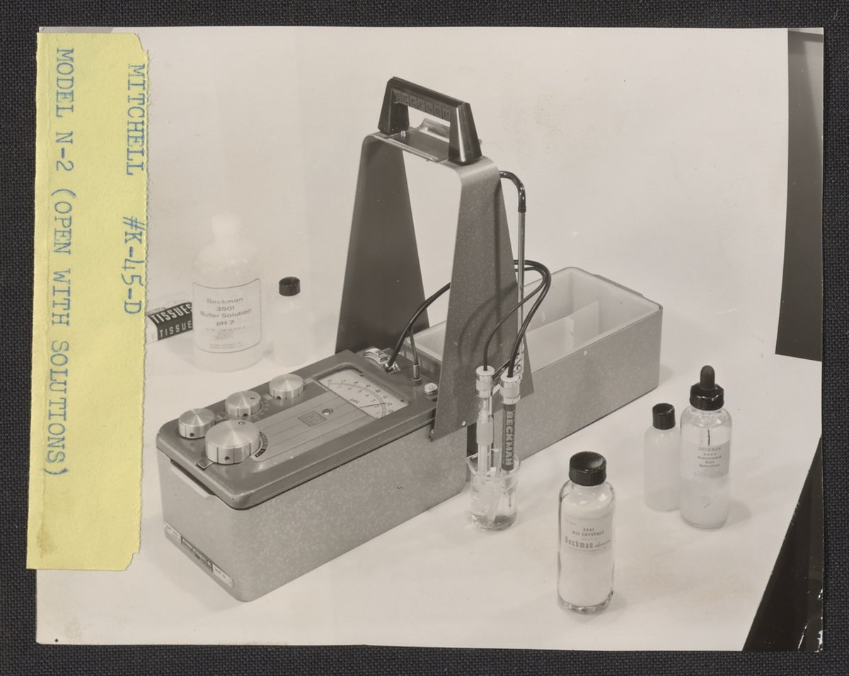 Preston E. Mitchell Commercial Photography. “Beckman Model N2 PH Meter with Solutions,” n.d. Beckman Historical Collection, Box 86. Science History Institute. Philadelphia. https://digital.sciencehistory.org/works/2b88qc54w.