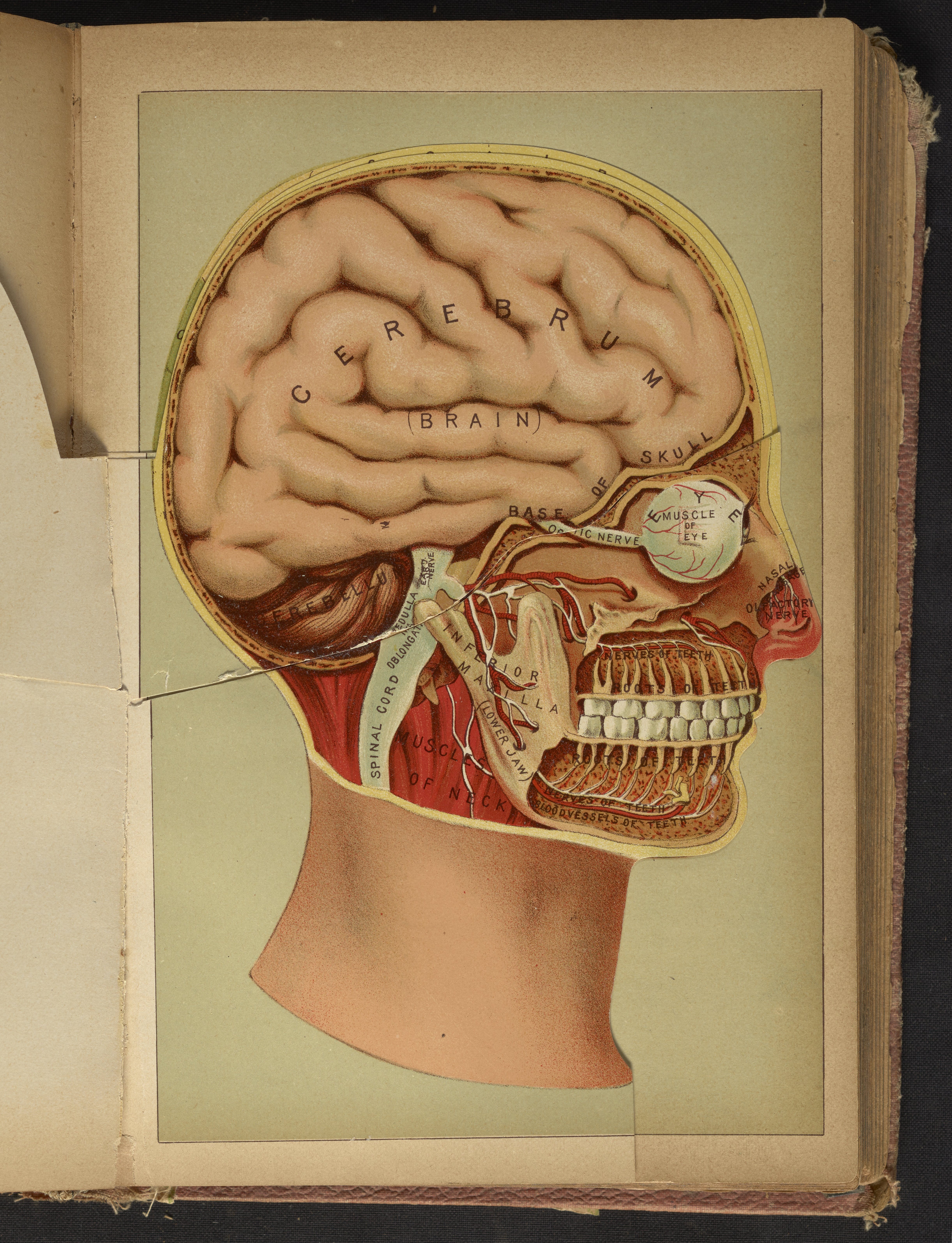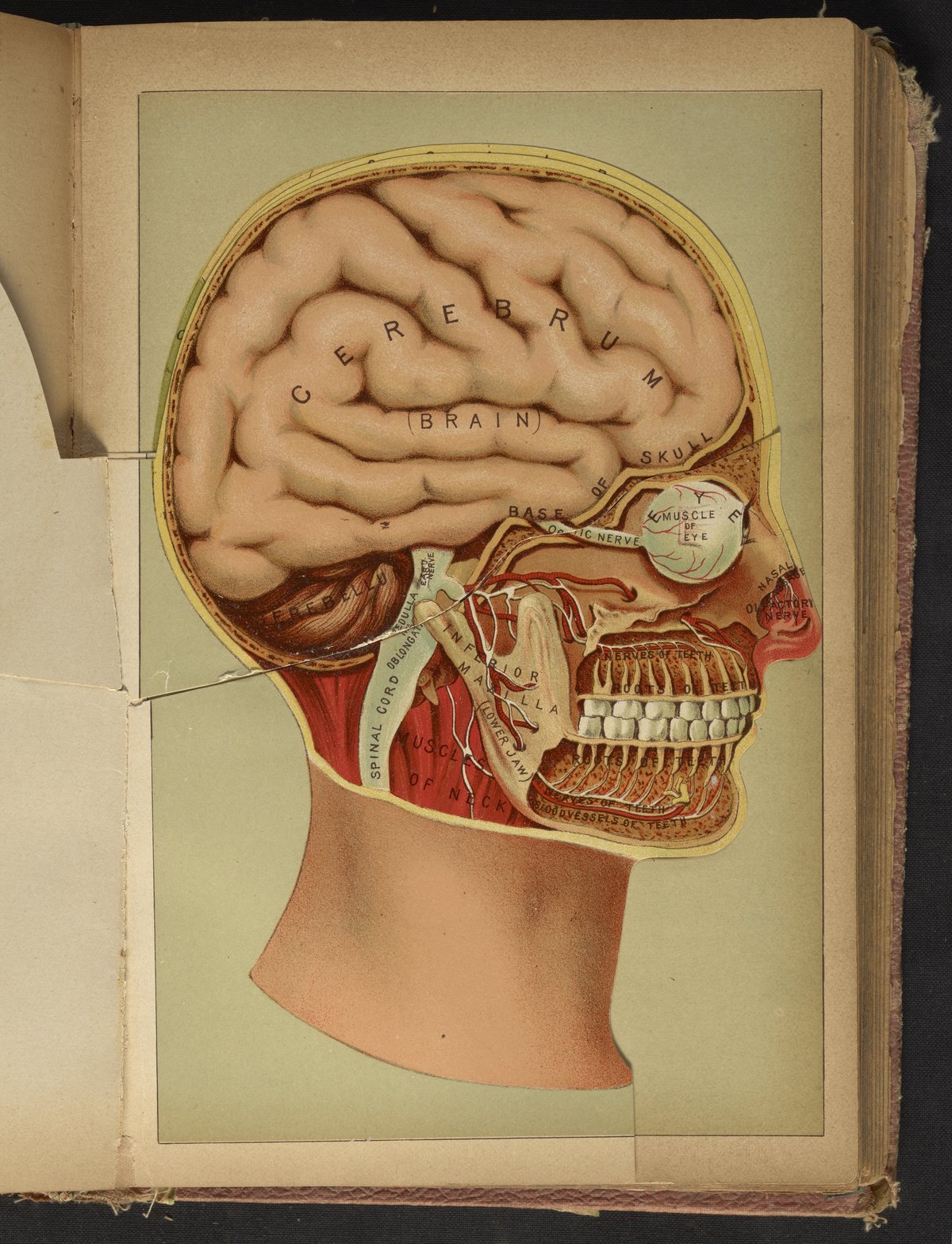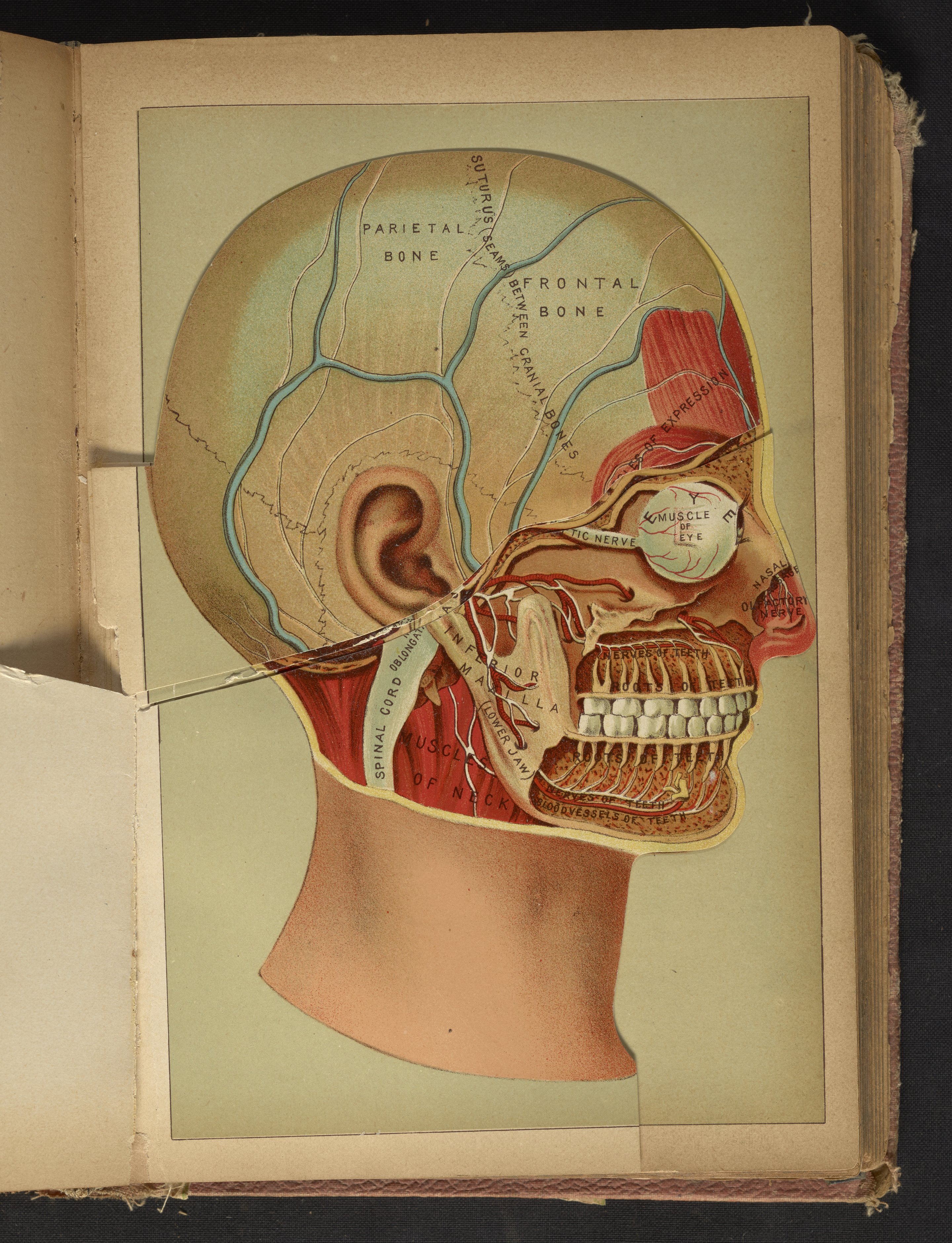 Three-dimensional color diagram of human head consisting of hinged, paper flap overlays. A form of anatomical illustration in use as early as 1538, the overlays progressively fold back to reveal the interior and major components of the head, skull, and brain, including cranial bones, teeth, muscles, spinal cord, and nasal passages. The final image is a phrenological illustration depicting the parts of the brain purported to control one's propensities towards a variety of sentiments and emotions, including hope, cautiousness, spirituality, and combativeness. This diagram appears opposite page 870 in The Book of Health (1898).