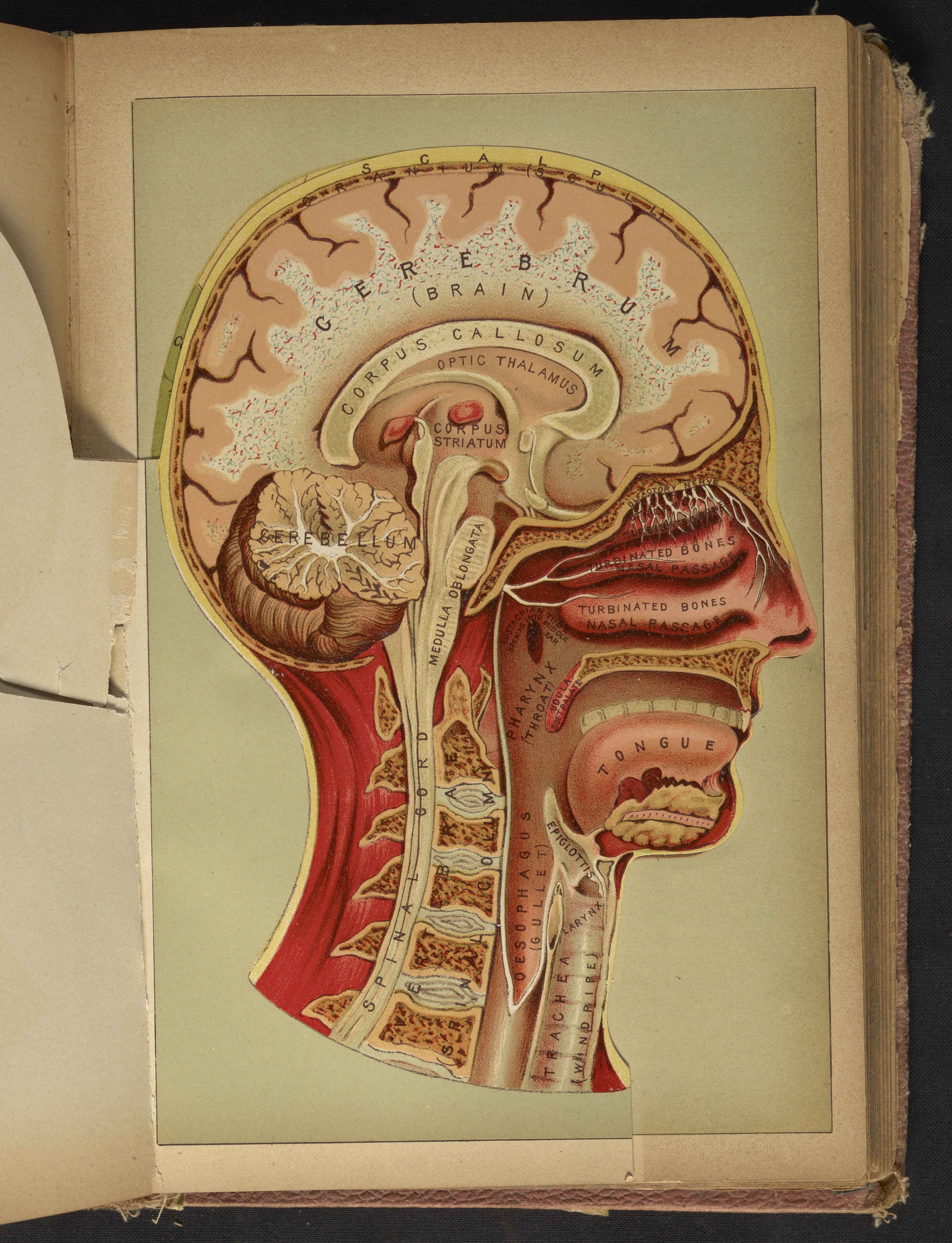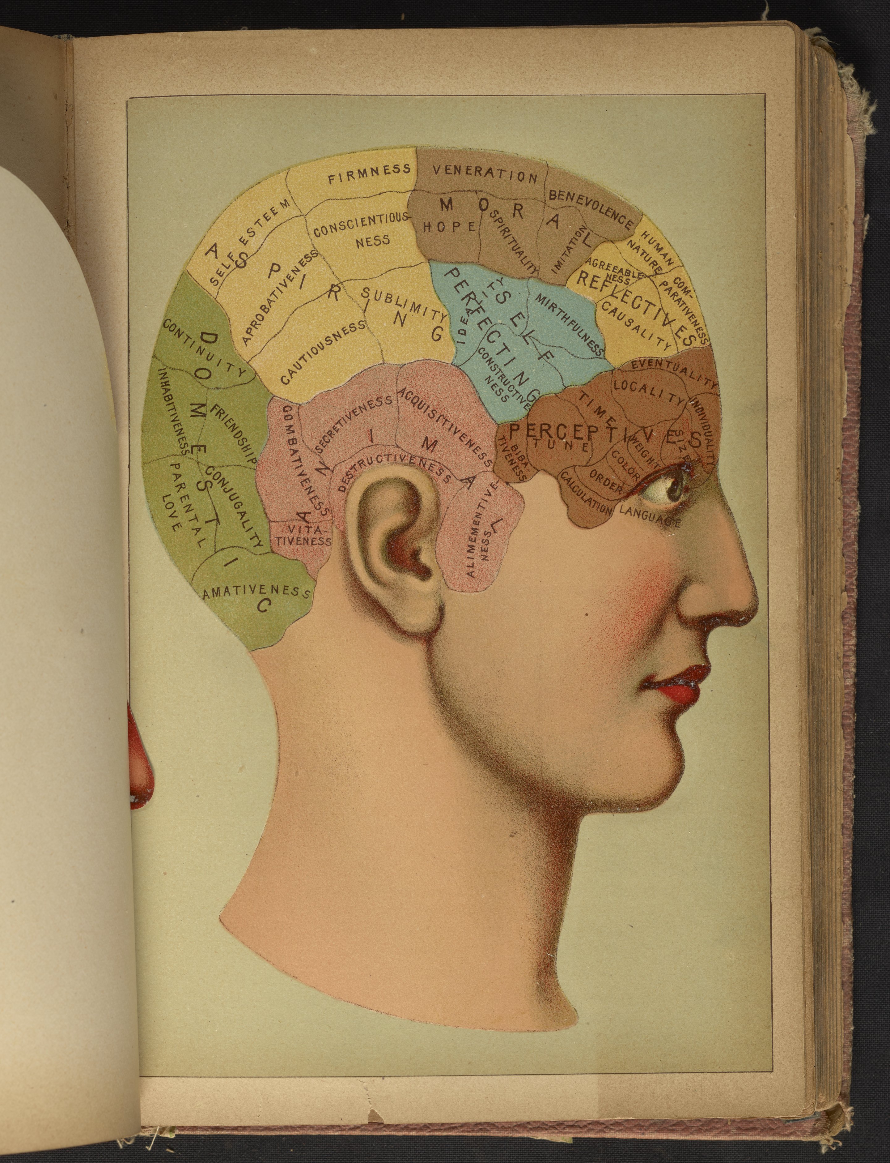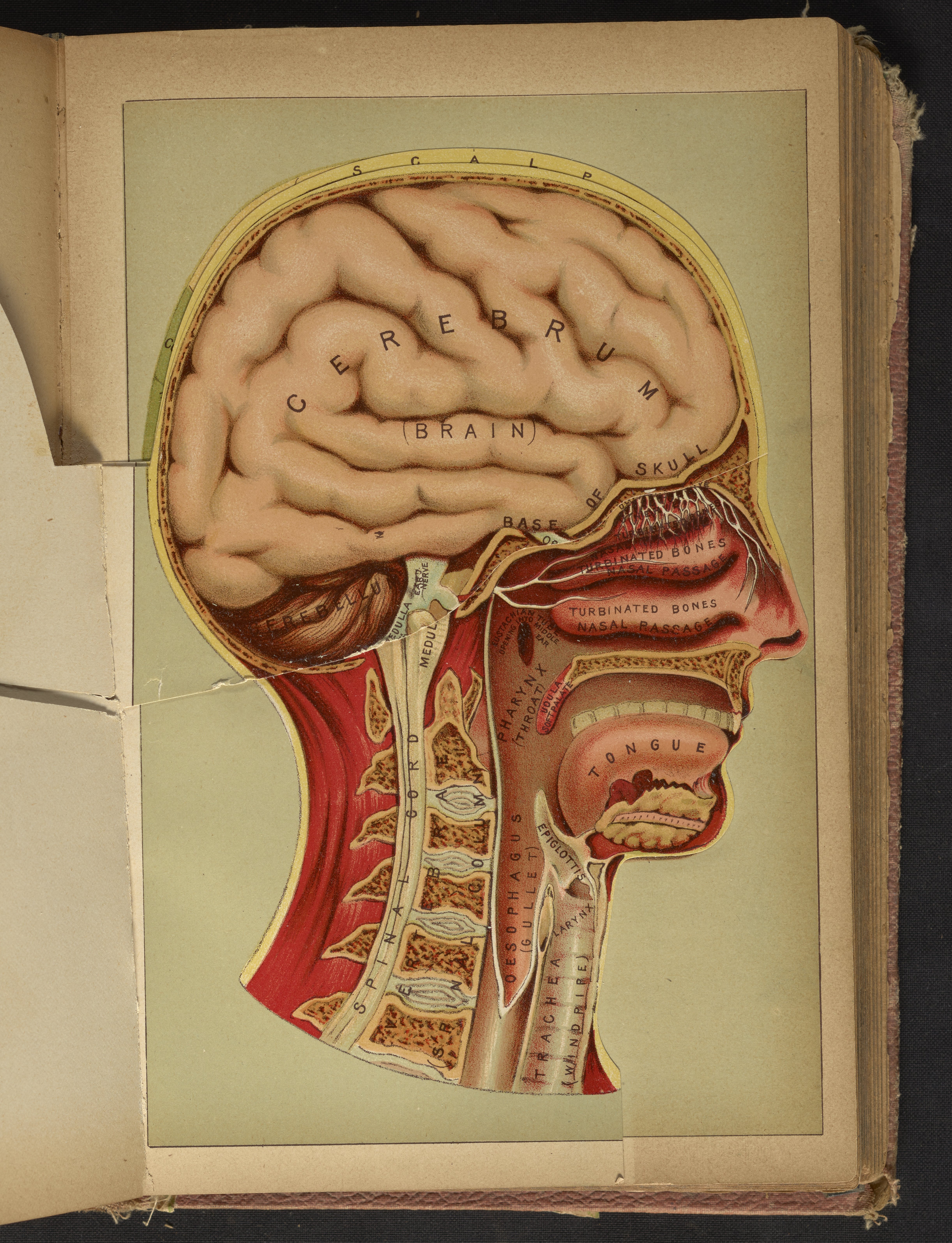 Three-dimensional color diagram of human head consisting of hinged, paper flap overlays. A form of anatomical illustration in use as early as 1538, the overlays progressively fold back to reveal the interior and major components of the head, skull, and brain, including cranial bones, teeth, muscles, spinal cord, and nasal passages. The final image is a phrenological illustration depicting the parts of the brain purported to control one's propensities towards a variety of sentiments and emotions, including hope, cautiousness, spirituality, and combativeness. This diagram appears opposite page 870 in The Book of Health (1898).