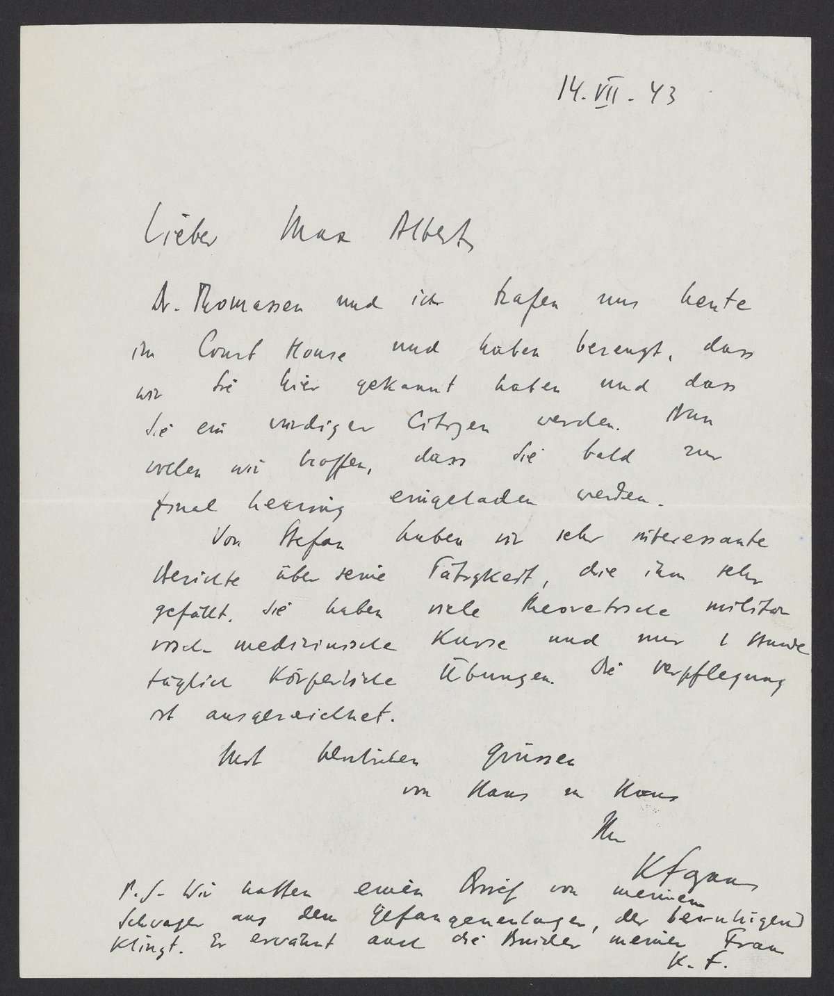 Letter from Kasimir Fajans to Max Bredig, July 14, 1943