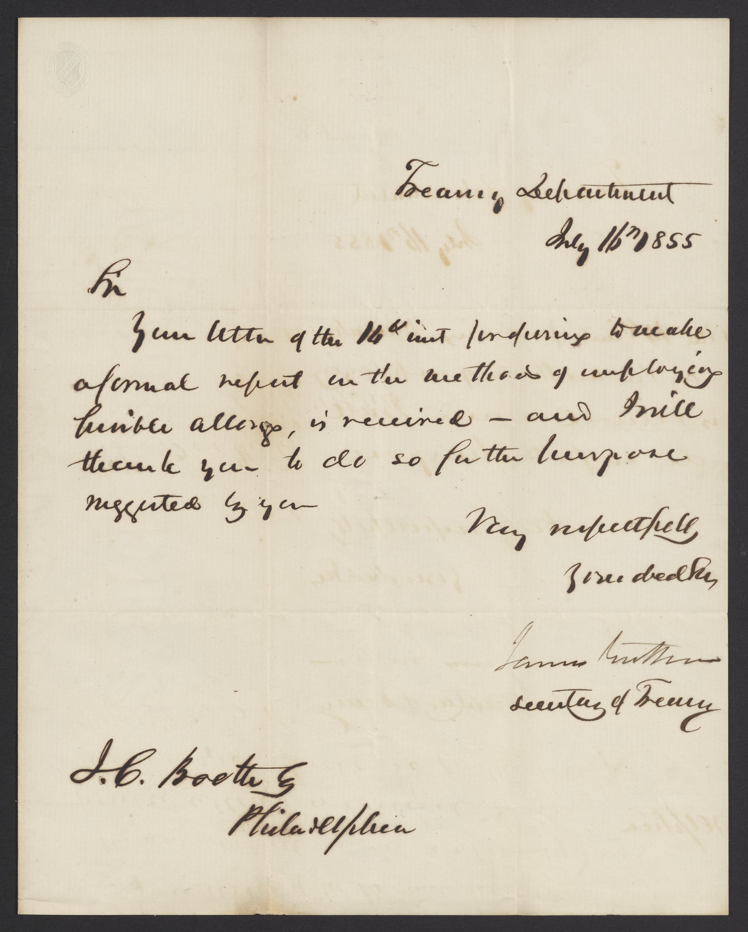 Small JPG1200 x 1496px — 183 KBLarge JPG2880 x 3590px — 1000 KBFull-sized JPG3322 x 4141px — 1.3 MBOriginal fileTIFF — 3322 x 4141px — 39.4 MBJames B. Guthrie (1792 - 1869), United States Secretary of the Treasury from 1853-1857, writes to James Curtis Booth (1810-1888) to acknowledge the receipt of Booth's report.