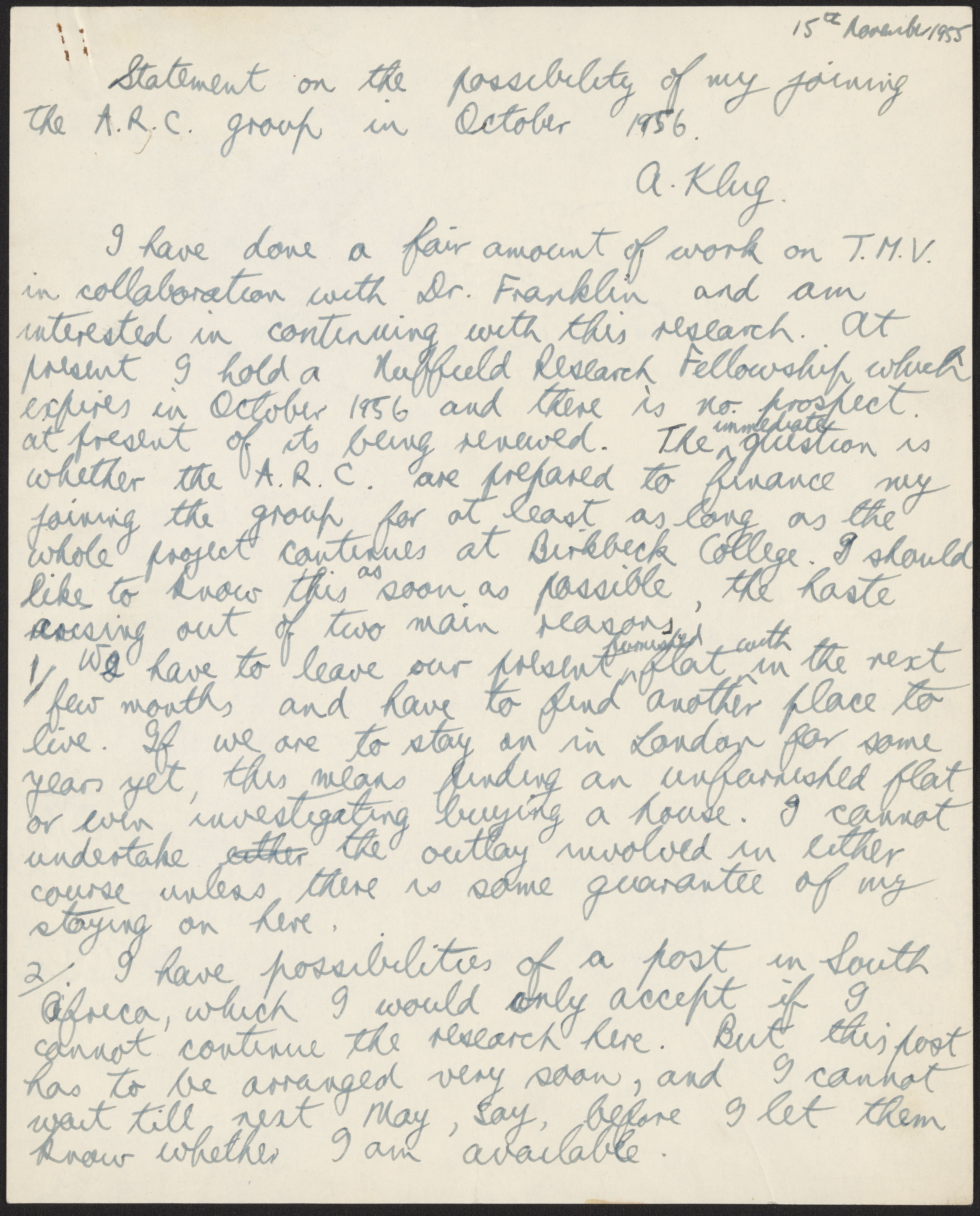 Letter from Rosalind Franklin to Aaron Klug, November 15, 1955