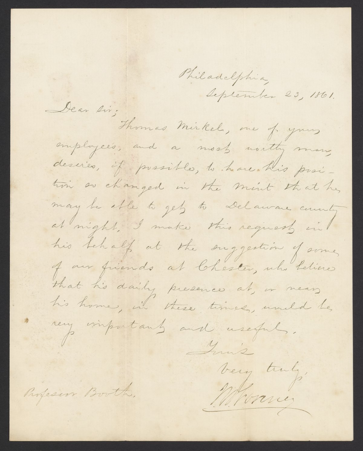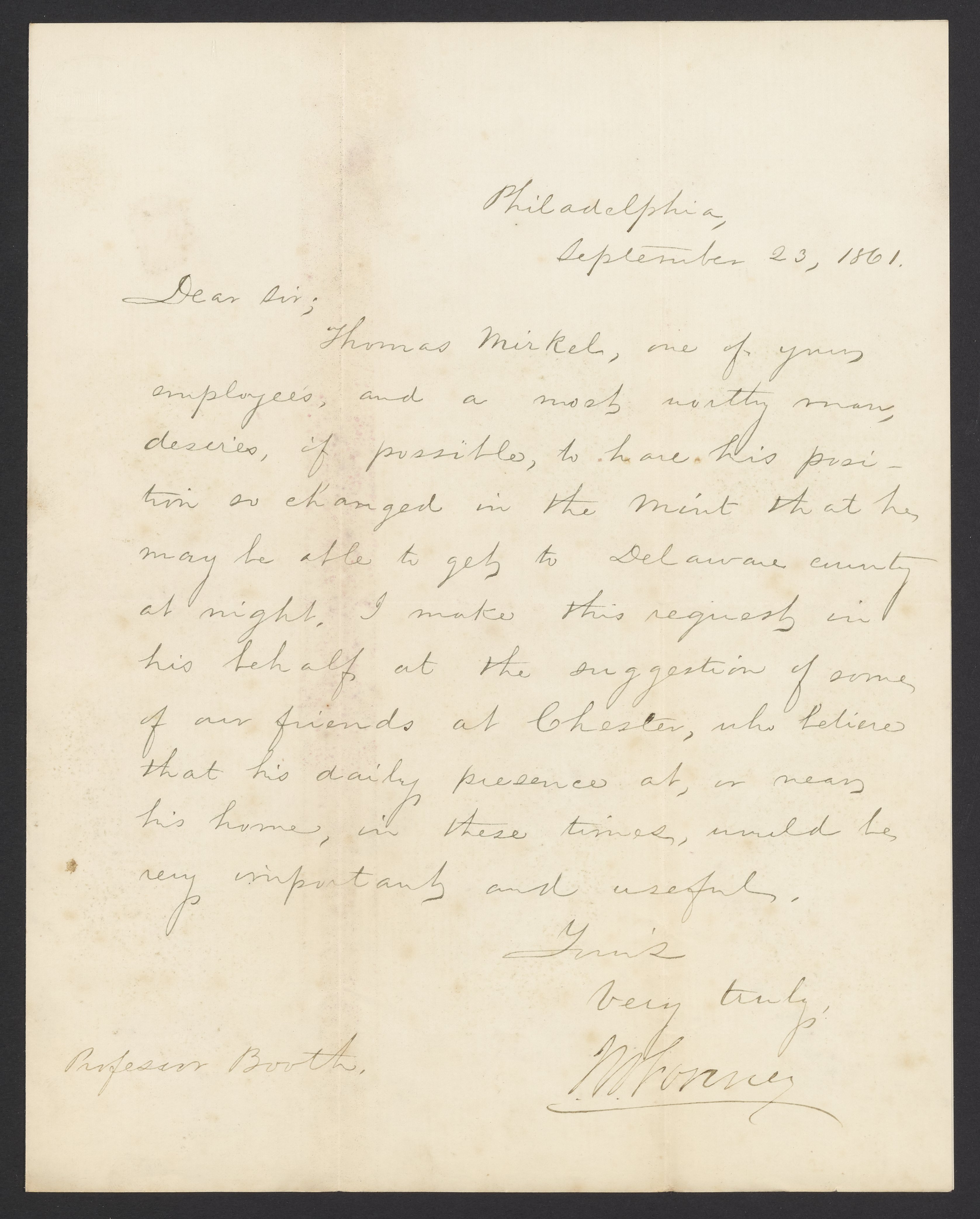 Letter from John Wien Forney to James Curtis Booth, September 23, 1861