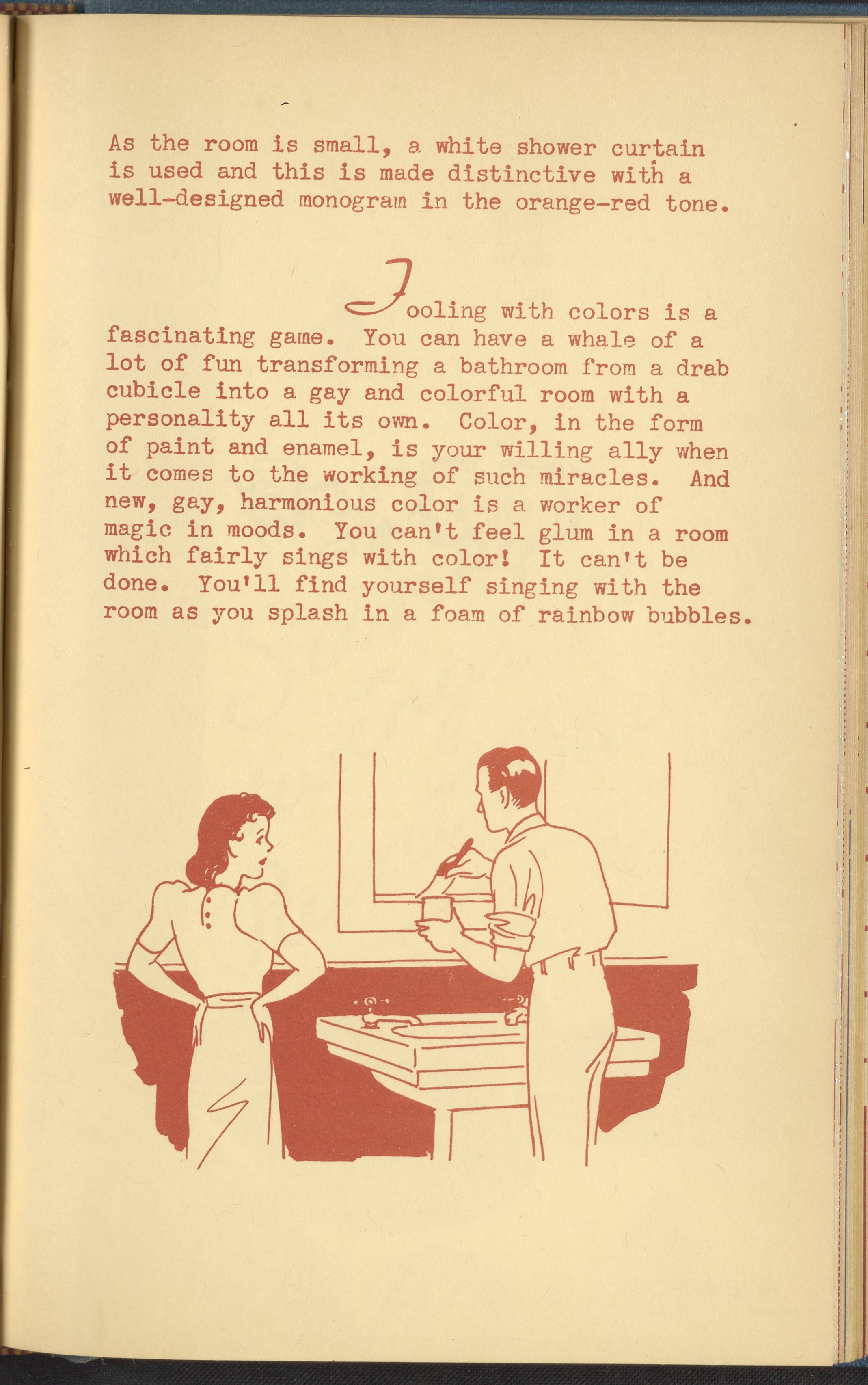 Booklet corresponding to a radio broadcast program created by the National Paint, Varnish, and Lacquer Association. The booklet describes various bathroom color schemes and fixtures to inspire readers to redecorate their home's bathrooms. Includes small stylized illustrations throughout and decorated covers.