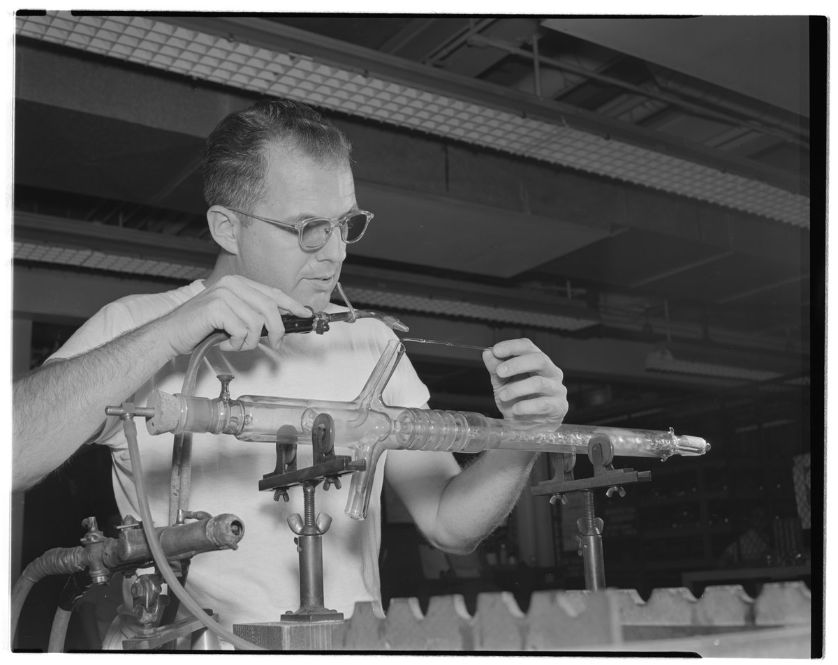 Dow Chemical Company. “Bill Pahl Heating and Compressing Glass Tube,” October 2, 1957. Dow Chemical Company Historical Image Collection, Box 6, Folder Dow Plant--Glass Laboratory. Science History Institute. Philadelphia. https://digital.sciencehistory.org/works/2f75r840s.