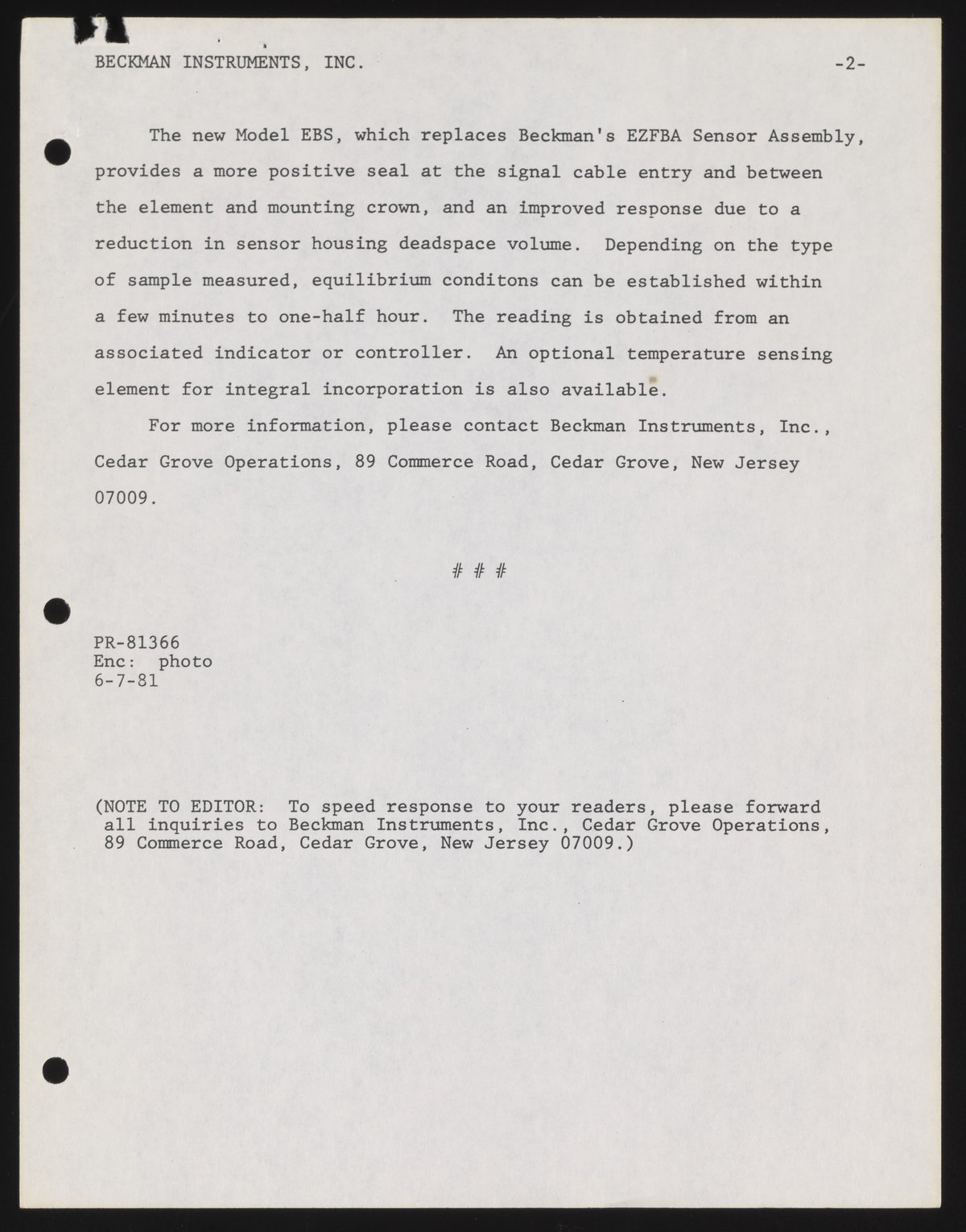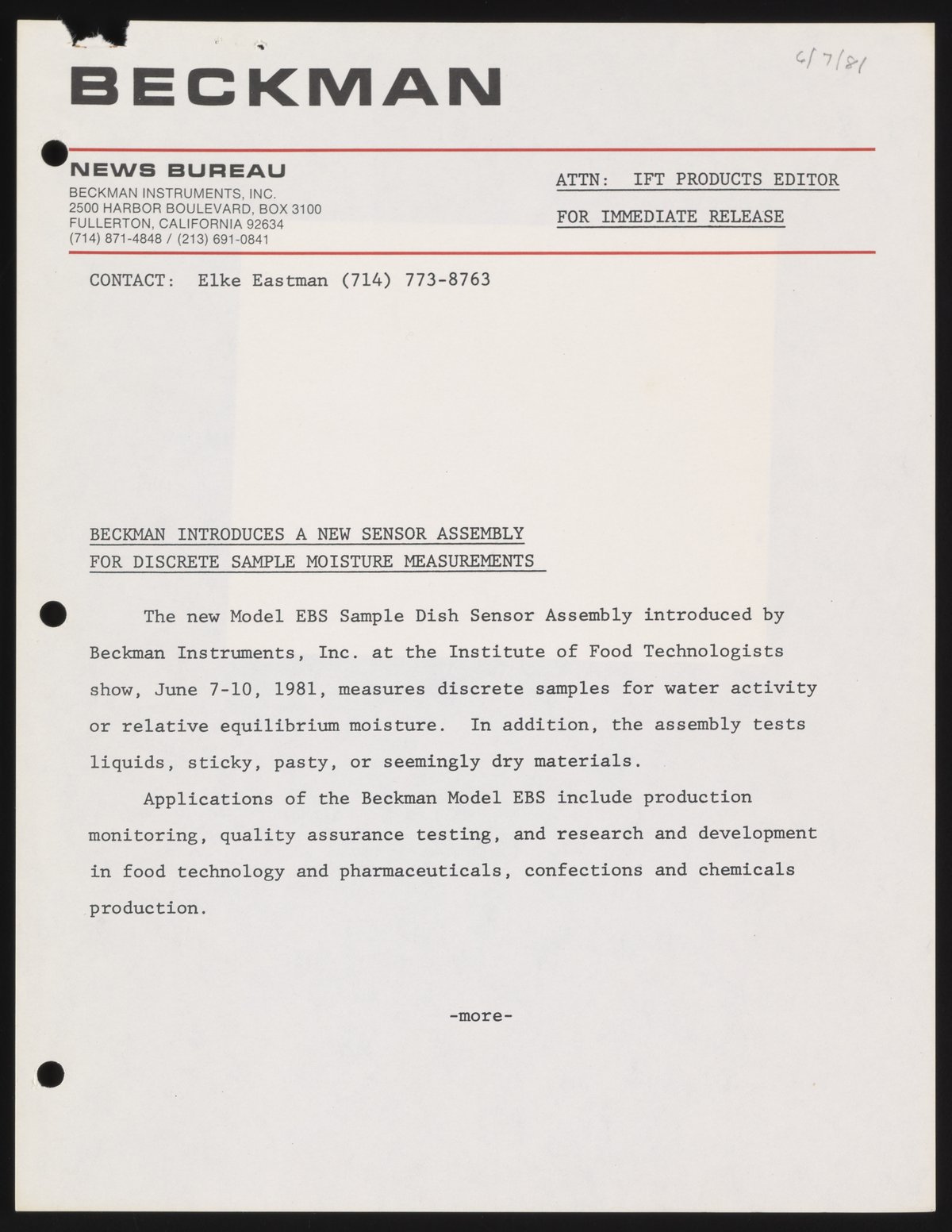 Eastman, Elke. “Beckman Introduces a New Sensor Assembly for Discrete Sample Moisture Measurements,” June 7, 1981. Beckman Historical Collection, Box 58, Folder 69. Science History Institute. Philadelphia. https://digital.sciencehistory.org/works/2f75r852k.