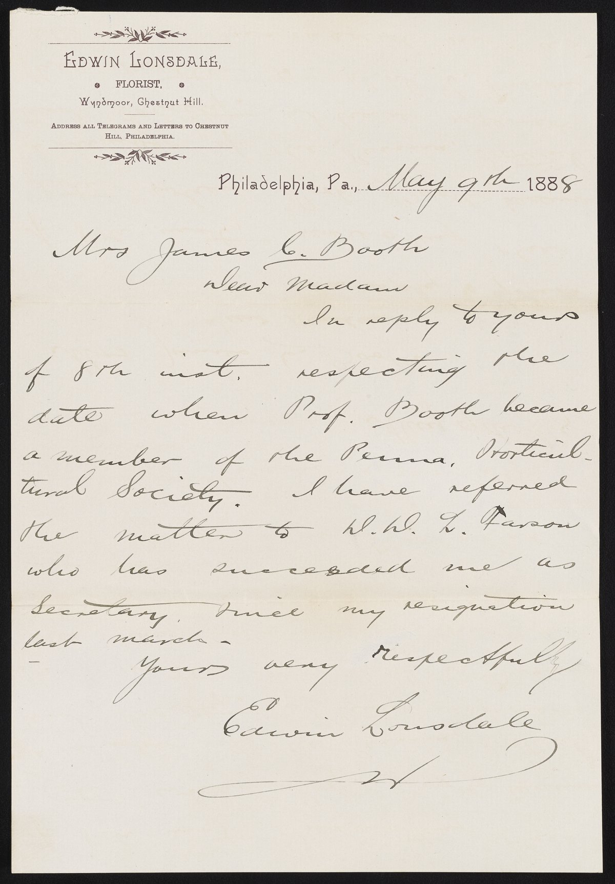 Lonsdale, Edwin. “Letter from Edwin Lonsdale to Margaret M. Booth,” May 9, 1888. Papers of James Curtis Booth, Box 2, Folder 7. Science History Institute. Philadelphia. https://digital.sciencehistory.org/works/2f94ipb.