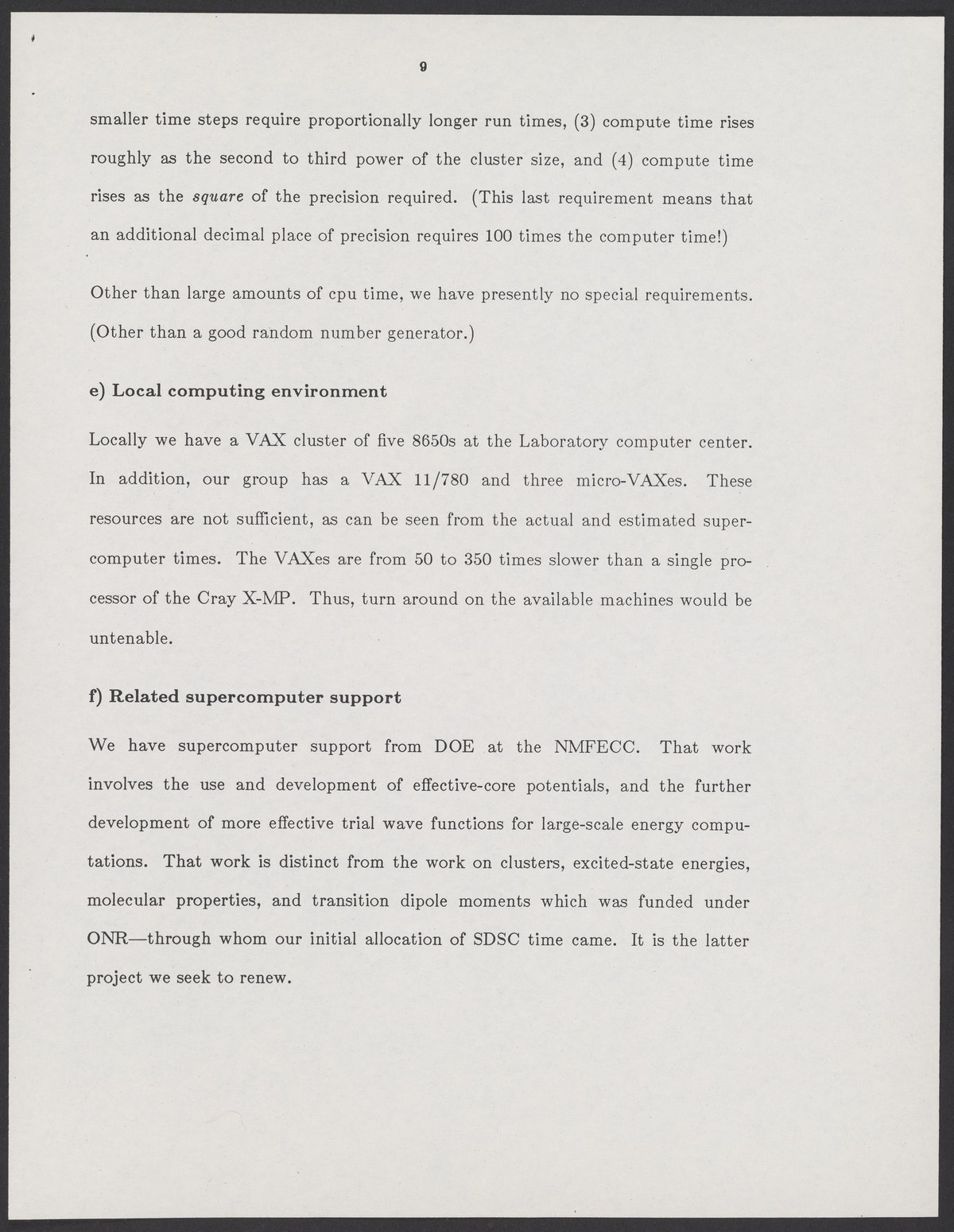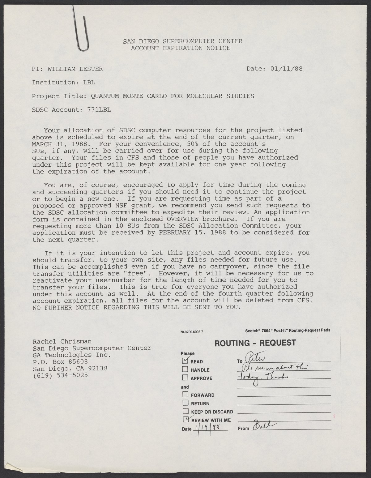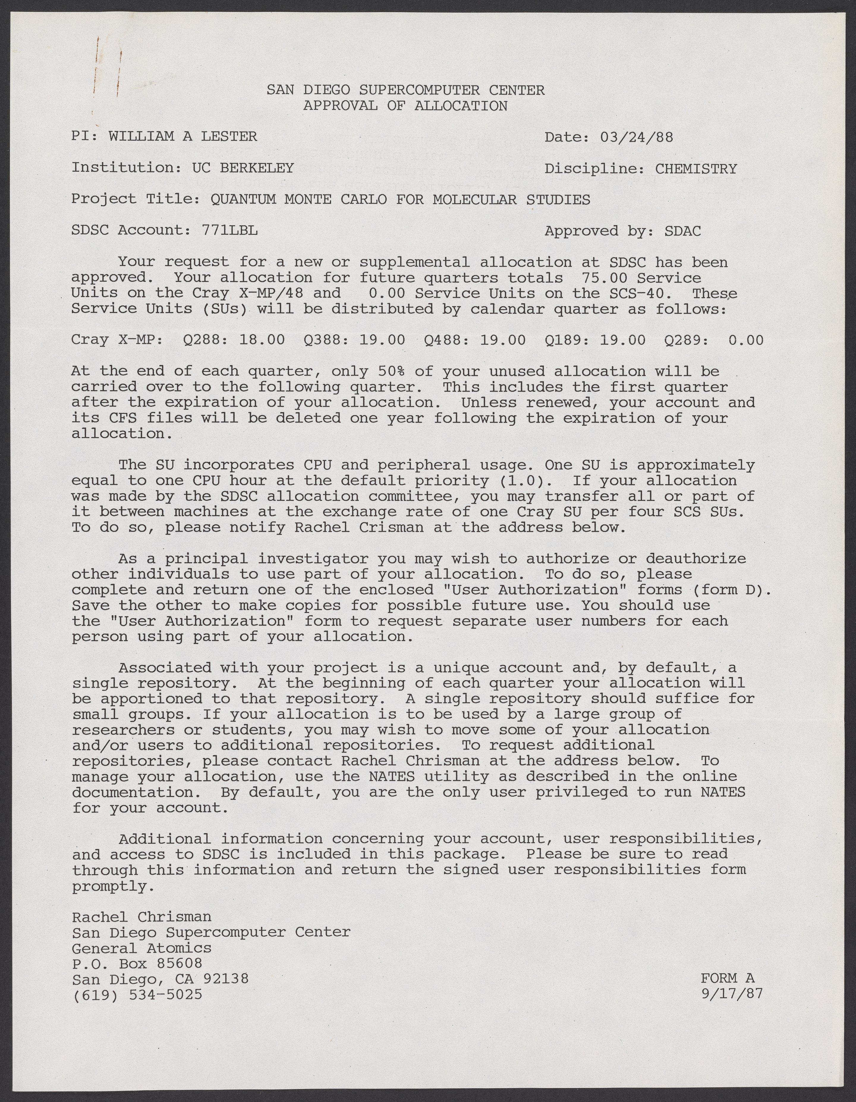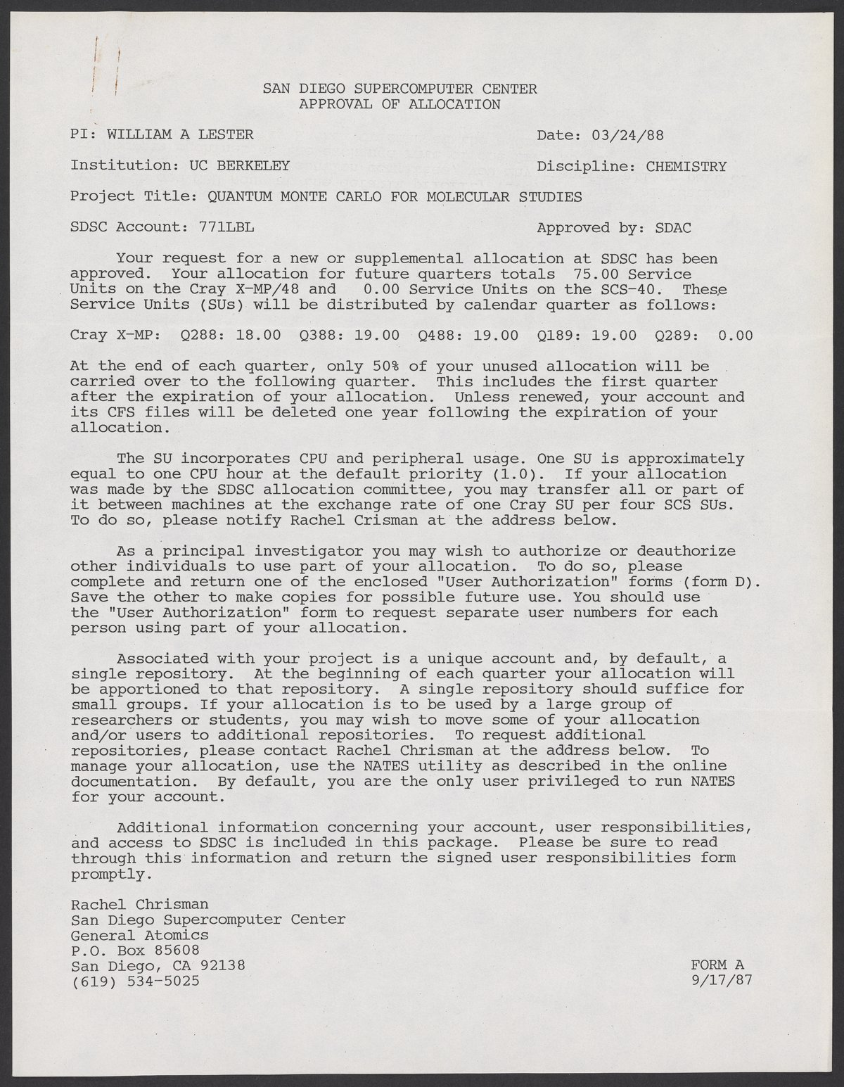 Small JPG1200 x 1546px — 308 KBLarge JPG2880 x 3711px — 1.5 MBFull-sized JPG5366 x 6914px — 5.1 MBOriginal fileTIFF — 5366 x 6914px — 106 MBA January 1988 letter informing William A. Lester, Jr. (1937-) that the computing resources at the San Diego Supercomputer Center allocated to the Quantum Monte Carlo for Molecular Studies project will expire in March 1988; a "Request for Computing Services at the San Diego Supercomputer Center" for the year beginning April 1, 1988, written by Lester and Peter J. Reynolds (1949-), his co-principle investigator; and a March 1988 approval of the request.