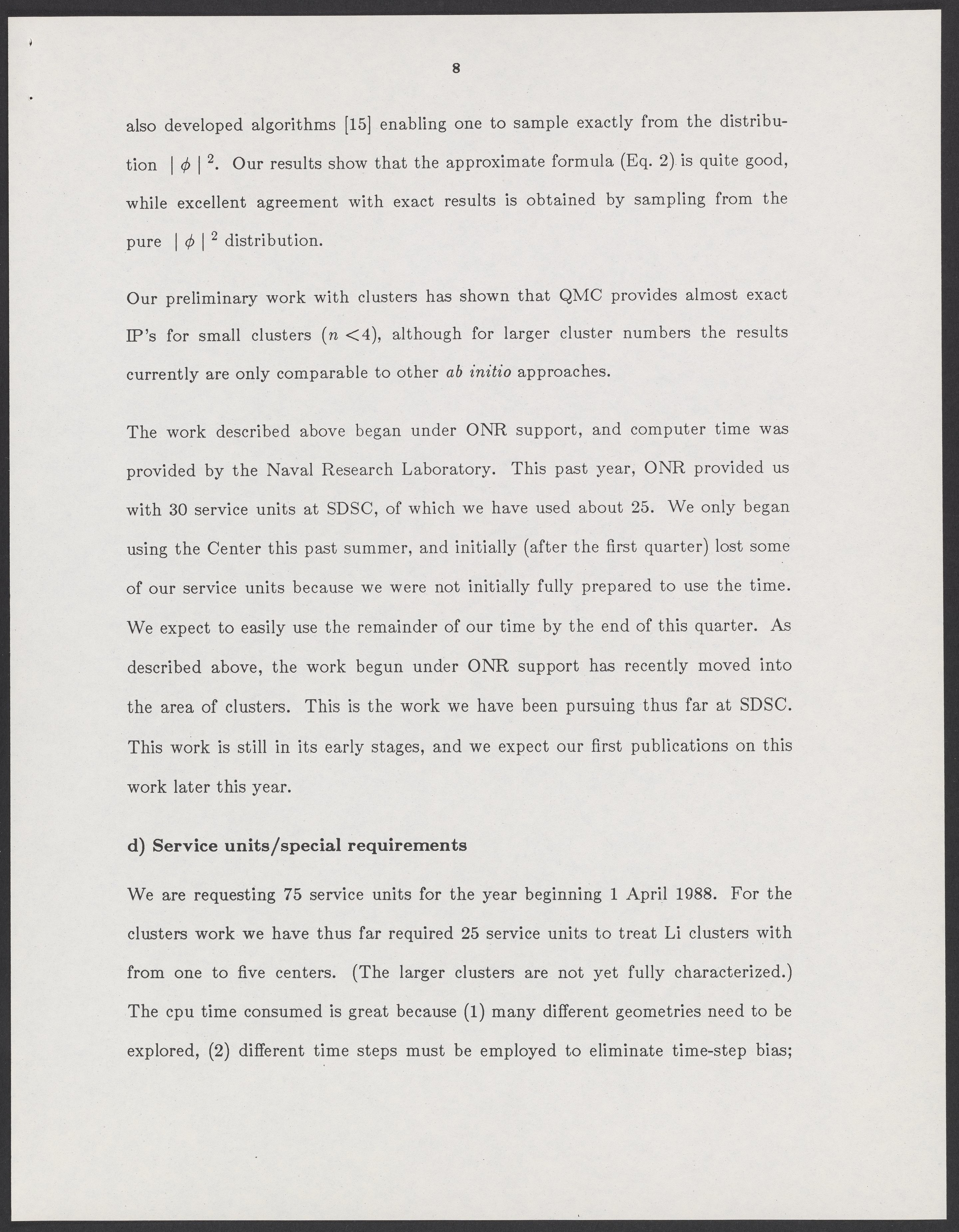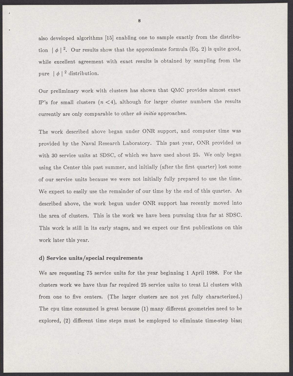 Materials relating to the Quantum Monte Carlo for Molecular Studies project's use of the San Diego Supercomputer Center, 1988