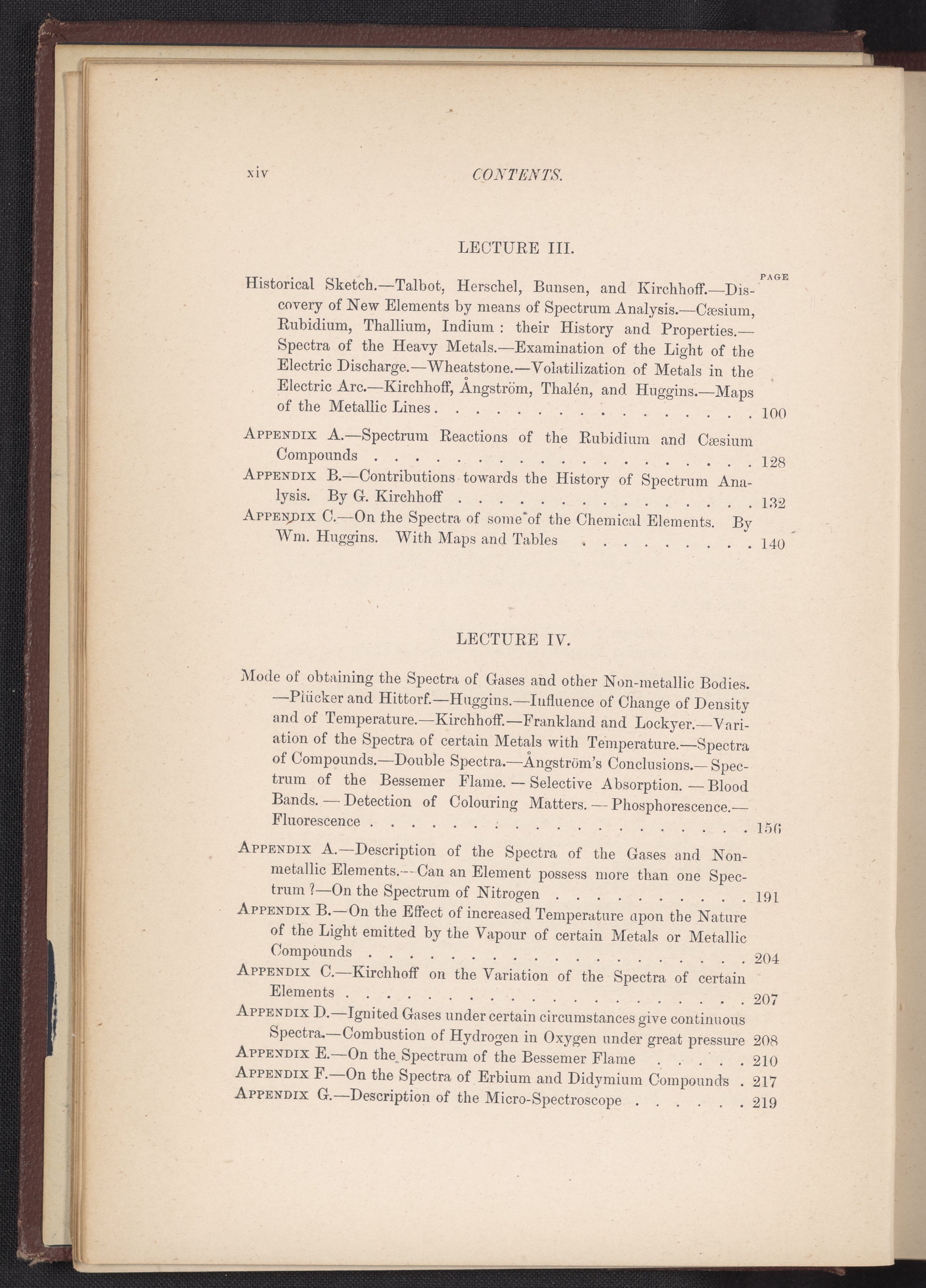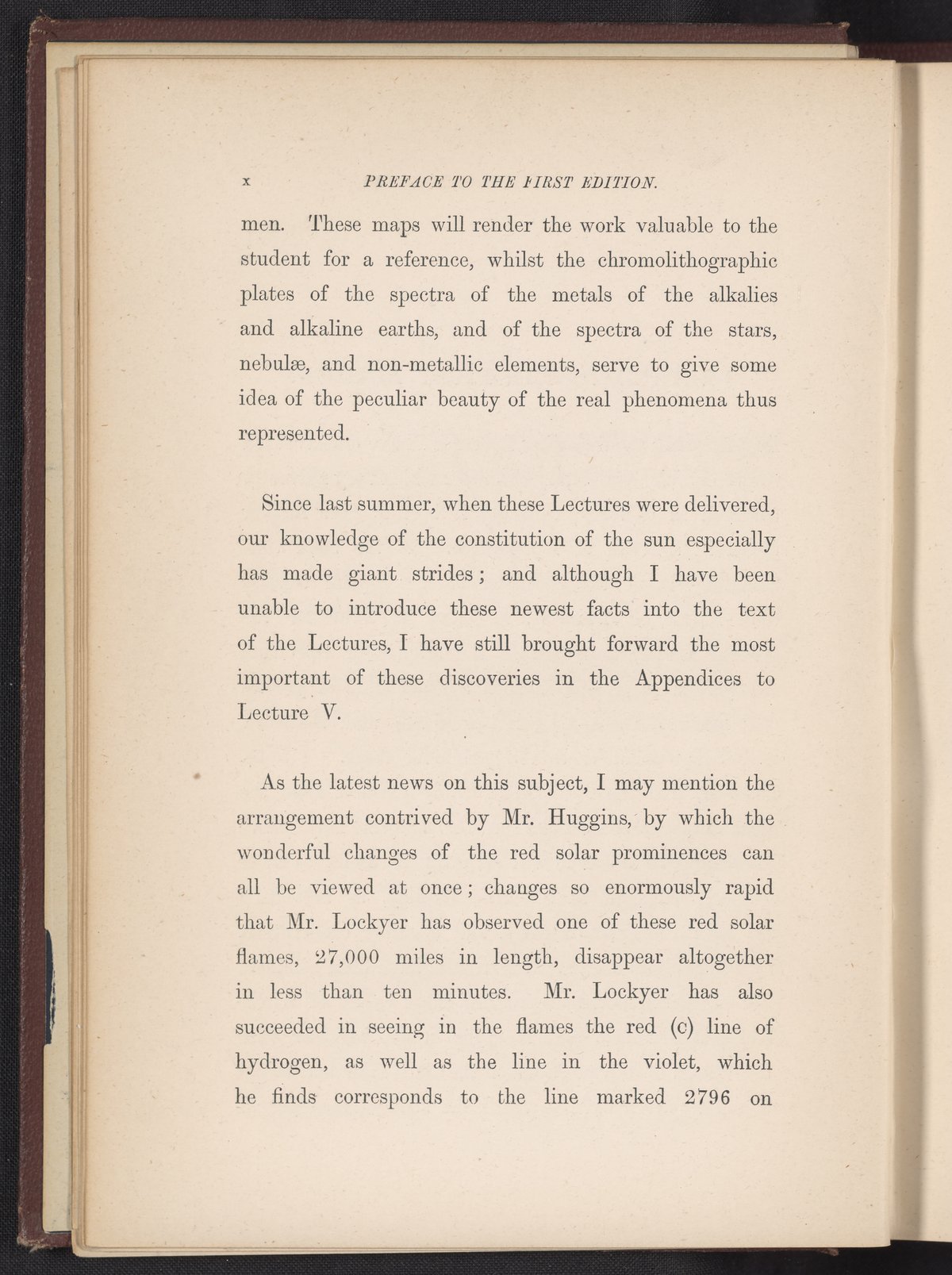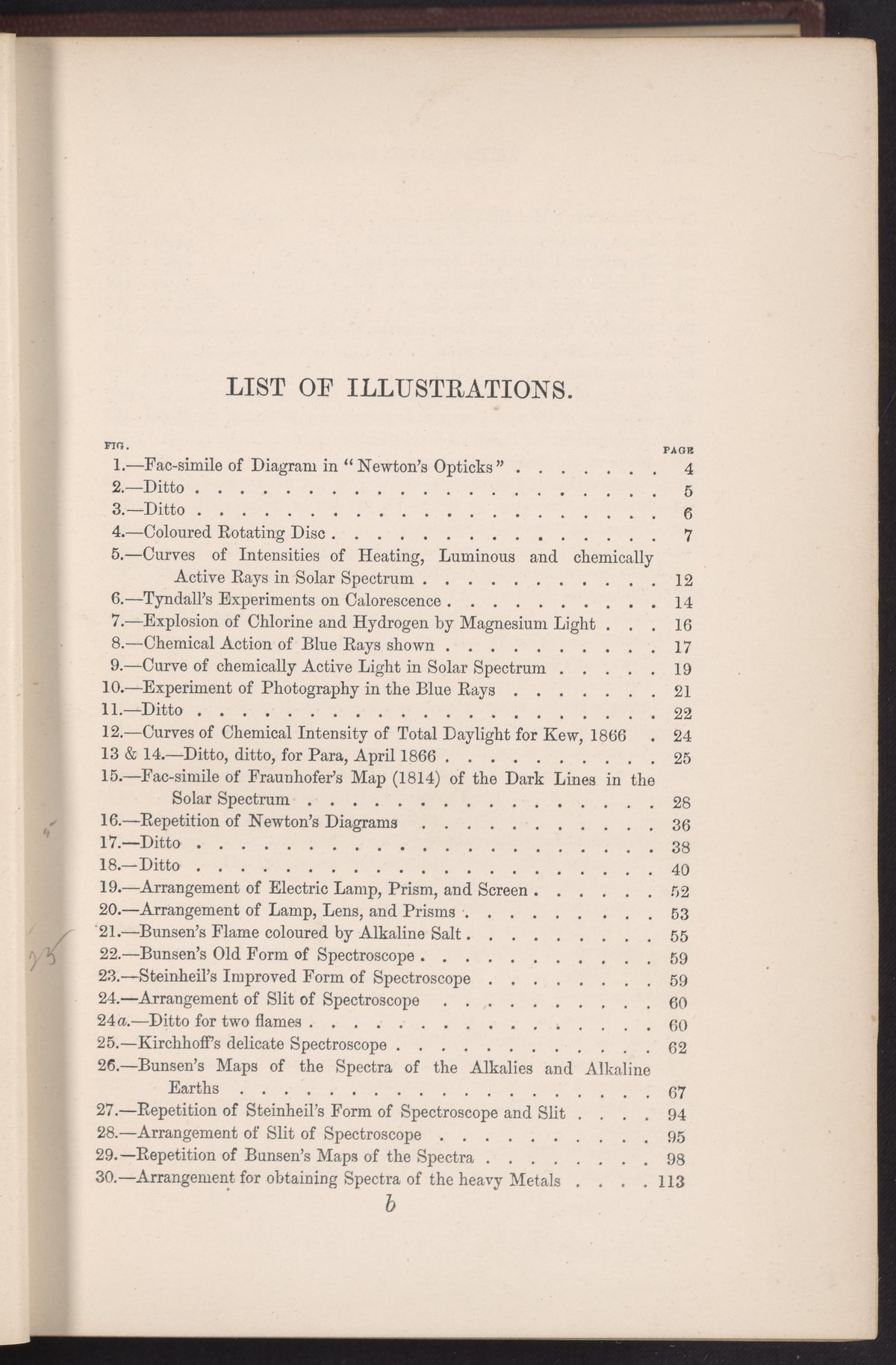 Small JPG1200 x 1573px — 391 KBLarge JPG2880 x 3776px — 1.7 MBFull-sized JPG3188 x 4180px — 2.0 MBOriginal fileTIFF — 3188 x 4180px — 38.2 MBThird edition volume of Spectrum Analysis by Henry Enfield Roscoe (1833-1915) with numerous engravings and colored plates. Roscoe has included a series of six lectures on the subject of spectrum analysis with appendices, for which he hopes these principle memoirs will "prove interesting to all, as it will certainly be useful to those specially engaged in scientific inquiry..." These lectures were delivered in 1868 to the Society of Apothecaries of London, extant today as one of the largest livery companies of the City of London.