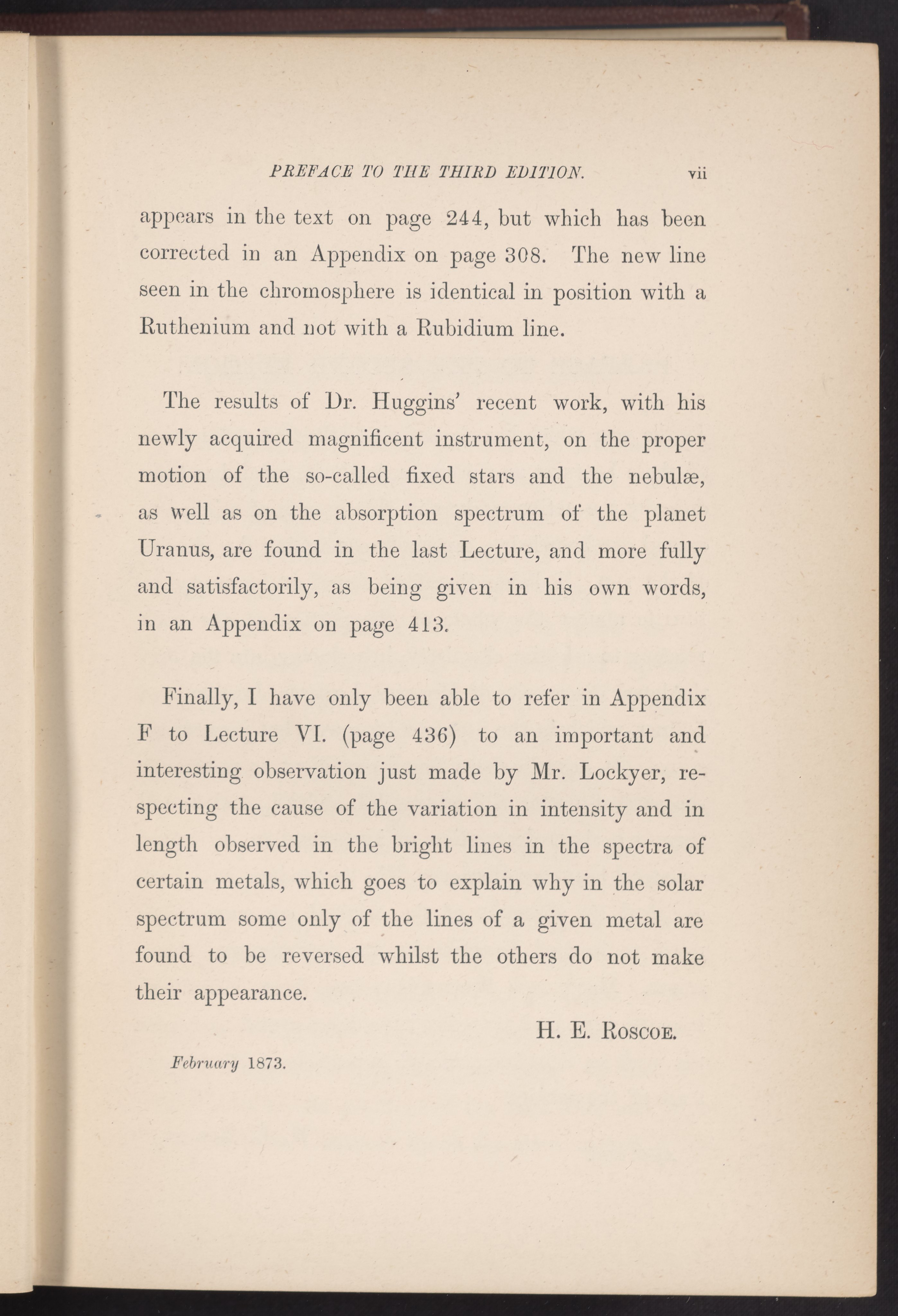 Roscoe, Henry E. (Henry Enfield). “Spectrum Analysis: Six Lectures, Delivered in 1868, Before the Society of Apothecaries of London.” London, England: Macmillan & Co., 1873. QC451 .R673 1873. Science History Institute. Philadelphia. https://digital.sciencehistory.org/works/2fskon7.