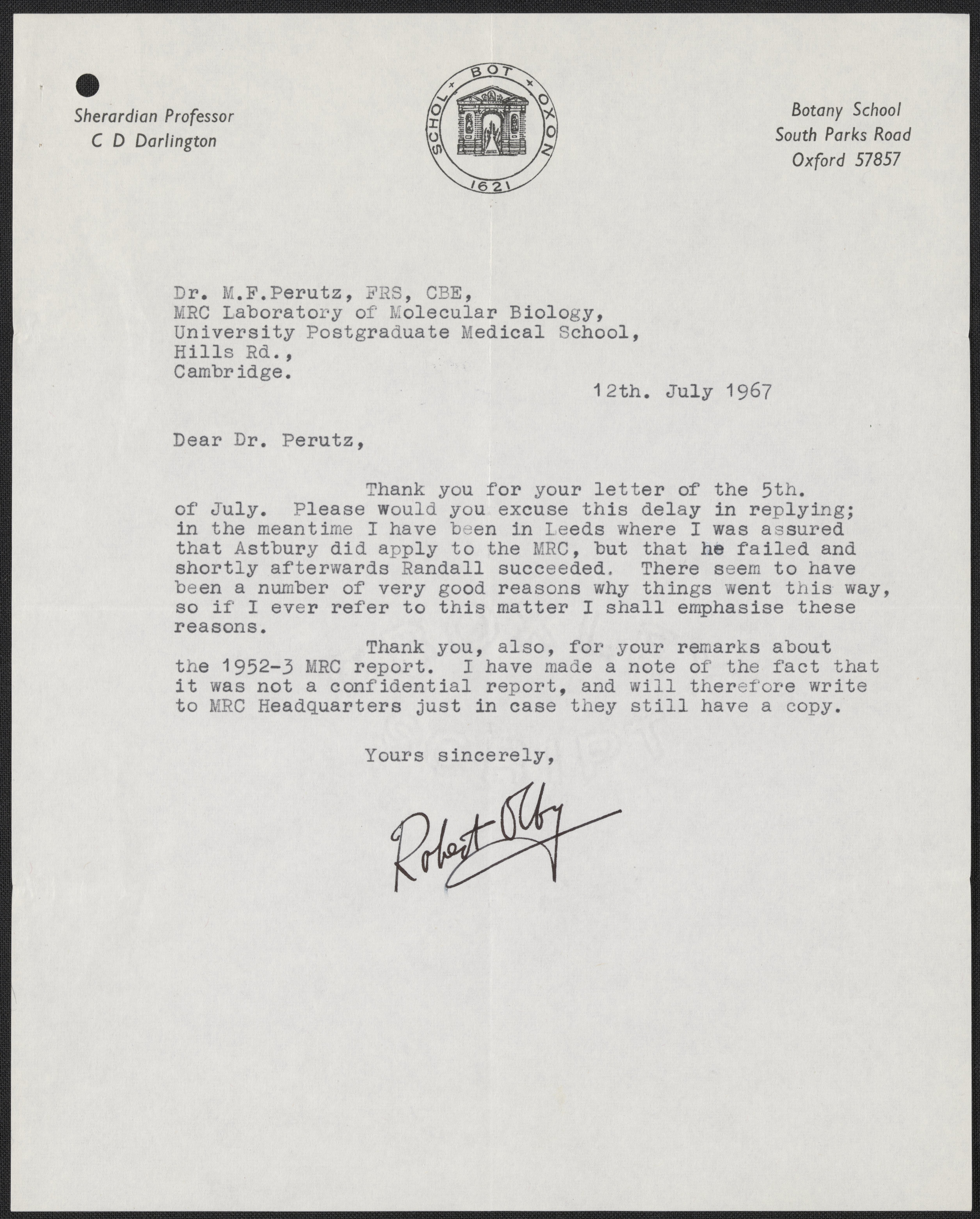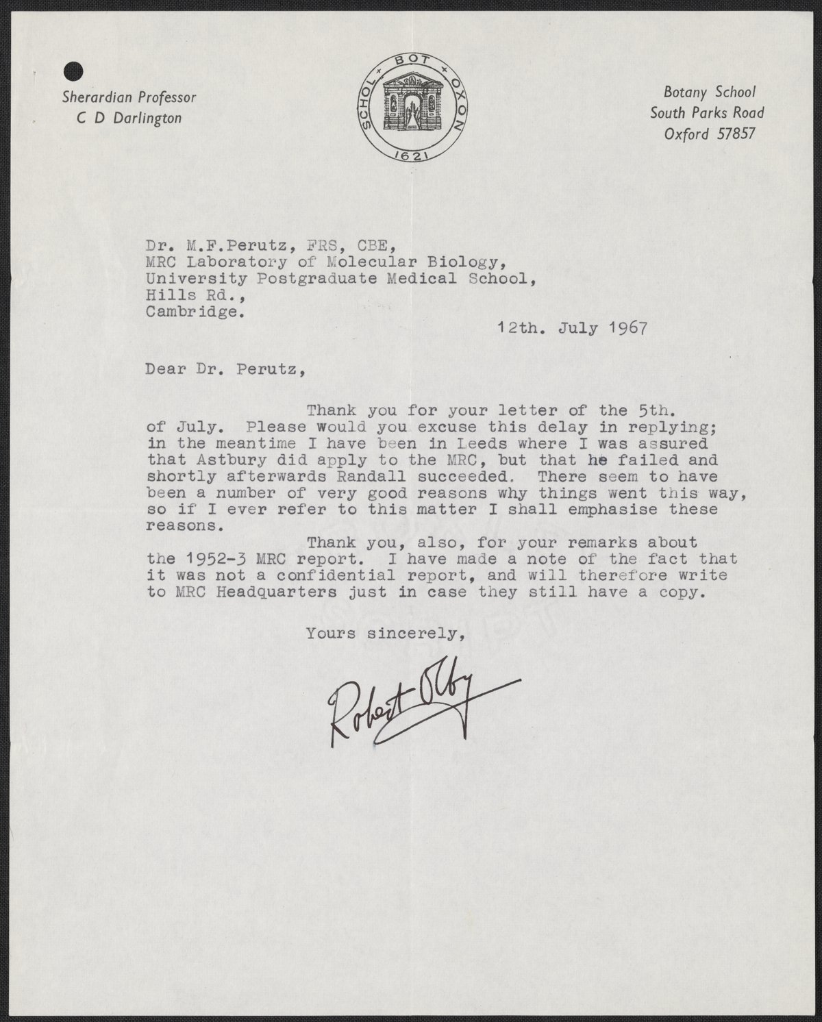 Letter from Robert Olby to Max Perutz, July 12, 1967