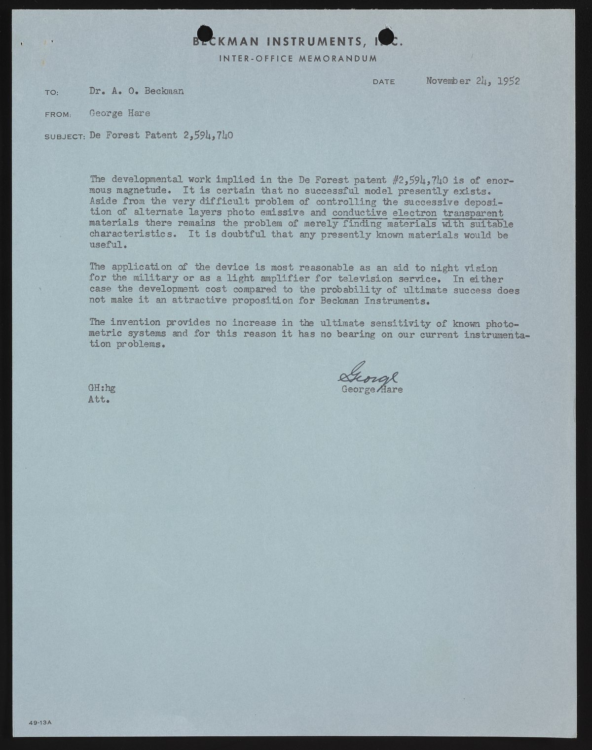 Hare, George H. “Memo from George Hare to Arnold O. Beckman,” November 24, 1952. Beckman Historical Collection, Box 1, Folder 18. Science History Institute. Philadelphia. https://digital.sciencehistory.org/works/2j62s5690.