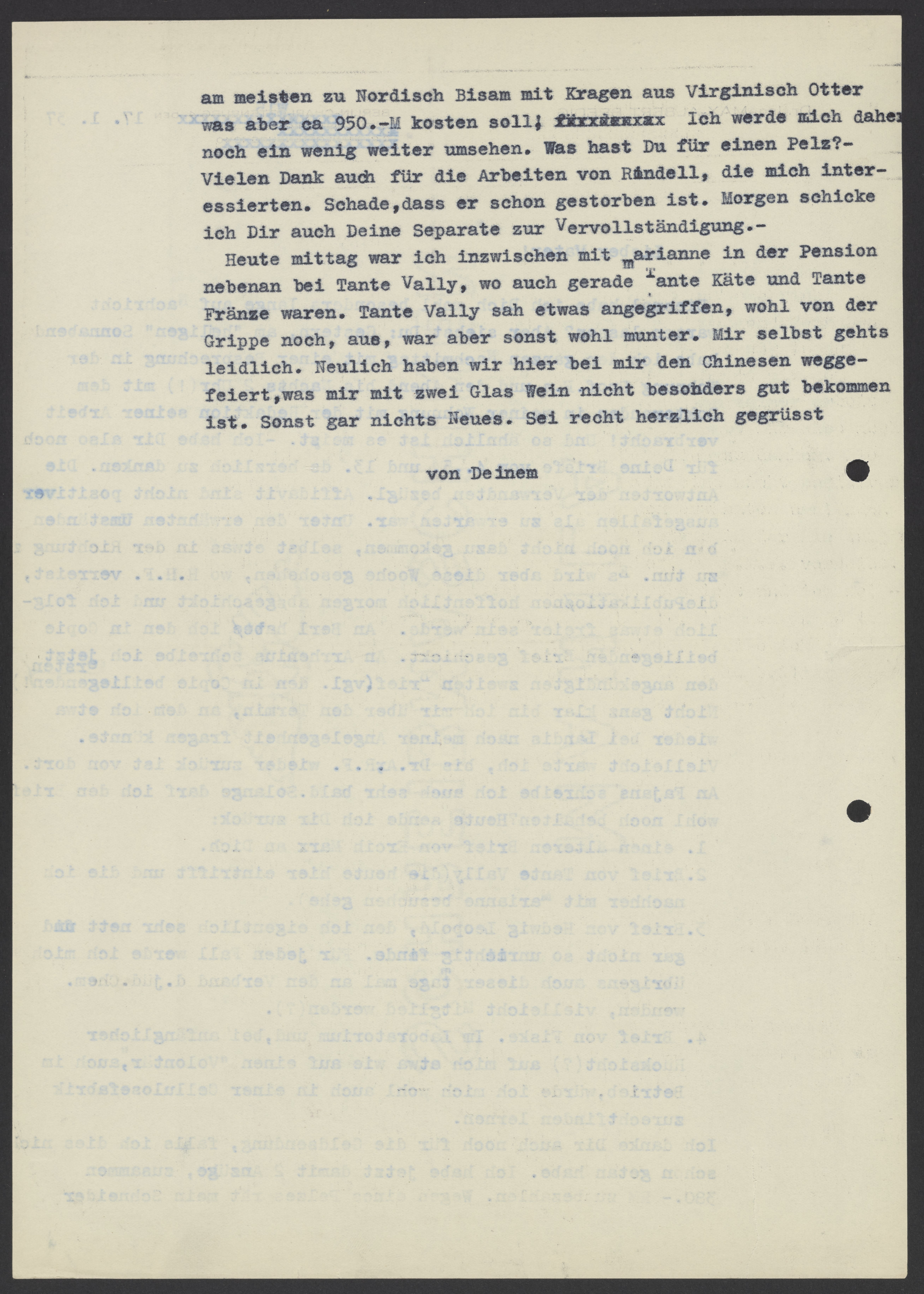 With regards to buying a fur coat, my tailor suggests Nordic muskrat with a collar made from Virginian Otter, which should cost 950 Reichsmarks. I will therefore keep looking. What kind of fur coat do you have? Thank you also for the sending the works by Rondell, which I found interesting. It's a shame that he passed away already. Tomorrow, I'll also send your finished reprints.