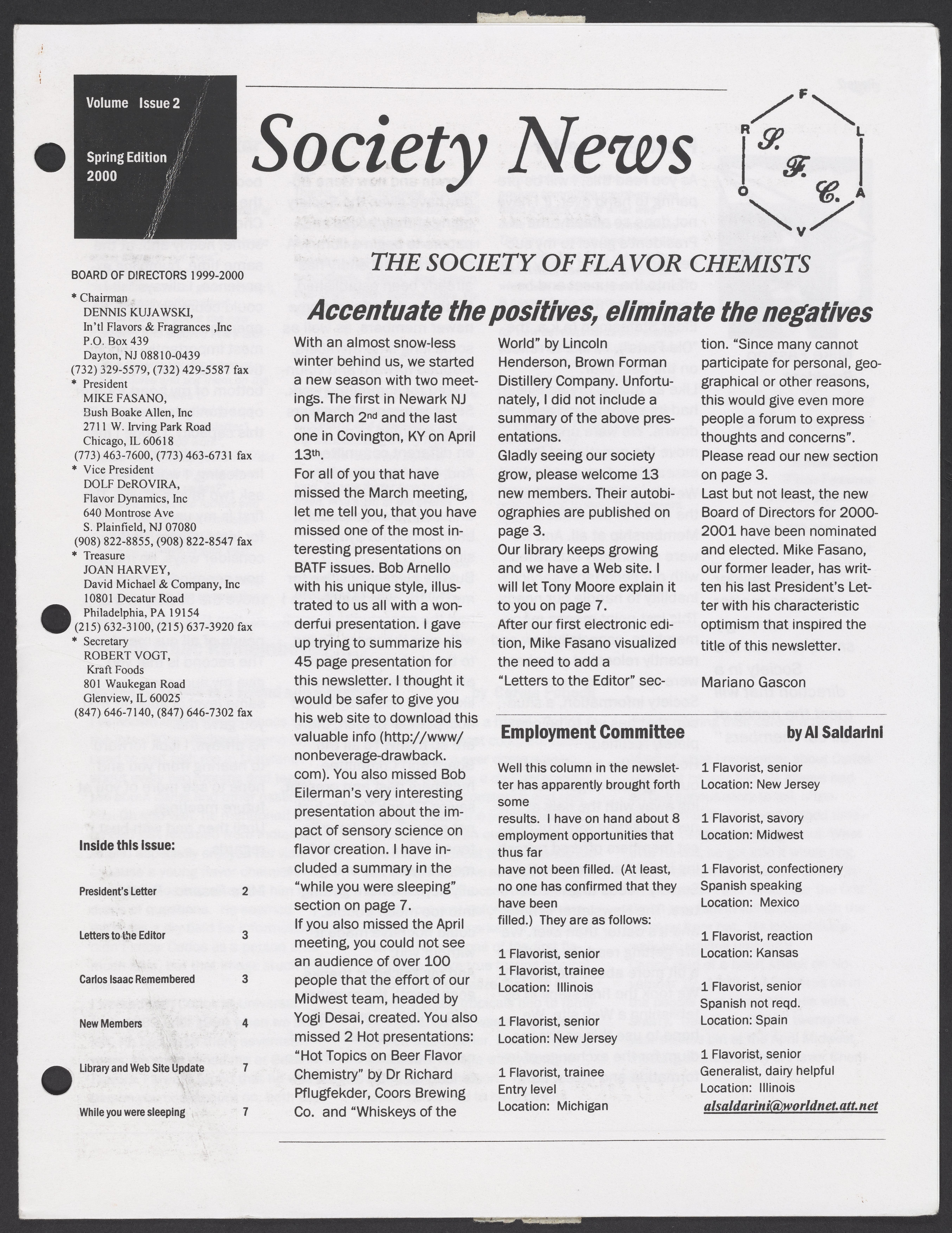 Society of Flavor Chemists. “Society News, Volume 3, Issue 2,” 2000. Society of Flavor Chemists, Society News, Box 1, Folder 2. Science History Institute. Philadelphia. https://digital.sciencehistory.org/works/2l3xz0k.