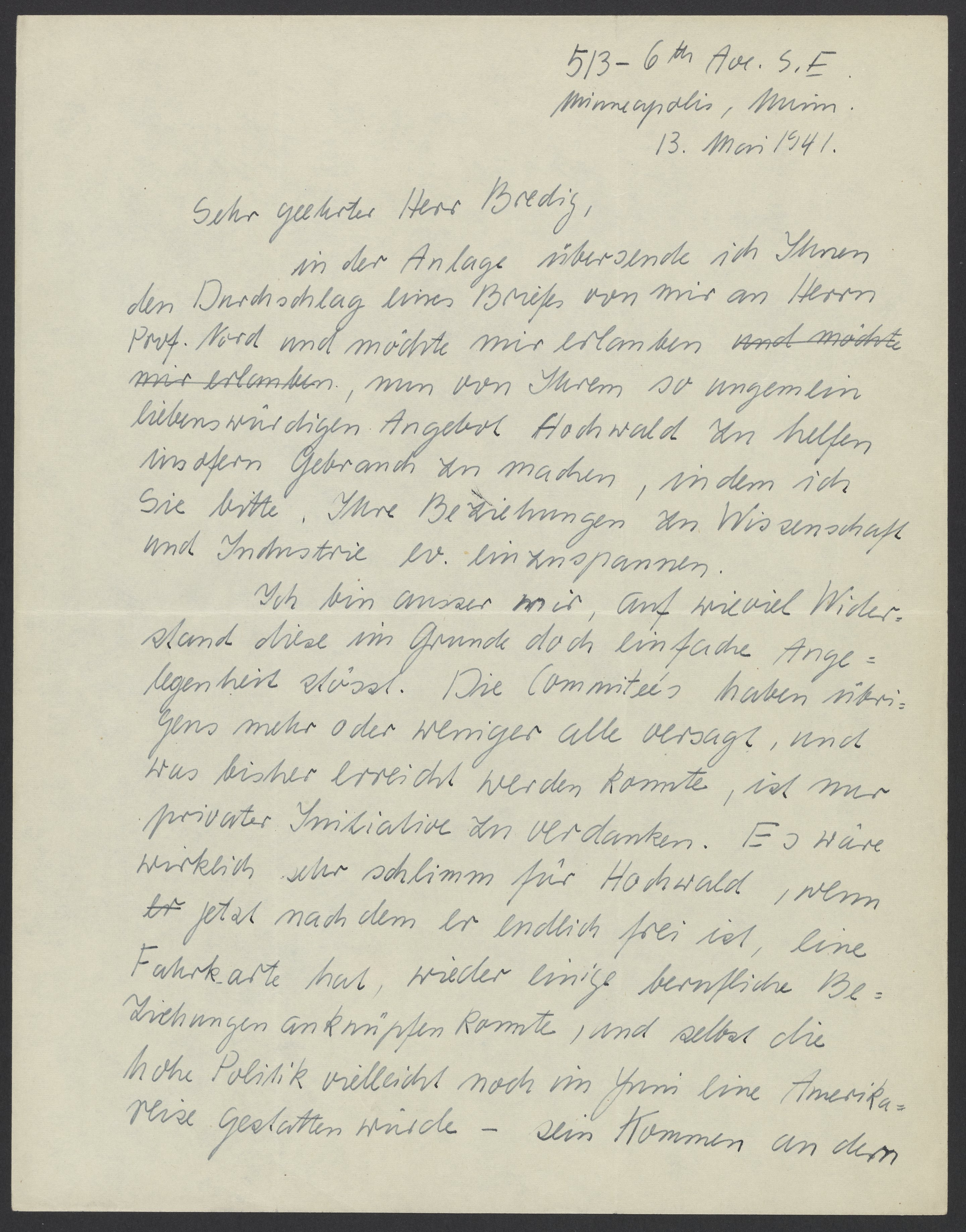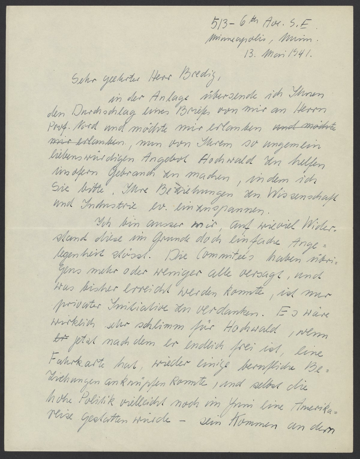 Ich bin ausser mir, auf wieviel Widerstand diese im Grunde doch einfache Angelegenheit stösst. Die Commiteés haben übrigens mehr oder weniger alle versagt, und was bisher erreicht werden konnte, ist nur privater Initiative zu verdanken. Es wäre wirklich sehr schlimm für Hochwald, wenn jetzt nachdem er endlich frei ist, eine Fahrkarte hat, wieder einige berufliche Beziehungen, anknüpfen konnte, und selbst die hohe Politik vielleicht noch im Juni eine Amerikareise gestatten würde – sein Kommen