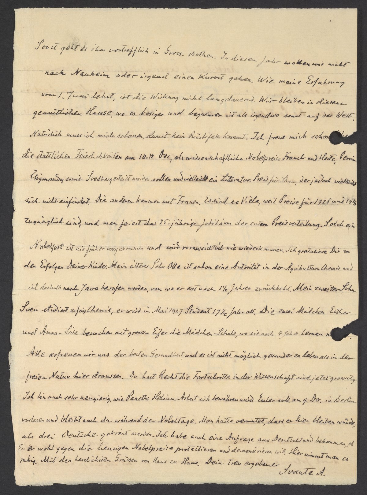 Sonst geht es ihm vortrefflich in Gross- Bothen. In diesem Jahr werden wir nicht nach Nauheim oder irgend einen Kurort gehen. Wie meine Erfahrung vom 1. Juni lehrt, ist die Wirkung nicht langdauernd. Wir bleiben in diesem gemütlichen Hause, wo es kosiger und bequemer ist als irgendwo sonst auf der Welt. Natürlich muss ich mich schonen, damit kein Rückfall kommt. Ich freue mich auf die stattlichen Feierlichkeiten am 10-12 Dec., als wissenschaftliche Nobelpreise Franck und Hertz, Perrin, Zsigmondy sowie Svedberg erteilt werden sollen und vielleicht ein Litteratur-Preis für Shaw, der jedoch vielleicht sich nicht einfindet. Die anderen kommen mit Frauen. Es sind so viele, weil Preise für 1925 und 1926 zugänglich sind, und man feiert das 25-jährige Jubiläum der ersten Preiserteilung. Solch ein Nobelfest ist nie früher vorgekommen und wird voraussichtlich nie wiederkommen. Ich gratuliere Dir zu den Erfolgen Deiner Kinder. Mein älterer Sohn Olle ist schon eine Autorität in der Agrikultur-Chemie und ist deshalb nach Java berufen worden, von wo er erst nach 1 ½ Jahren zurückkehrt. Mein zweiter Sohn Sven studiert eifrig Chemie, er wird im Mai 1927 Student 17 ½ Jahr alt. Die zwei Mädchen Esther und Anna-Lisa besuchen mit grossen Eifer die Mädchen-Schule, wie sie noch 4 Jahre lernen [werden]. Alle erfreuen wir uns der besten Gesundheit und es ist nicht möglich gesunder zu leben als in der freien Natur hier draussen. Du hast Recht die Fortschritte in der Wissenschaft sind jetzt grossartig. Ich bin auch sehr neugierig, wie Paneths Helium-Arbeit sich bewähren wird. Euler soll am 9. Dec. in Berlin vorlesen und bleibt auch da während der Nobeltage. Man hatte vermutet, dass er hier bleiben würde, als drei Deutsche gekrönt werden. Ich habe auch eine Anfrage aus Deutschland bekommen ob Euler wohl gegen die heutigen Nobelpreise protestieren und demonstrieren will. Hier nimmt man es ruhig. Mit den herzlichsten Grüssen von Haus zu Haus. Dein treu ergebener Svante A.