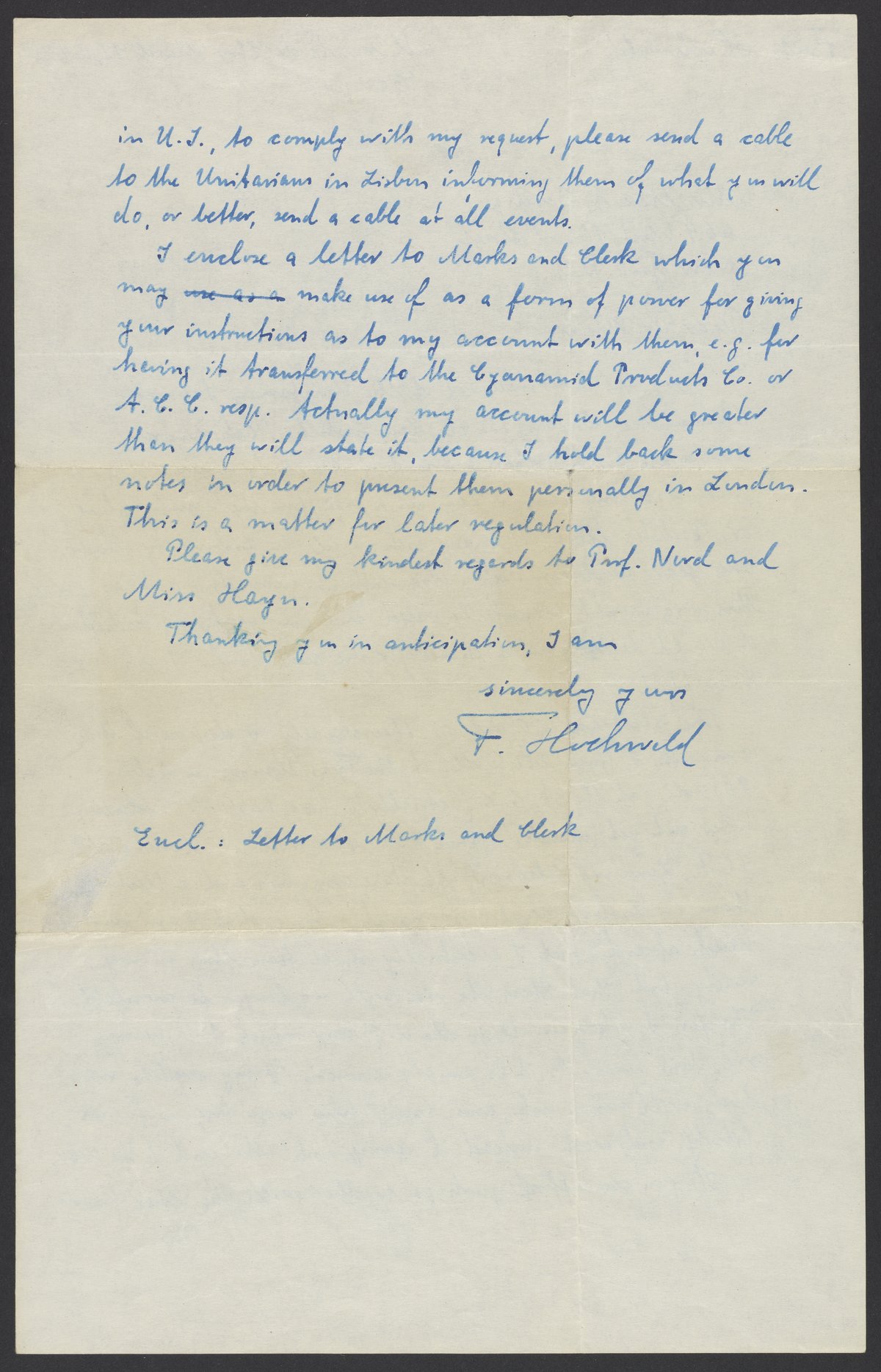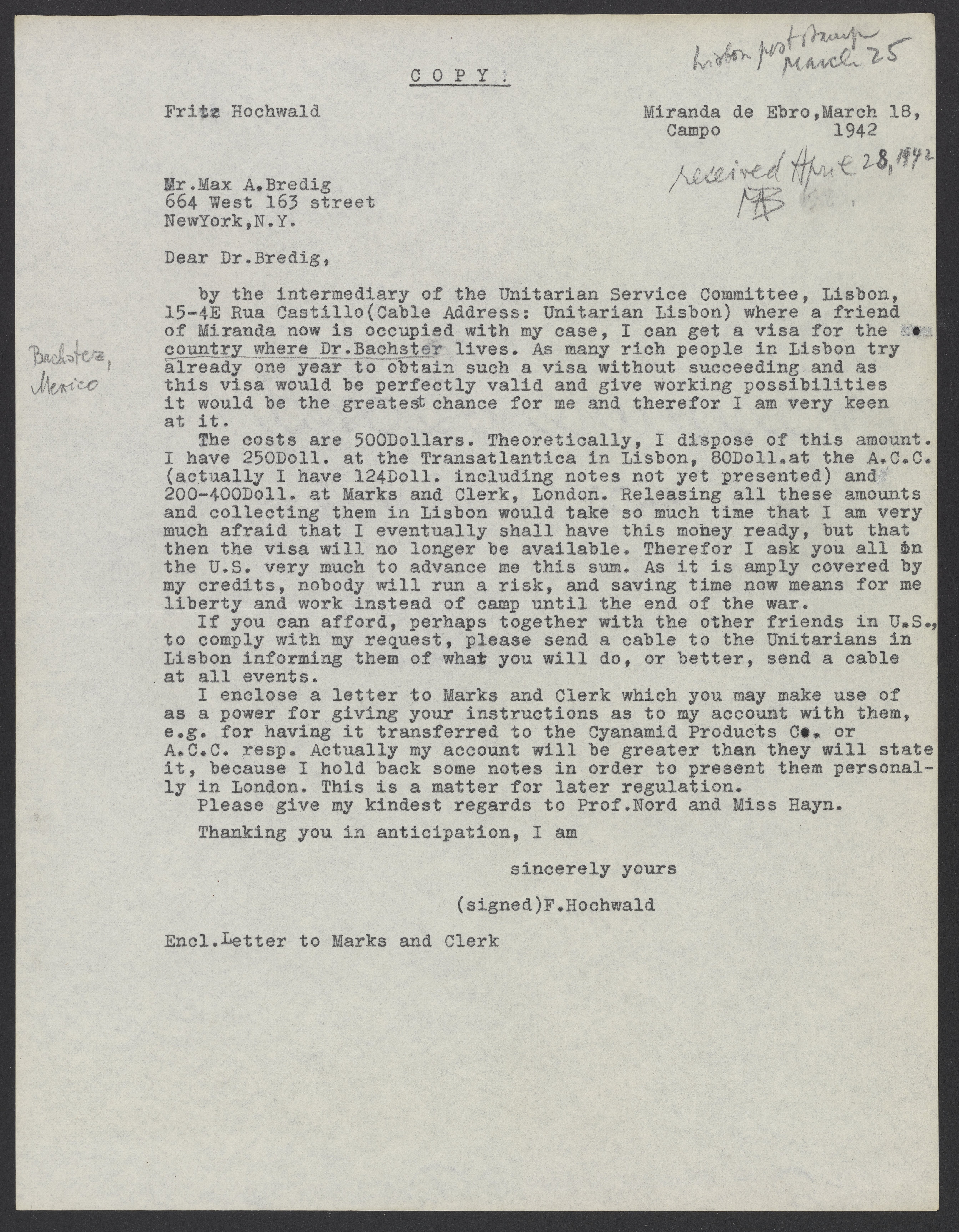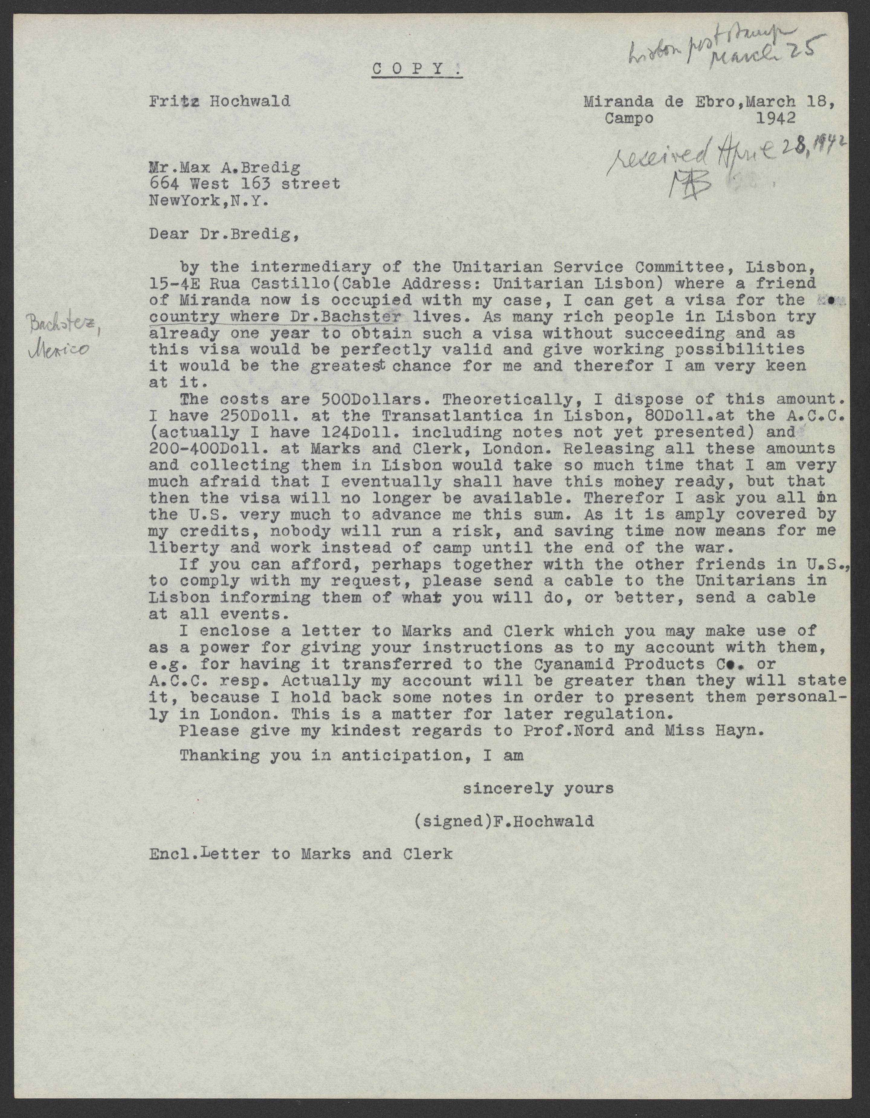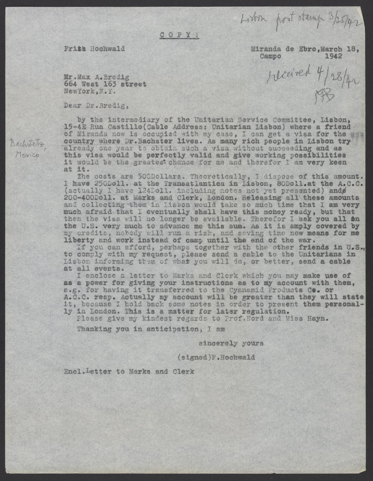Letter from Fritz Hochwald to Max Bredig, March 18, 1942