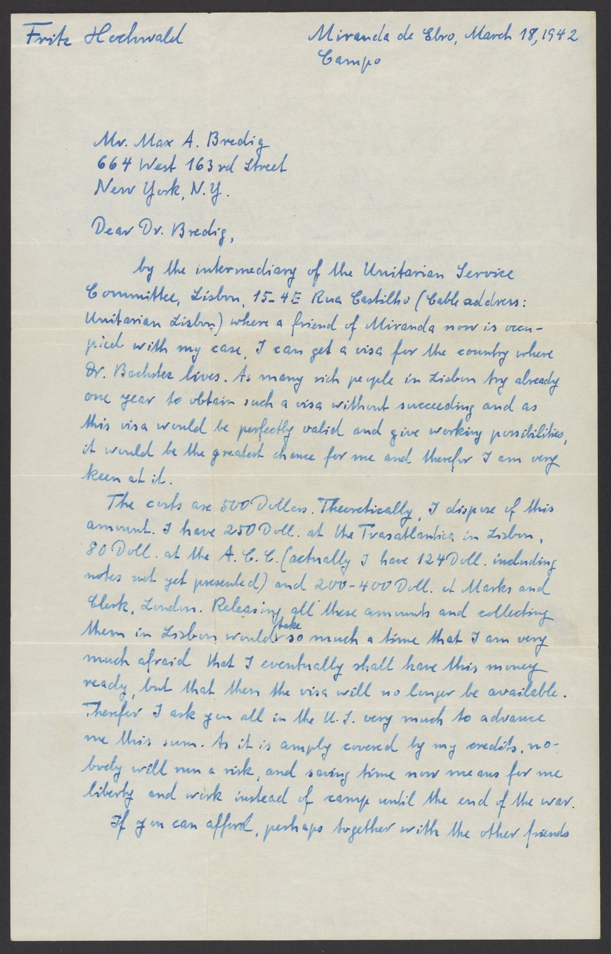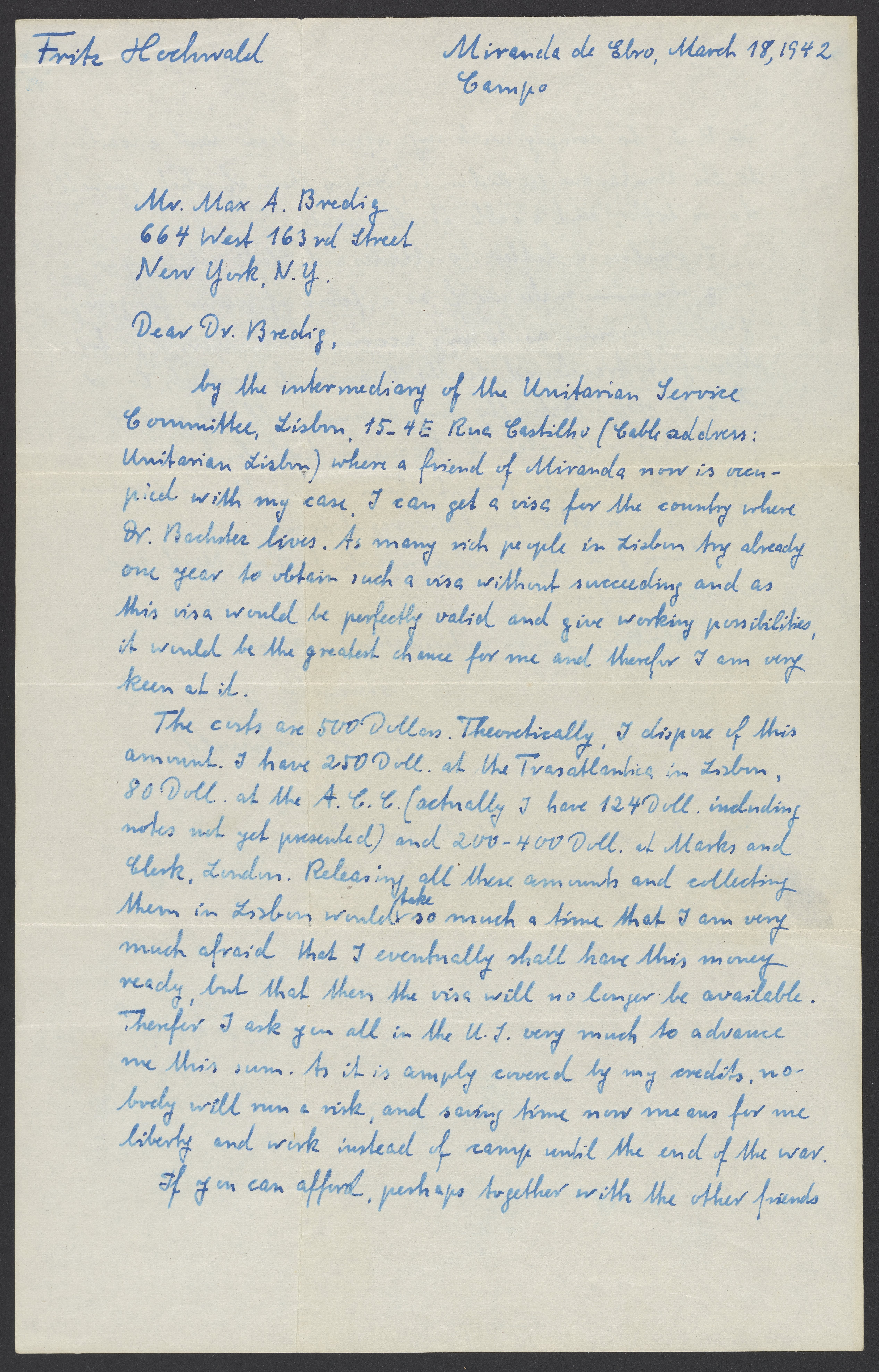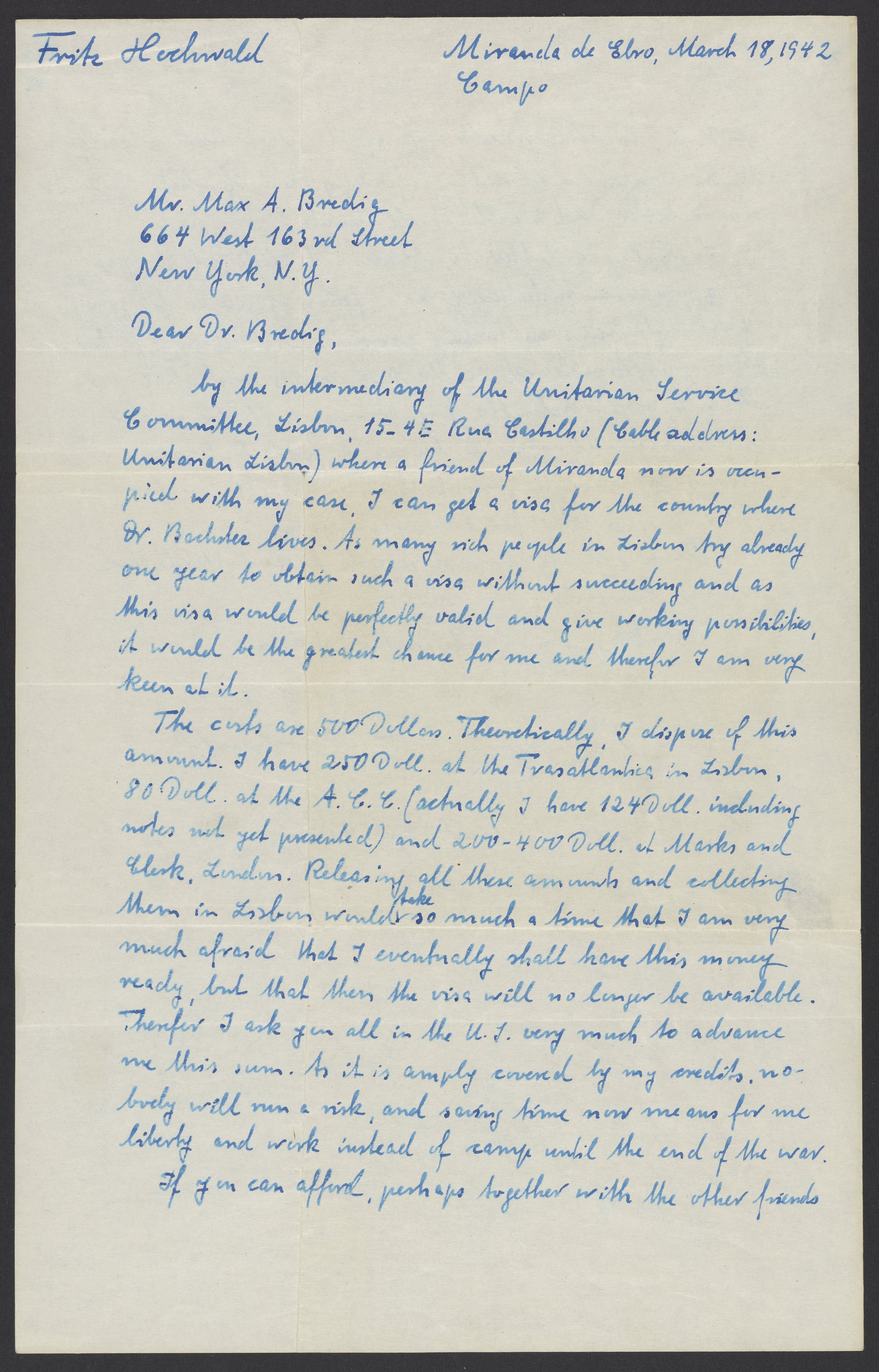 Small JPG1200 x 1873px — 352 KBLarge JPG2880 x 4494px — 2.0 MBFull-sized JPG5066 x 7905px — 6.1 MBOriginal fileTIFF — 5066 x 7905px — 115 MBFritz Hochwald (1897-1968) writes to Max Bredig (1902-1977) from the Miranda de Ebro concentration camp in Spain. He discusses his plans to attempt to obtain a visa for immigration in Lisbon, Portugal. He lists the costs associated with his plan and requests financial assistance from Bredig and other friends in the United States.