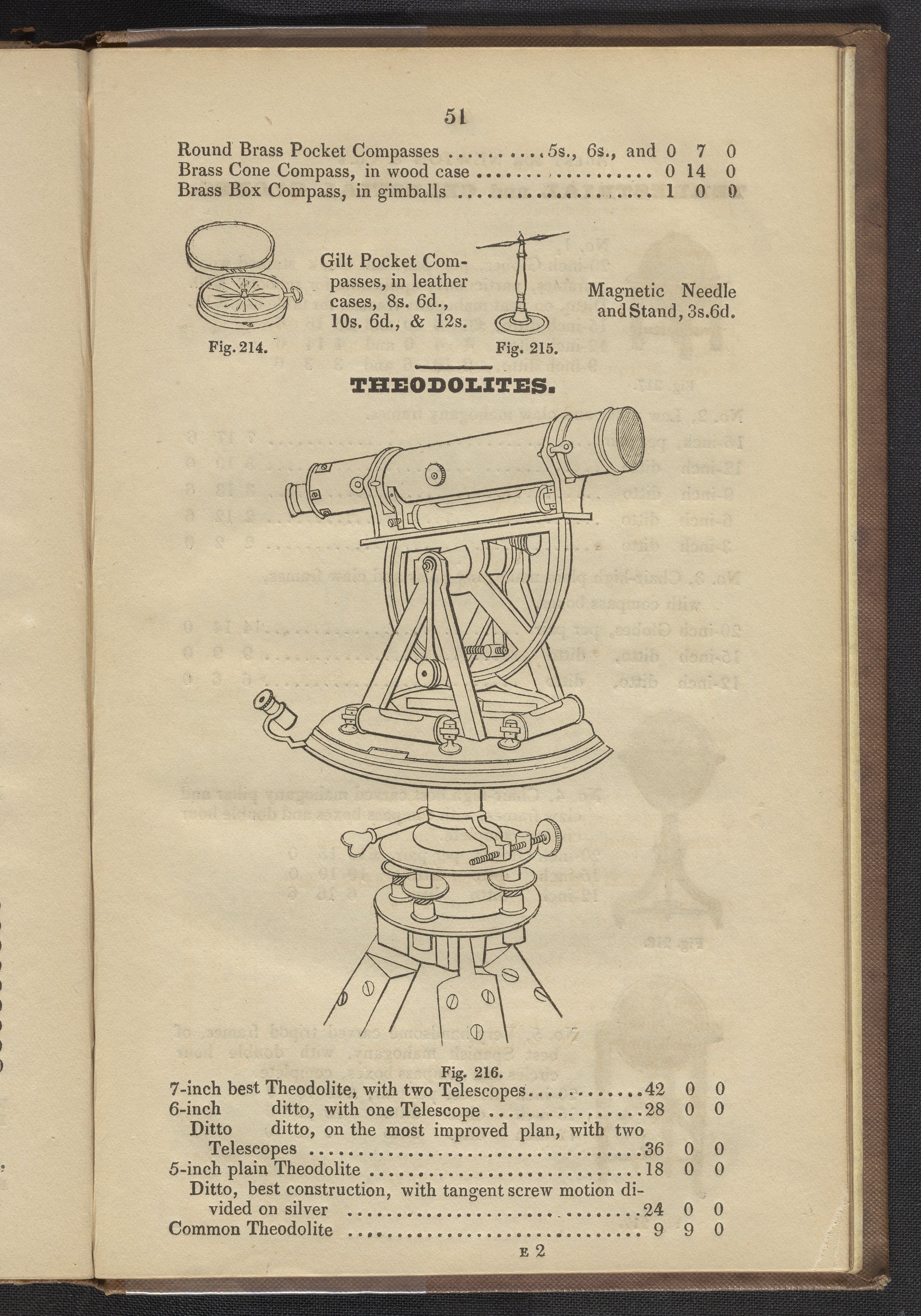 Palmer, Edward. “Figures 214-216. Compasses and Theodolites.” In Palmer's New Catalogue, with Three Hundred Engravings of Apparatus, Illustrative of Chemistry, Pneumatics, Frictional and Voltaic Electricity, Electro Magnetism, Optics, &c. London, England: William Gilbert, 1840. https://digital.sciencehistory.org/works/2mokeur.