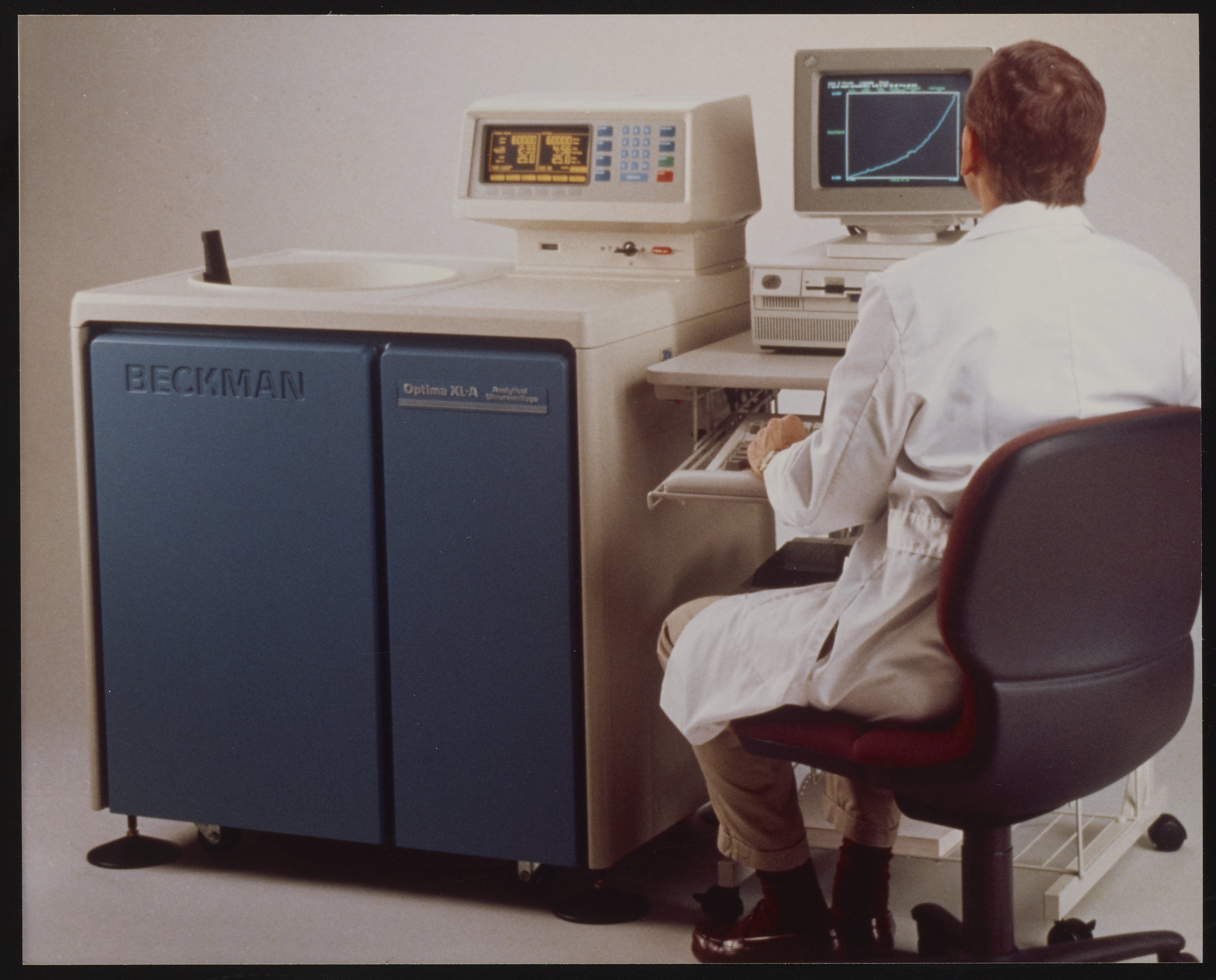 “Man Using a Computer Connected to a Beckman Optima XL-A Analytical Centrifuge,” 1990–1999. Beckman Historical Collection, Box 59, Folder 64. Science History Institute. Philadelphia. https://digital.sciencehistory.org/works/2n49t1699.