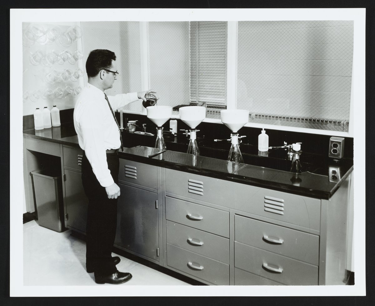 View of chemist Dr. James F. Feeman filtering a dye slurry into a filter sink at the Crompton & Knowles Research Center in Gibraltar, Pennsylvania. The sink, made entirely of polyethylene, prevented the breakage of expensive flasks and porcelain filters widely used in dye research.