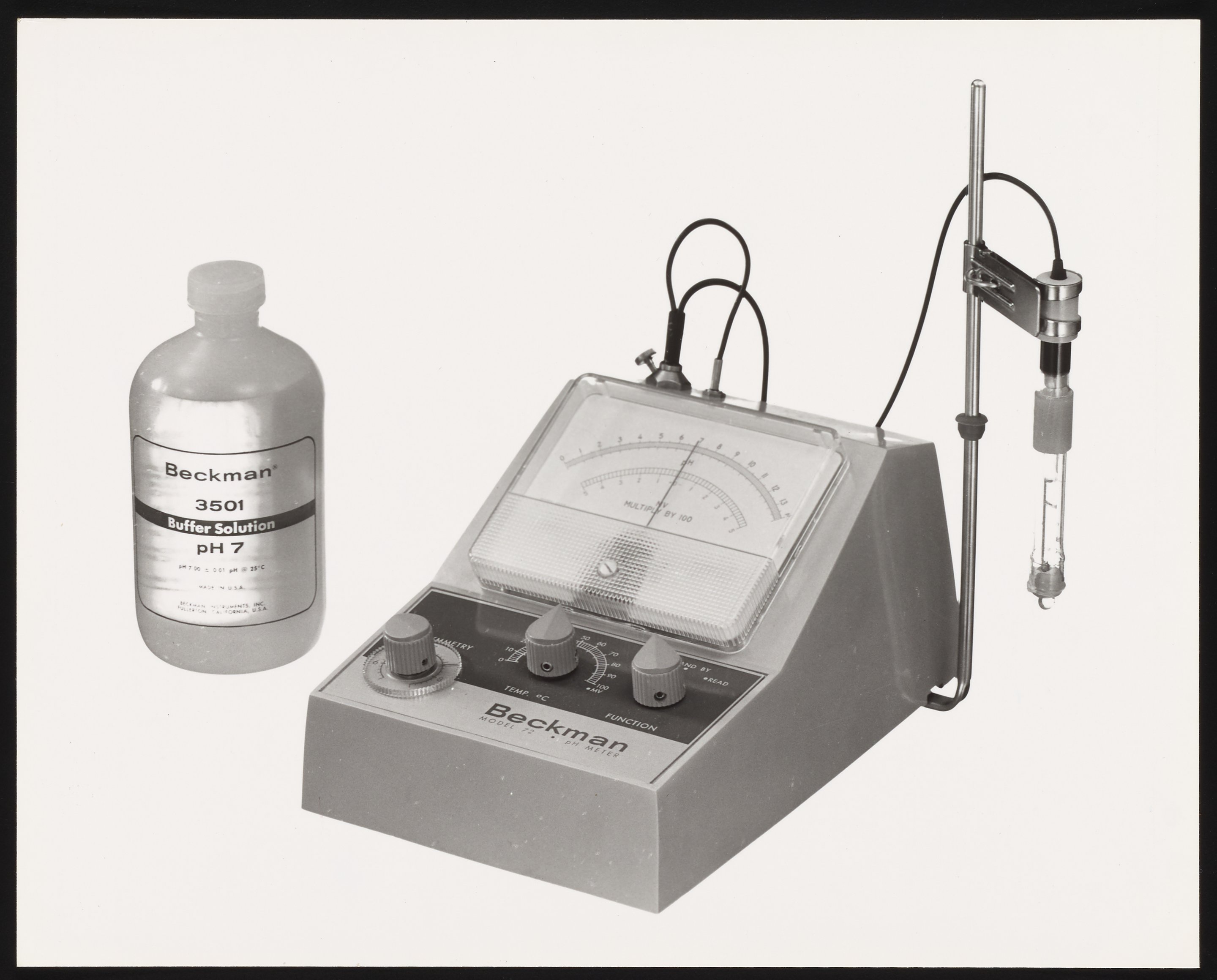 “Beckman Model 72 PH Meter with Buffer Solution,” circa 1960. Beckman Historical Collection, Box 55, Folder 69. Science History Institute. Philadelphia. https://digital.sciencehistory.org/works/2n49t1770.
