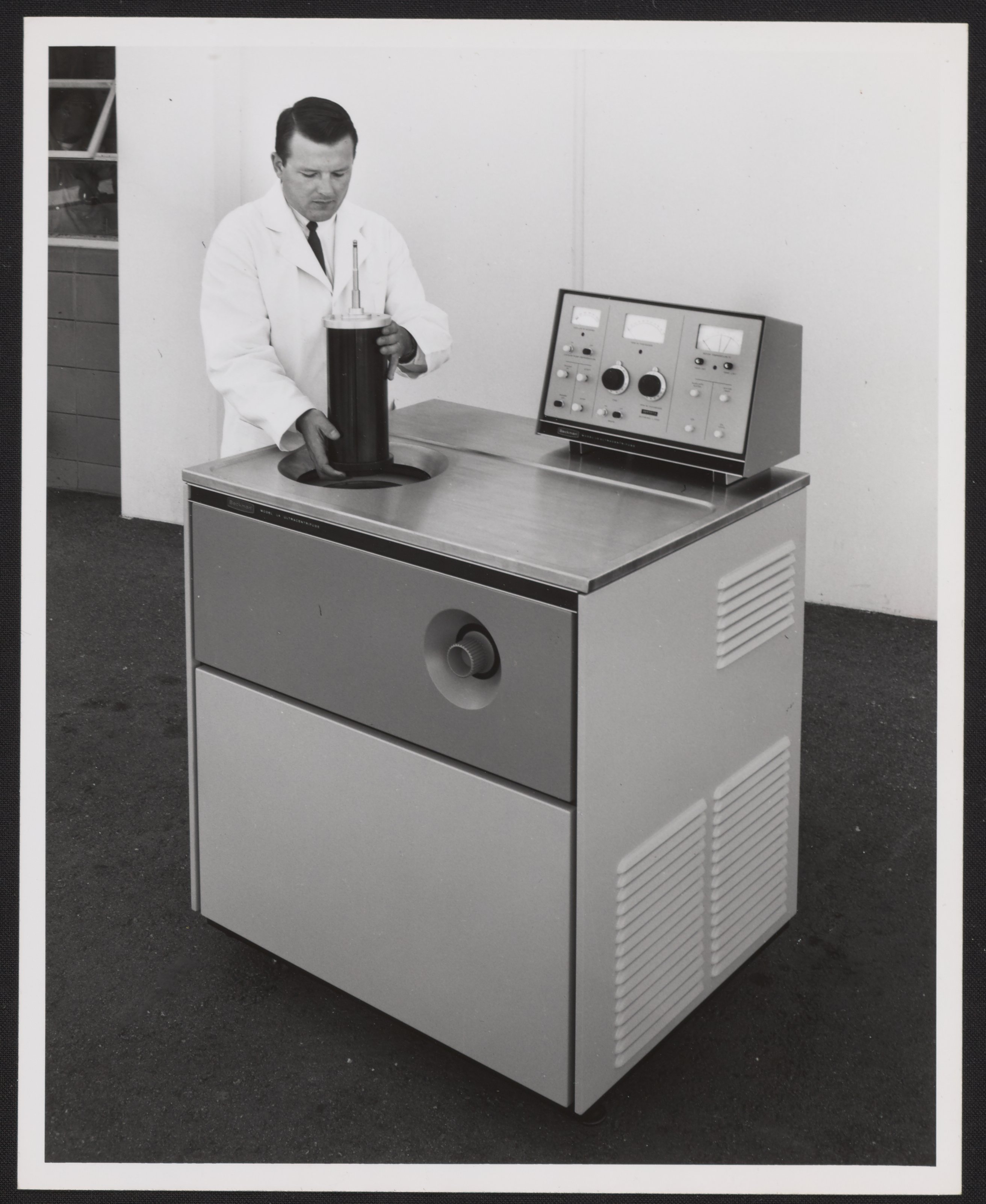 “Man Loading a Beckman Model L4 Ultracentrifuge,” n.d. Beckman Historical Collection, Box 55, Folder 189. Science History Institute. Philadelphia. https://digital.sciencehistory.org/works/2n49t1809.