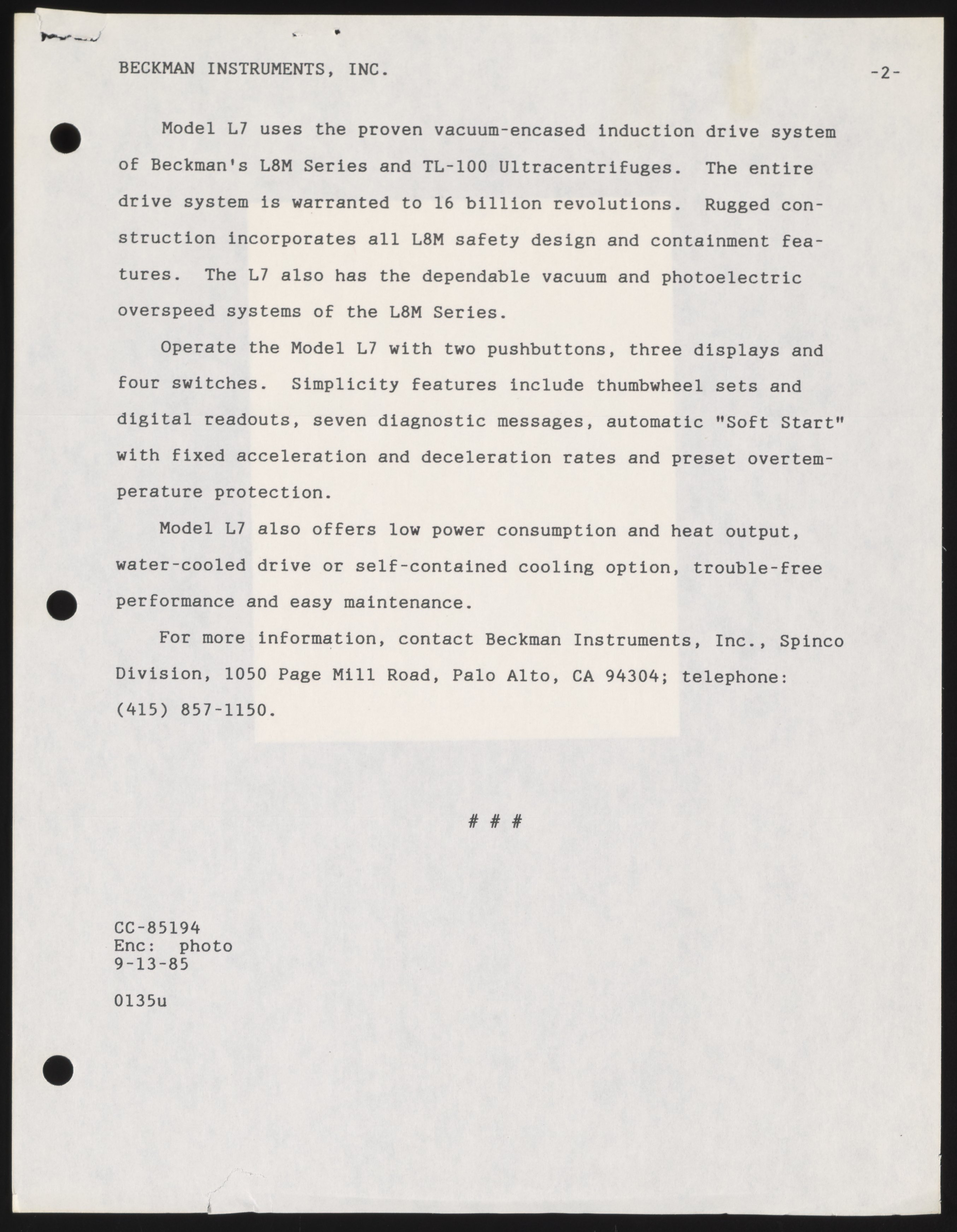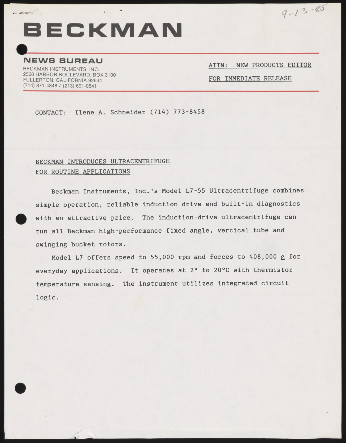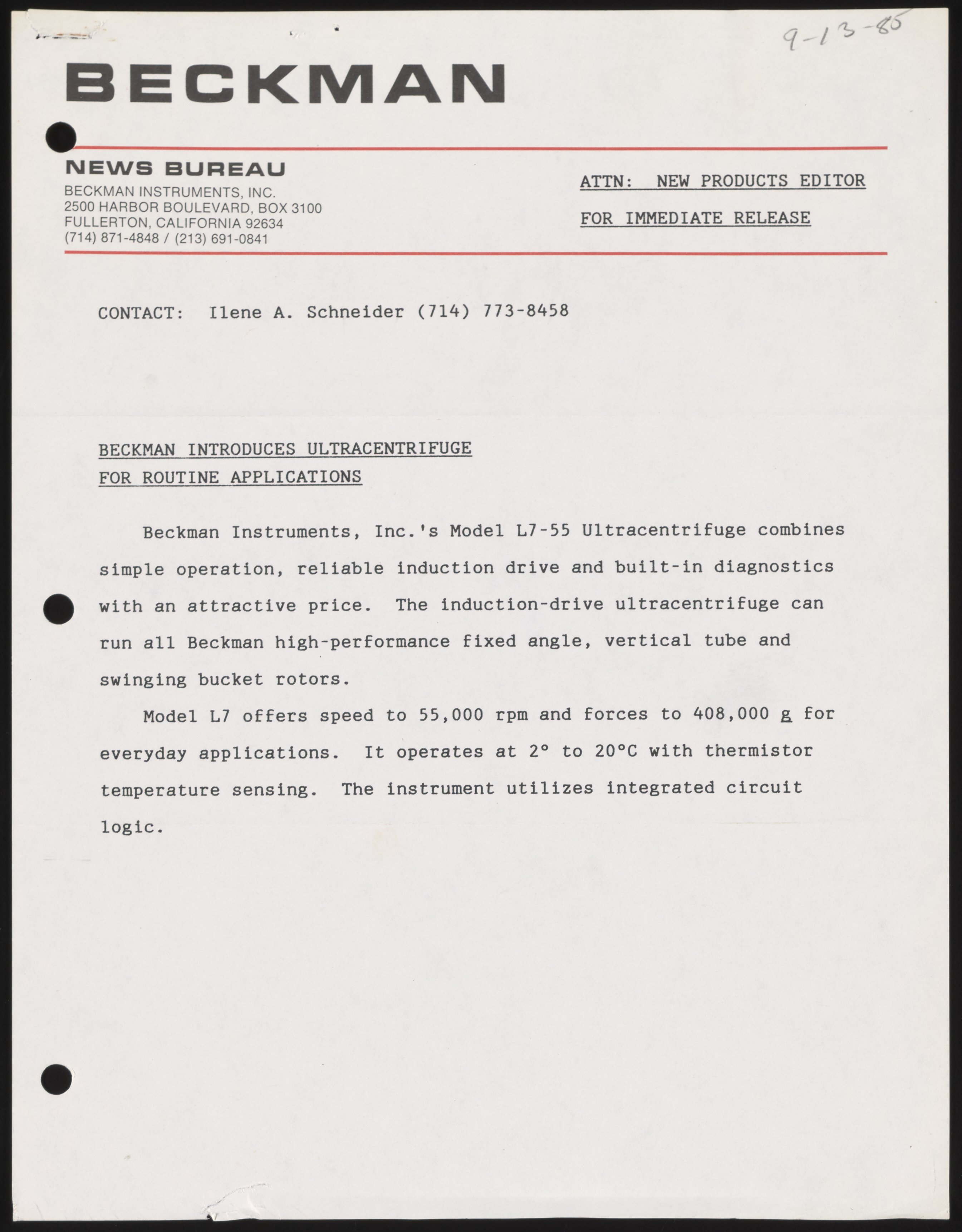 Schneider, Ilene. “Beckman Introduces Ultracentrifuge for Routine Applications,” September 13, 1985. Beckman Historical Collection, Box 58, Folder 70. Science History Institute. Philadelphia. https://digital.sciencehistory.org/works/2n49t226q.