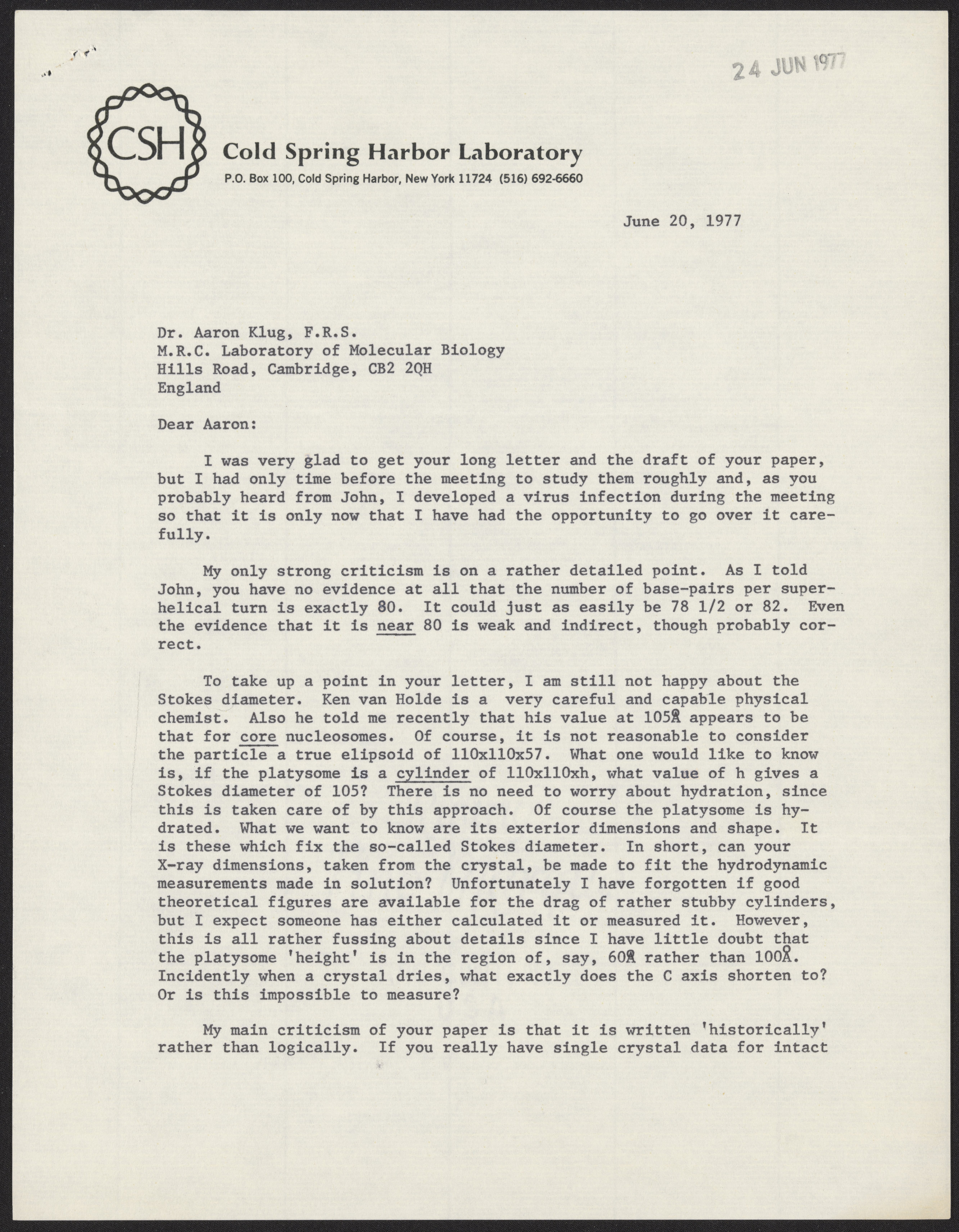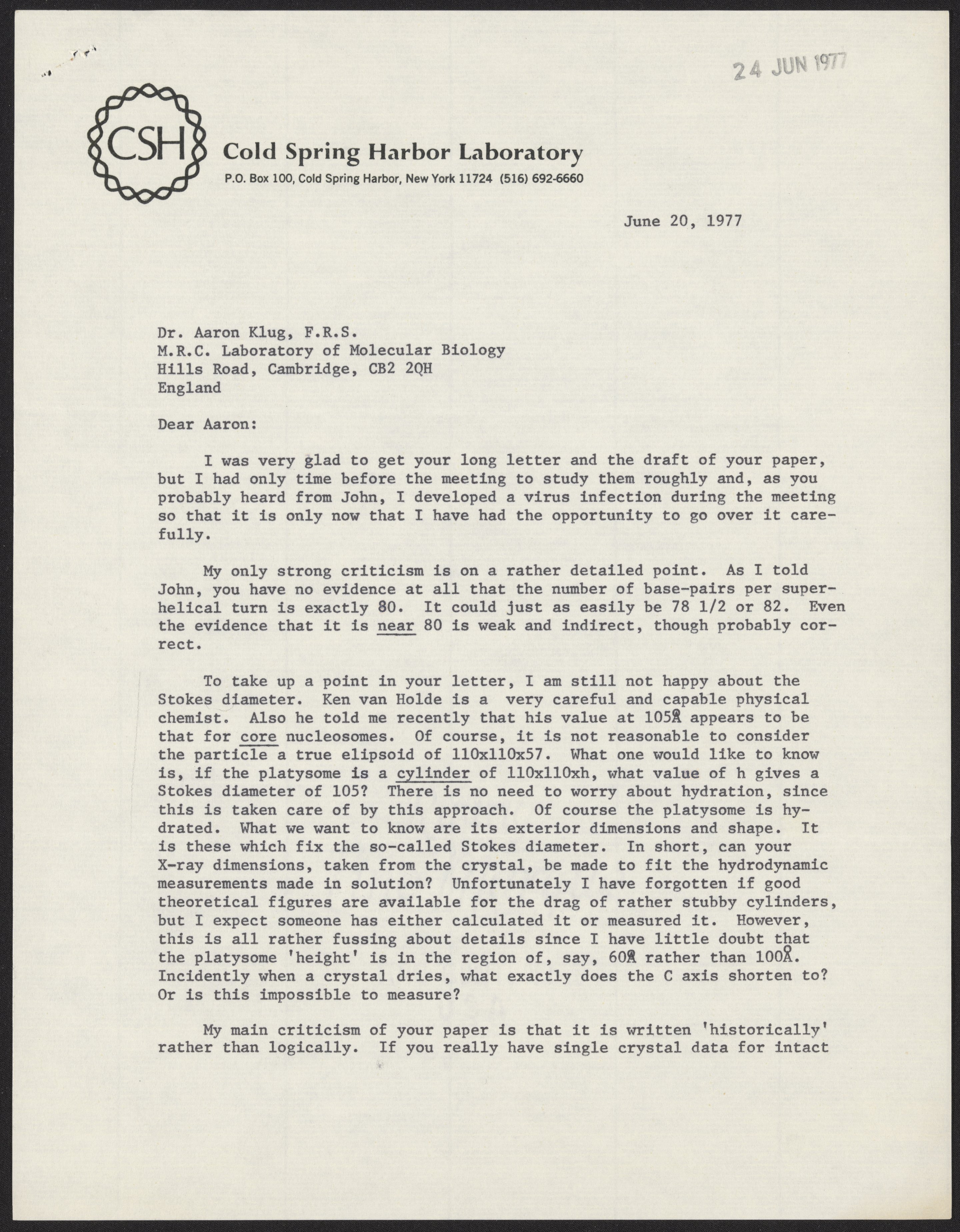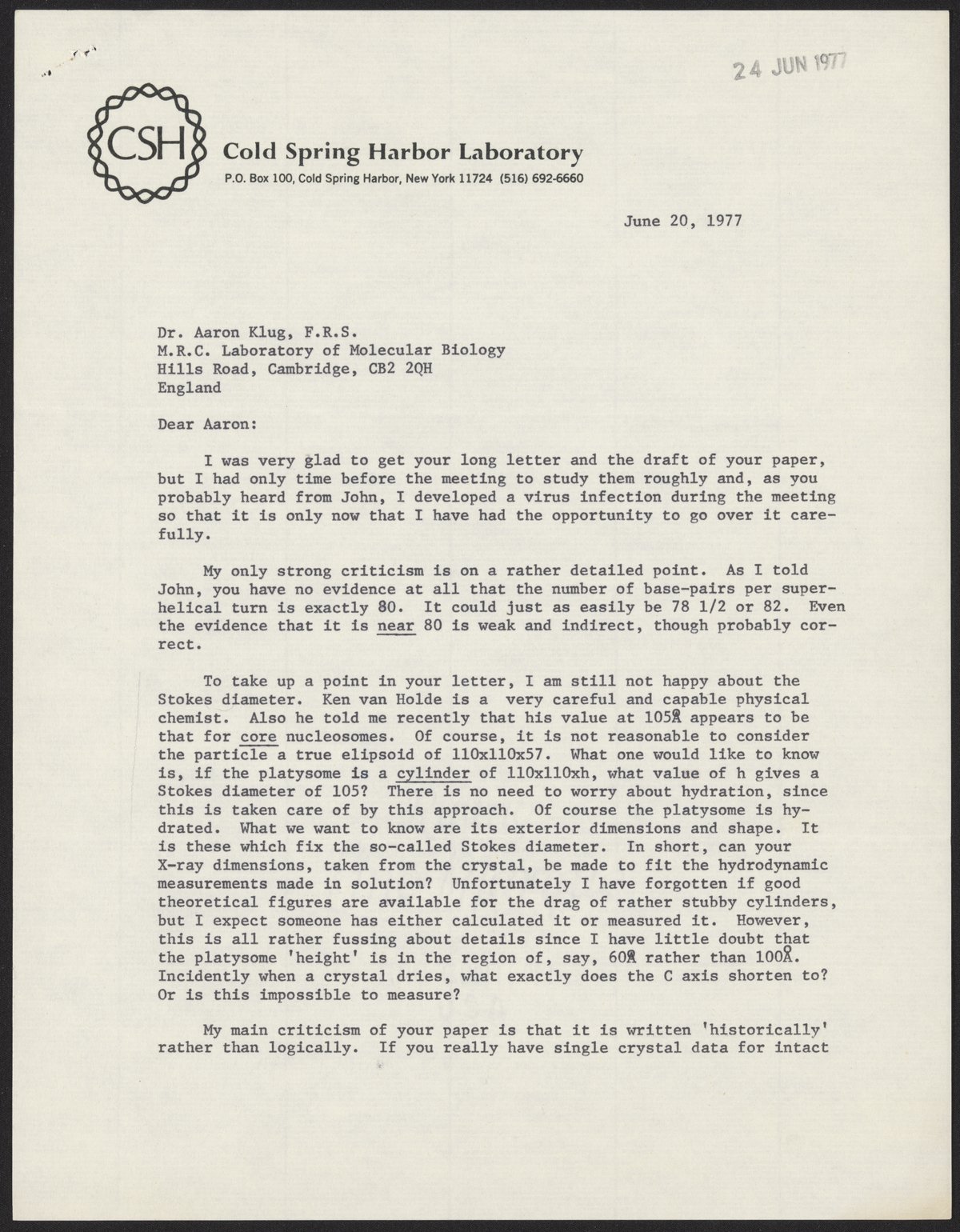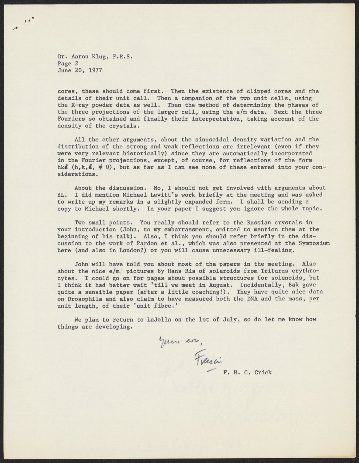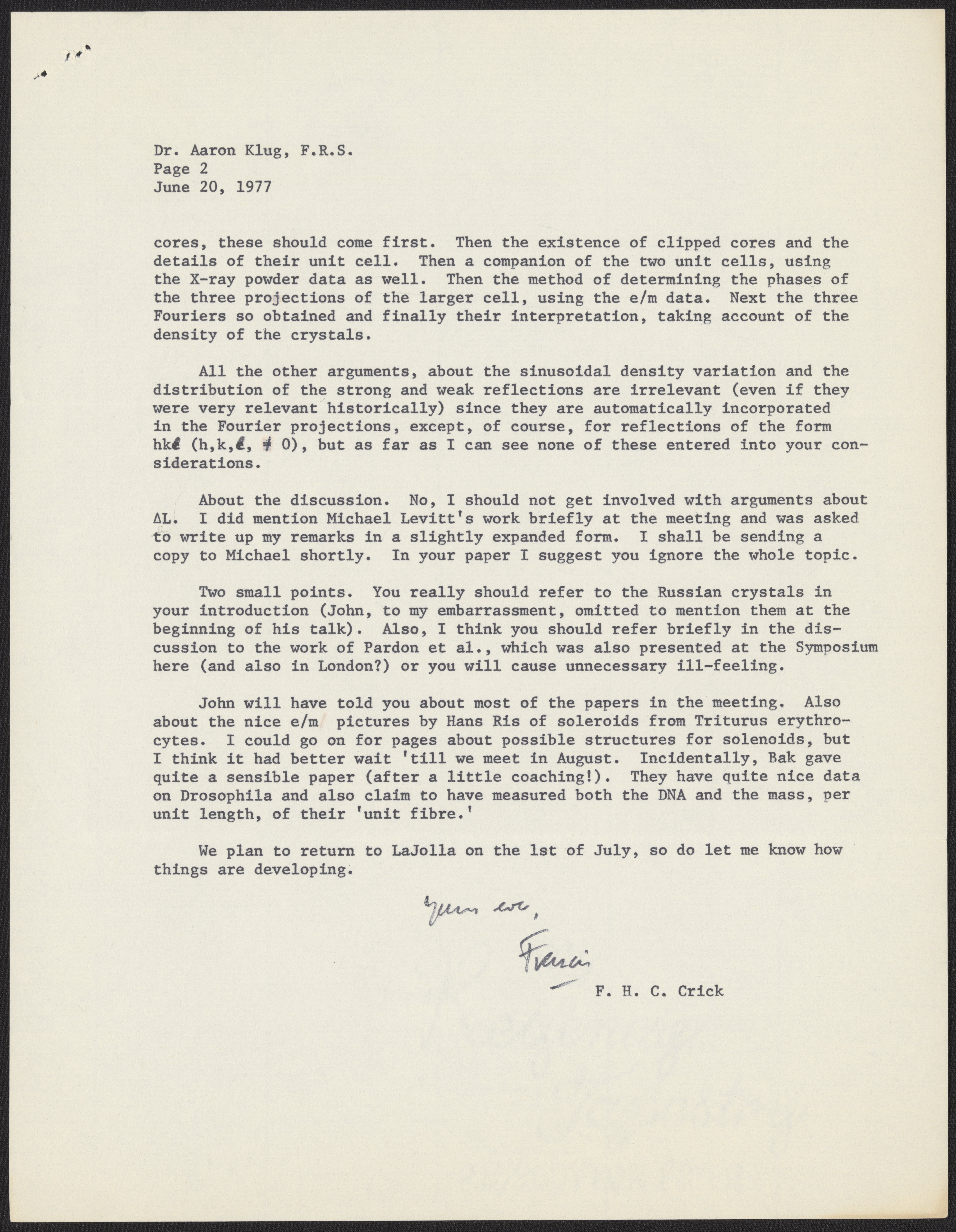 Crick, Francis. “Letter from Francis Crick to Aaron Klug, June 20, 1977,” 1977. History of Molecular Biology Collection, Box 20, Folder 1. Science History Institute. Philadelphia. https://digital.sciencehistory.org/works/2ot5r1a.