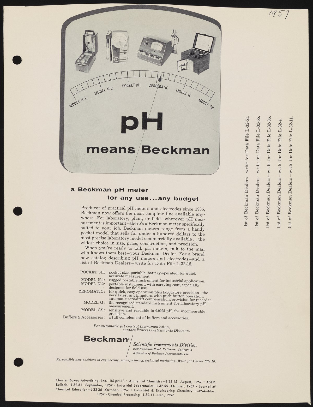 Beckman Instruments, Inc., and Charles Bowes Advertising. “PH Means Beckman,” 1957. Beckman Historical Collection, Box 49, Folder 14. Science History Institute. Philadelphia. https://digital.sciencehistory.org/works/2r36tx526.
