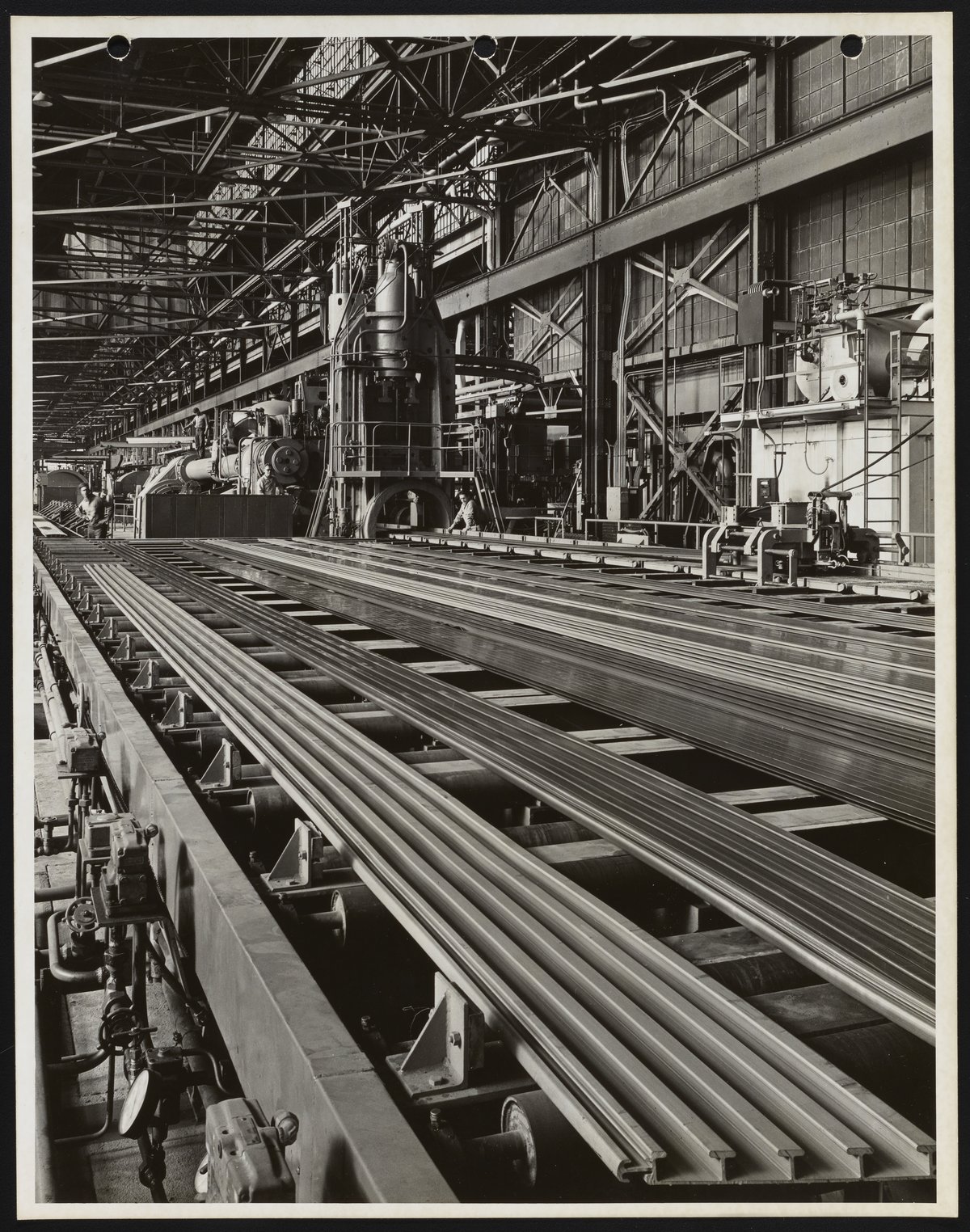 General view of a section of the magnesium rolling mill at the Dow Chemical Company facilities located in Madison, Illinois. Dedicated in 1954, the magnesium fabrication plant in Madison was the world's first facility designed for the mass production of magnesium mill products and boasted the first large-scale magnesium sheet mill, as well as the largest extrusion facilities for the metal.