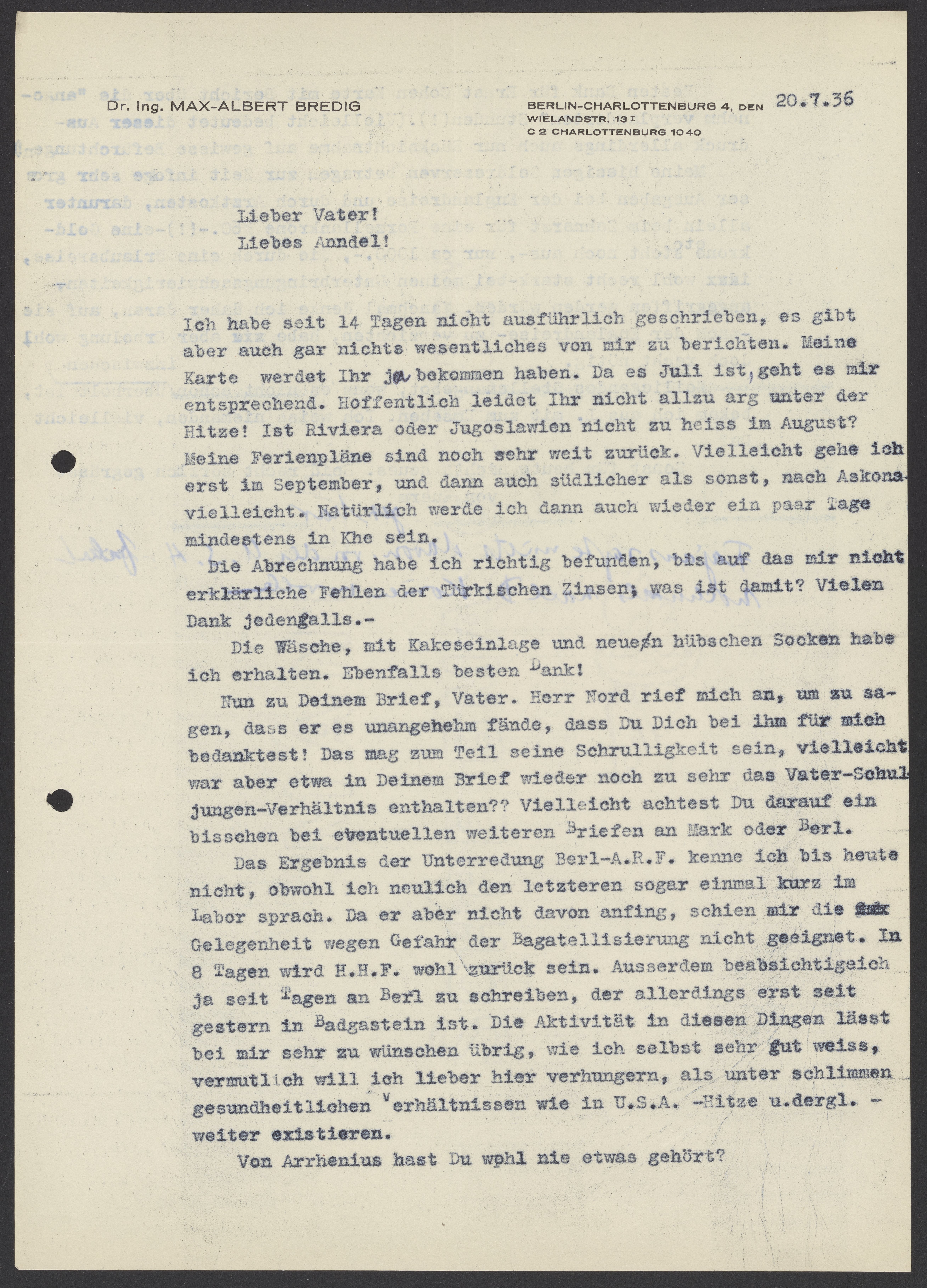 Letter from Max Bredig to Georg Bredig, July 20, 1936