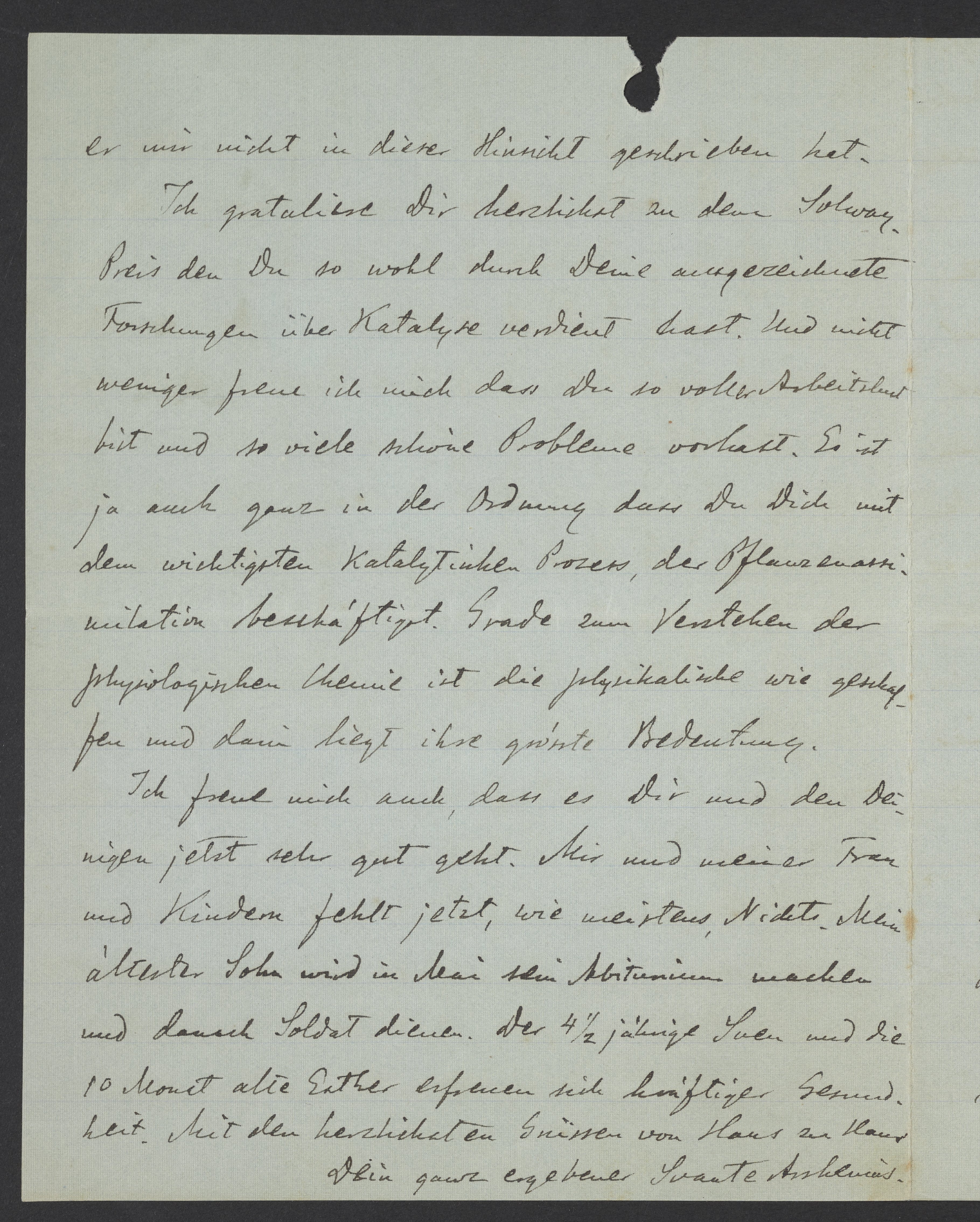Letter from Svante Arrhenius to Georg Bredig, April 1914