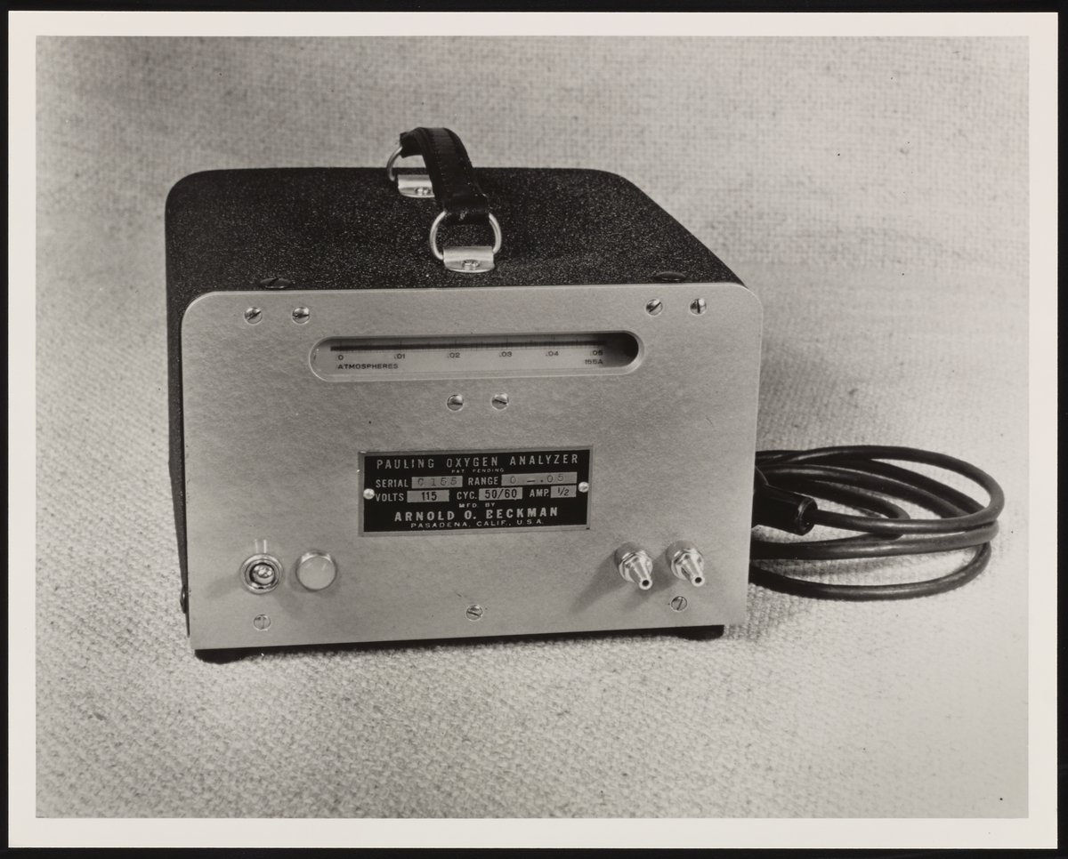 Small JPG1200 x 966px — 174 KBLarge JPG2880 x 2318px — 687 KBFull-sized JPG3158 x 2542px — 791 KBOriginal fileTIFF — 3158 x 2542px — 23.0 MBDeveloped from a Linus Pauling design during WWII, the technology behind Beckman Instruments’ oxygen analyzers ended up doing such diverse jobs as monitoring astronauts’ respiration, maintaining packaged food safety, and preventing blindness in newborn babies.