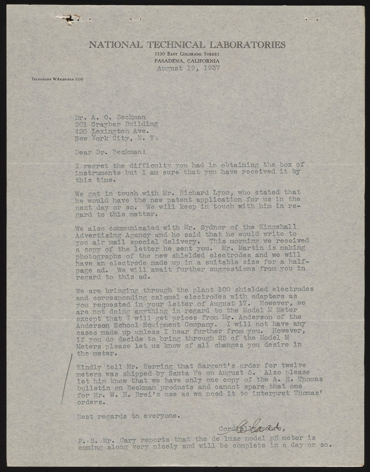 Evans, Clare. “Letter from Clare Evans to Arnold O. Beckman,” August 19, 1937. Beckman Historical Collection, Box 14, Folder 9. Science History Institute. Philadelphia. https://digital.sciencehistory.org/works/2v23vt39w.