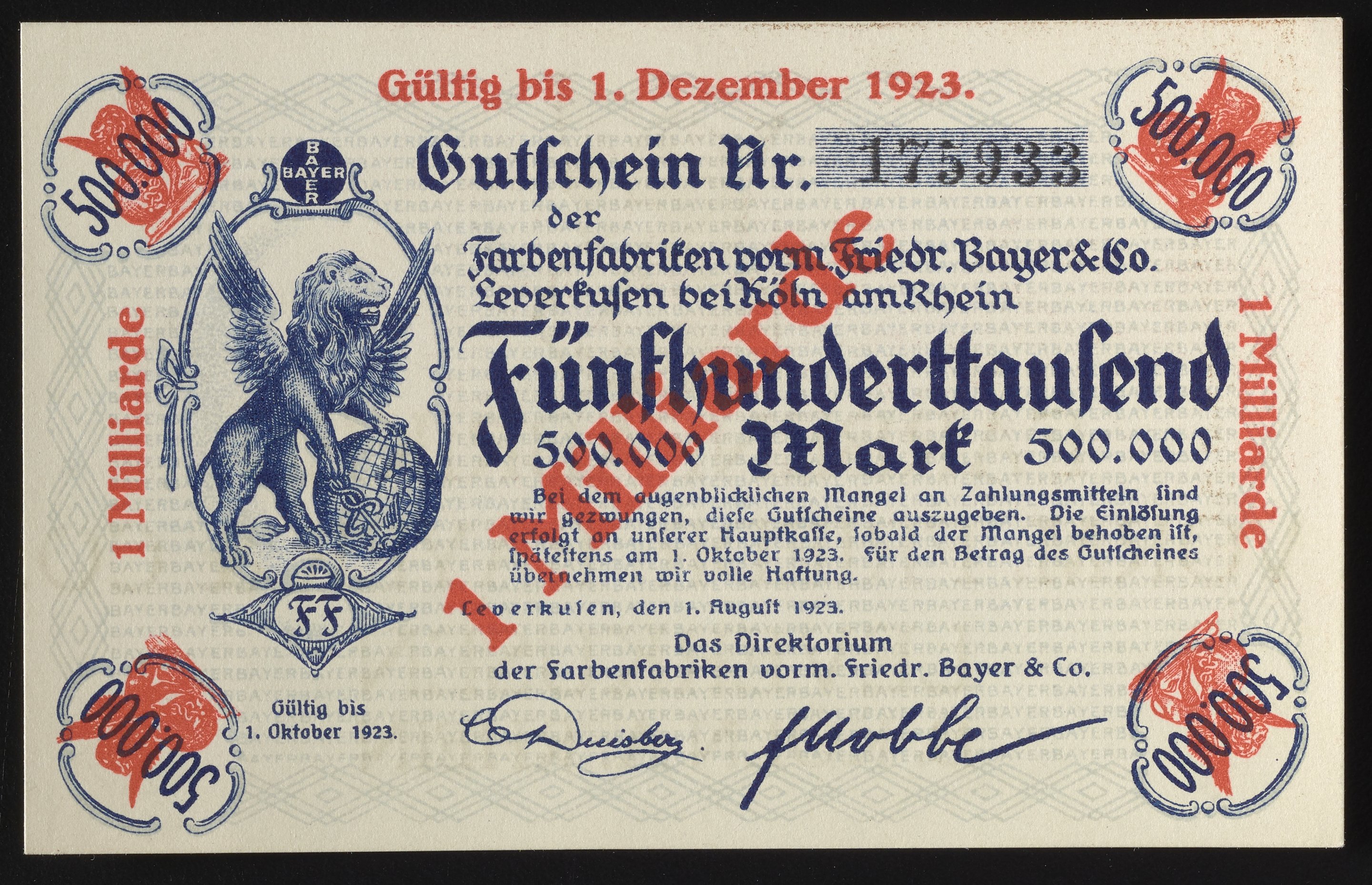 Small JPG1200 x 774px — 267 KBLarge JPG2880 x 1857px — 1.2 MBFull-sized JPG3108 x 2004px — 1.3 MBOriginal fileTIFF — 3108 x 2004px — 17.9 MBThis Fünf Millionen Mark Gutschein, or five million Mark voucher, was issued by Friedrich Bayer & Company. Design includes a cartouche containing a winged lion with caduceus and globe as well as the Bayer logo. By the end of August 1923, inflation was so high that billion Mark notes were issued by printing over the August 1st note.