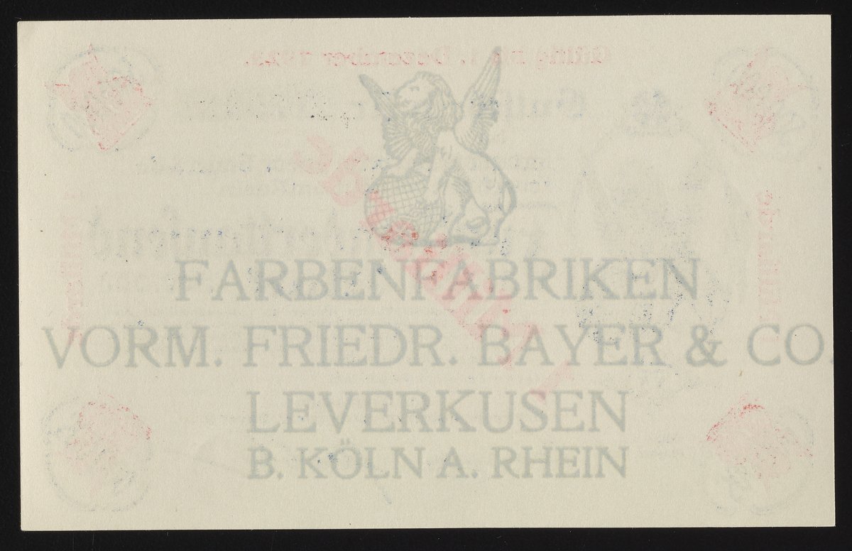 “Friedrich Bayer & Company One Milliarde/Fünfhunderttausend Mark Gutschein.” Leverkusen, Germany: Friedrich Bayer & Co., August 1, 1923. Robert J. Bauman collection. Science History Institute. Philadelphia. https://digital.sciencehistory.org/works/2v23vv368.