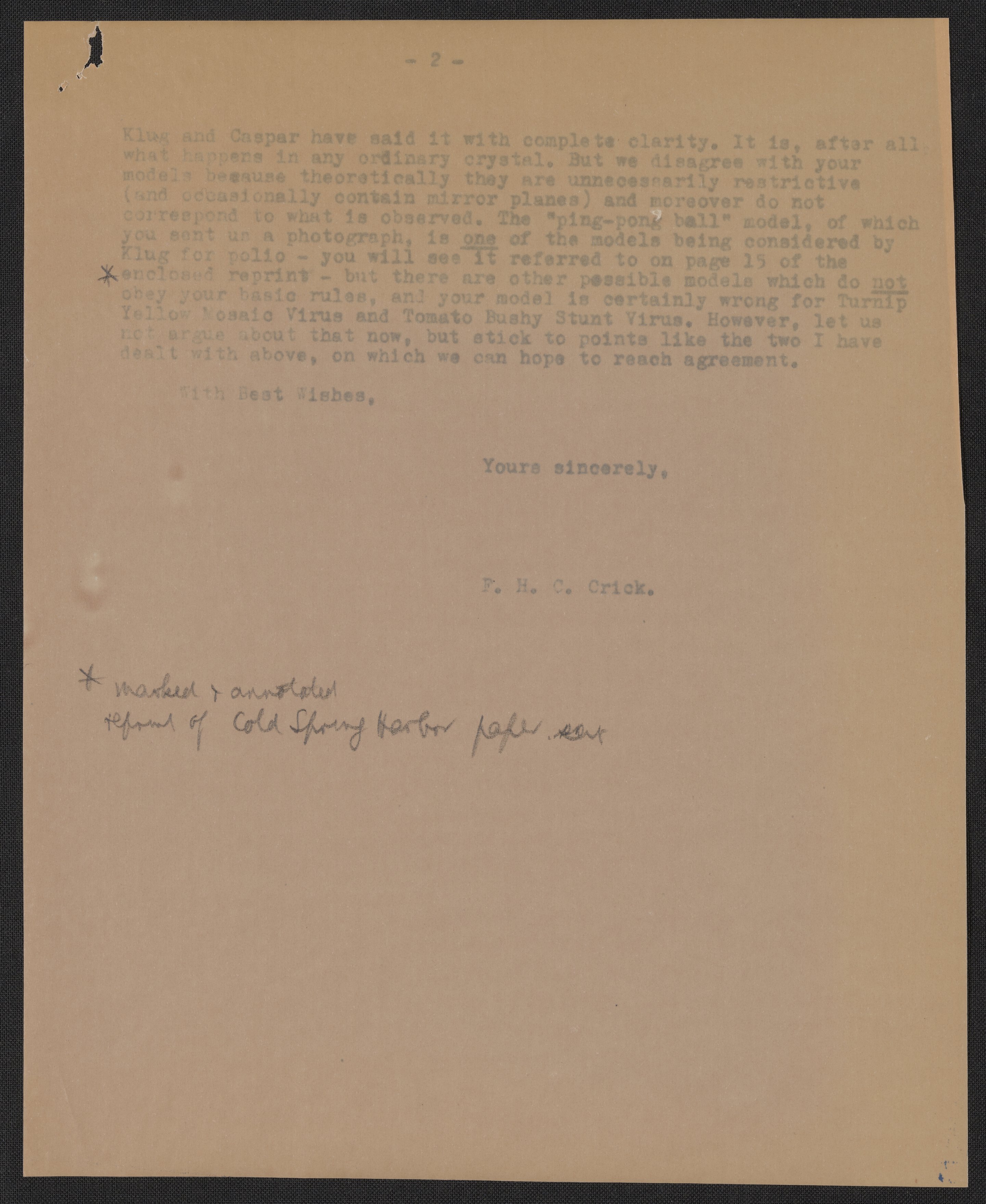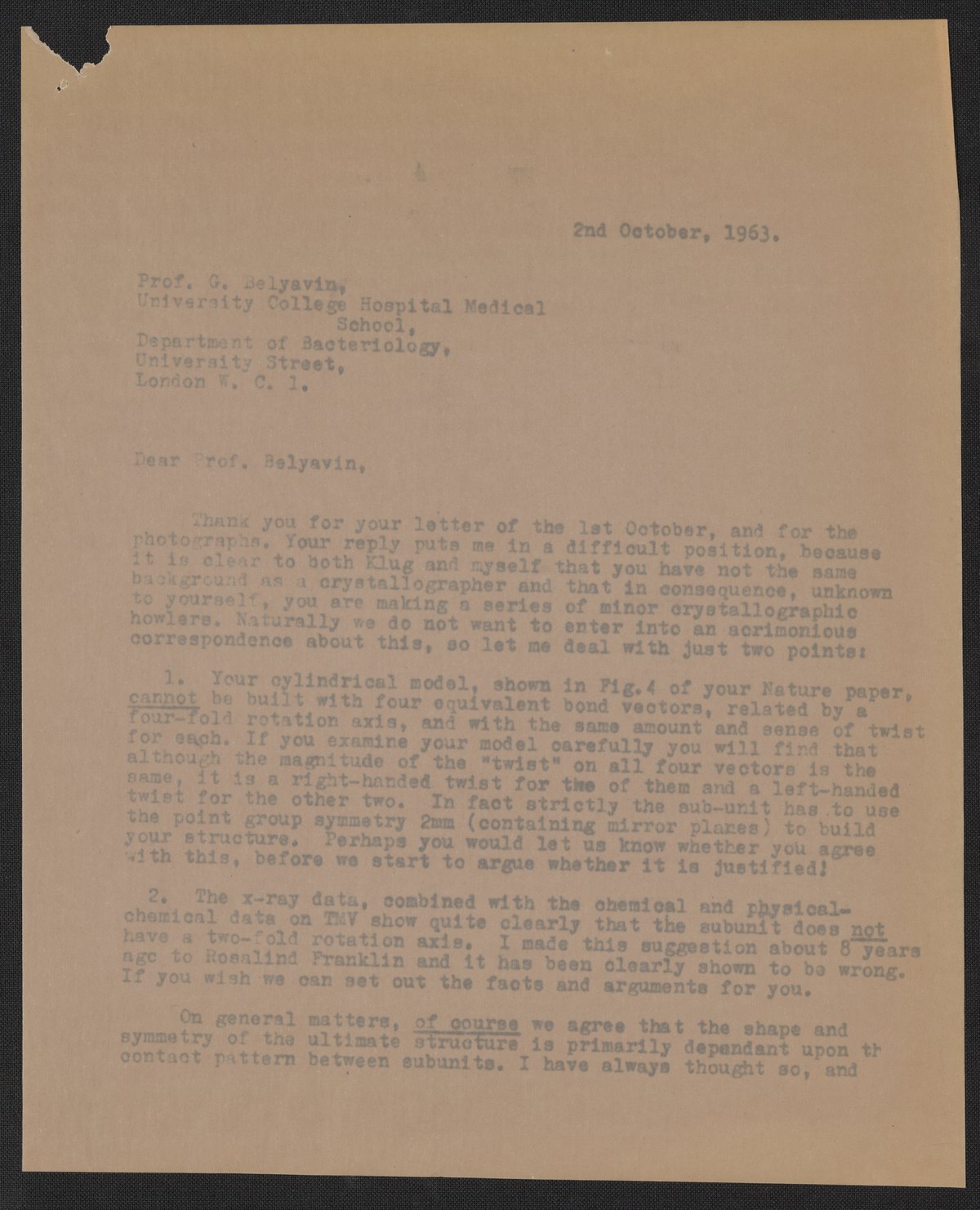 Crick, Francis. “Letter from Francis Crick to George Belyavin, October 2, 1963,” October 2, 1963. History of Molecular Biology Collection, Box 19, Folder 21. Science History Institute. Philadelphia. https://digital.sciencehistory.org/works/2v7zrhh.