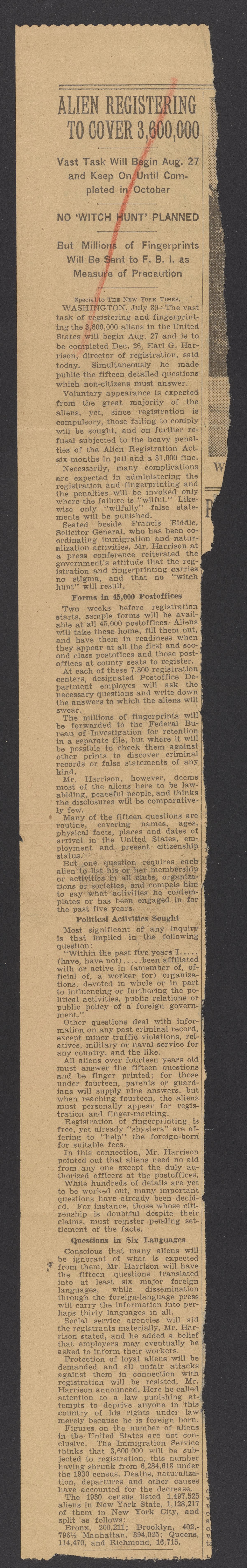 “Alien Registering to Cover 3,600,000.” New York times, circa 1940. Papers of Georg and Max Bredig, Box 10, Folder 26. Science History Institute. Philadelphia. https://digital.sciencehistory.org/works/2wy3wdc.