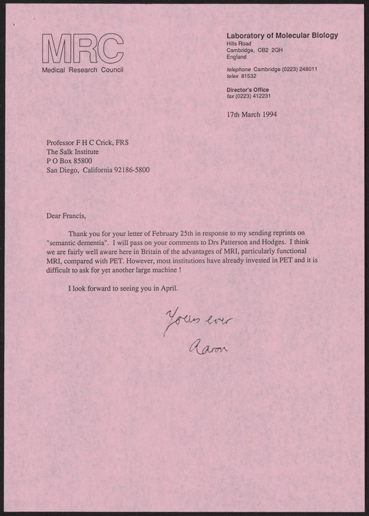 Klug, A. (Aaron), Sir. “Letter from Aaron Klug to Francis Crick, March 17, 1994,” July 17, 1994. History of Molecular Biology Collection, Box 20, Folder 5. Science History Institute. Philadelphia. https://digital.sciencehistory.org/works/2yaddwq.