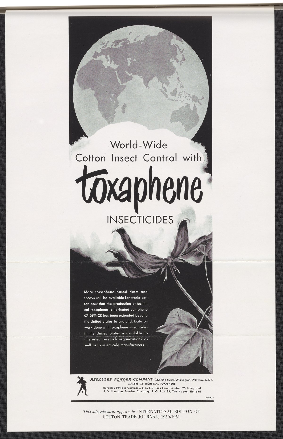 Print advertisement for toxaphene produced by Hercules Powder Company depicts the eastern hemisphere of the earth with an inset of a cotton plant. Accompanying paragraph states how the production of toxaphene has extended beyond the United States to England. This advertisement appeared in International Edition of Cotton Trade Journal, 1950-1951.