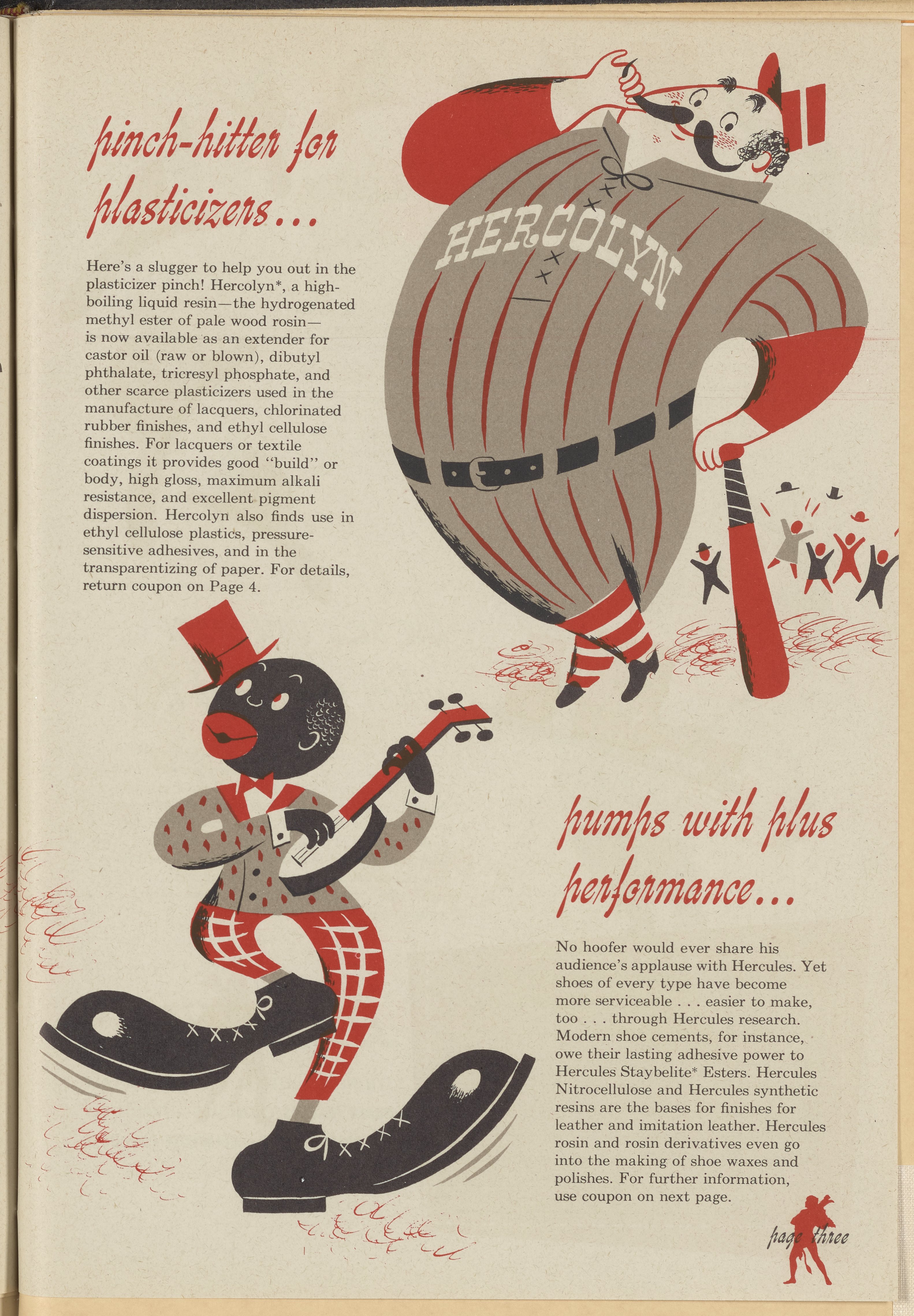 Small JPG1200 x 1737px — 358 KBLarge JPG2880 x 4170px — 1.8 MBFull-sized JPG3142 x 4549px — 2.1 MBOriginal fileTIFF — 3142 x 4549px — 40.9 MBA brochure describing the ways in which the Hercules Powder Company has assisted chemical manufacturers to improve either their products or processing methods. Discusses Hercules resins, post-graduate training programs, thermoplastics, and rosins. Illustrated with a series of colorful cartoons. Includes a racist caricature of a minstrel performer.