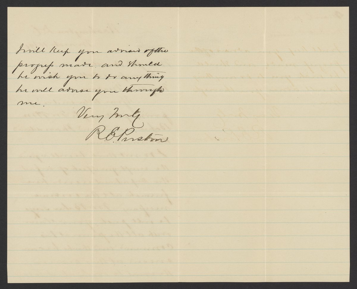 Small JPG1200 x 1873px — 327 KBFull-sized JPG2178 x 3400px — 971 KBOriginal fileTIFF — 2178 x 3400px — 21.2 MBLetter from Robert E. Preston (1836-1911), of the United States Mint Bureau, informs Margaret M. Booth née Cardeza that her lawyer, Mr. Baker, has received her signed contract and is going to work on her case with great hopes for a successful outcome.