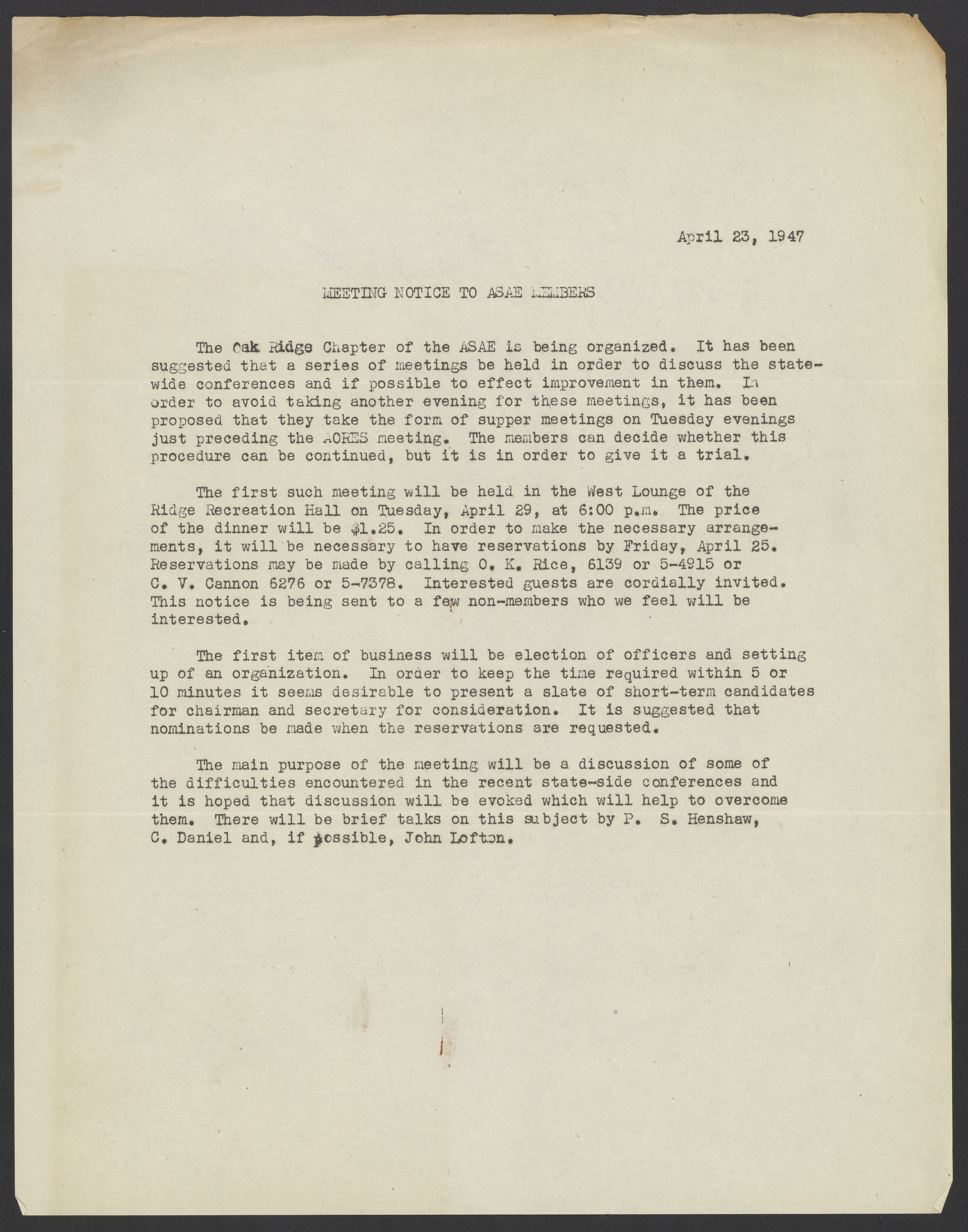 Meeting notice for the Association of Scientists for Atomic Education (ASAE). The meeting was held to elect officers and set up the Oak Ridge Chapter of ASAE.