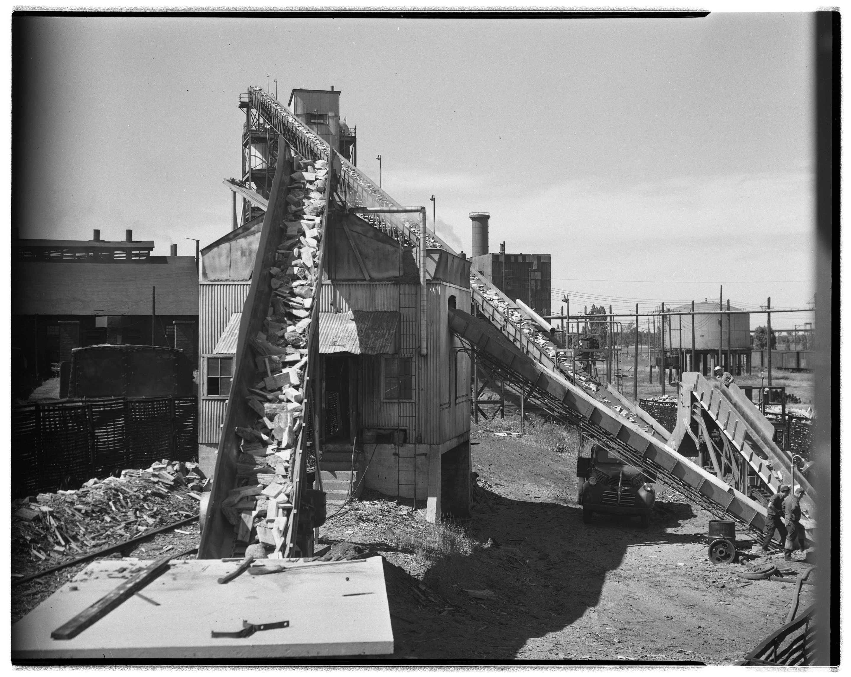 General view of the vertical retort and wood loading conveyor at the Cliffs Dow sawmill and wood distillation plant located in Marquette, Michigan. Providing a sense of scale, two unidentified employees are visible in the bottom right-hand corner of the photograph.