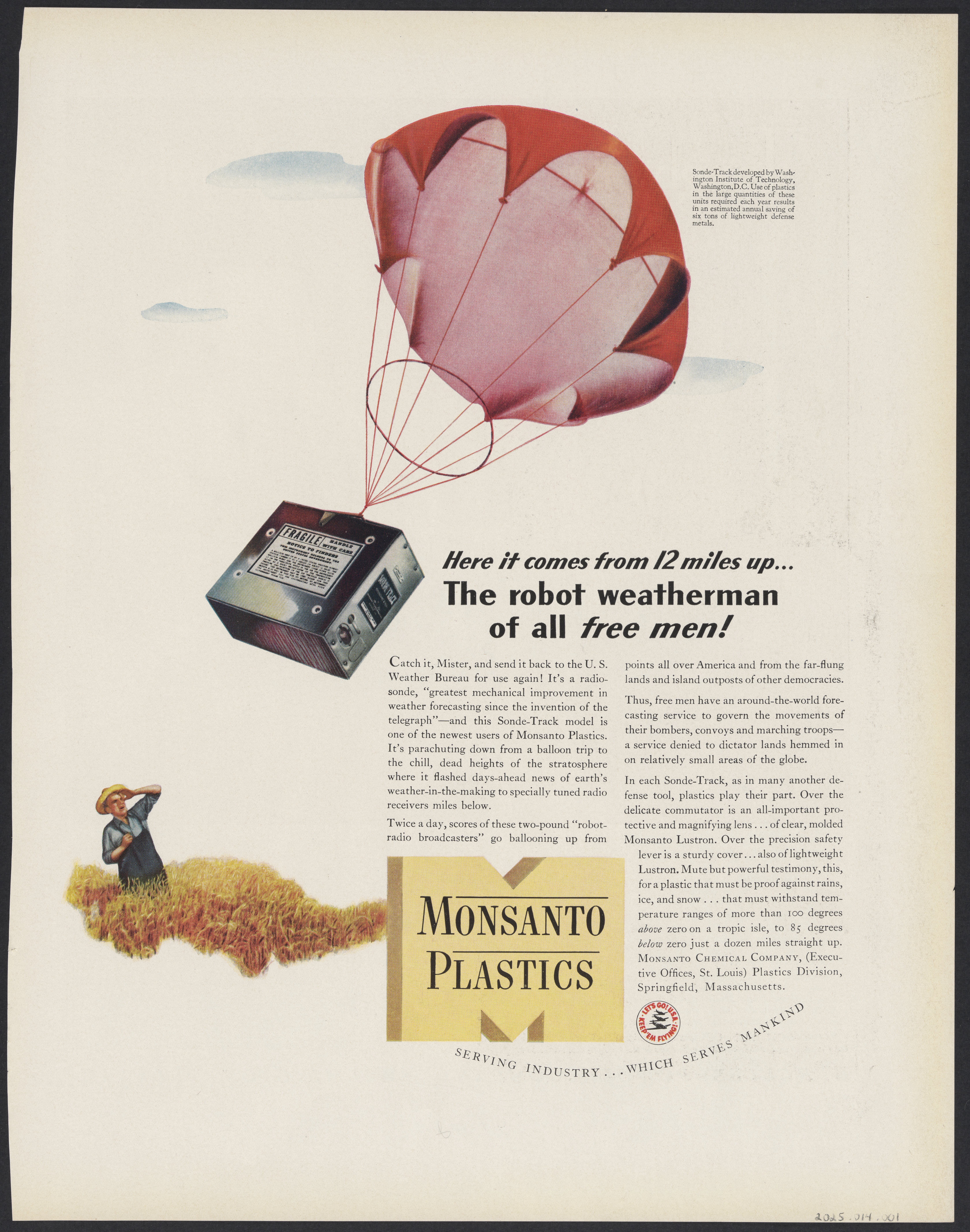 Advertisement from Monsanto Plastics for a radiosonde. Pictured in the ad is a device attached to a parachute descending from the sky as a farmer looks on. The radiosonde is coined as a "robot weatherman" with the tagline "Here it comes from 12 miles up...The robot weatherman of all free men!"