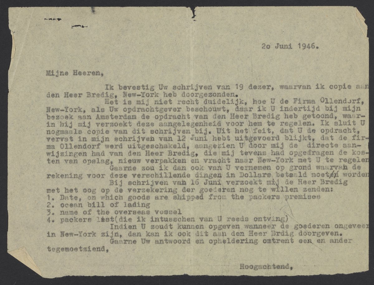 Het is mij niet recht duidelijk, hoe U de Firma Ollendorf, New-York, als Uw opdrachtgever beschouwt, daar ik U indertijd bij mijn bezoek aan Amsterdam de opdracht van den Heer Bredig heb getoond, waarin hij mij verwoekt deze aangelegenheid voor hem te regelen. Ik sluit nogmanls copie van dit schrijven bij. Uit het feit, dat U de opdracht, vervat in mijn schrijven van 12 Juni hobt uitgevoerd blijkt, dat de firma Ollendorf werd uitgeschakeld, aangezien Undeer mij de direete aanwijzingen had van den Heer Bredig, die mij tevens had opgefragen de kosten van opslag, nieuw verpakken en vracht naar New-York met Ute regelen.