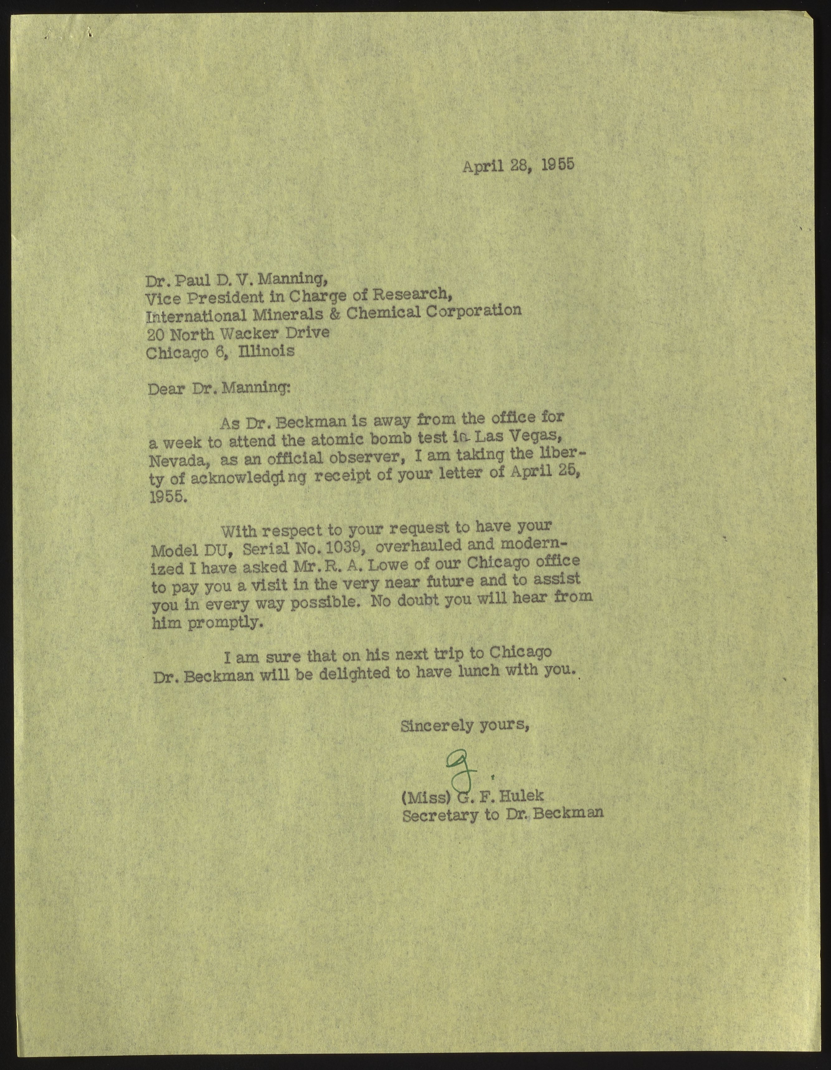 Hulek, Arnold Beckman's secretary, responds to a letter from Manning requesting the overhaul of a spectrophotometer. She explains that Beckman himself is in Nevada observing an atomic bomb test.