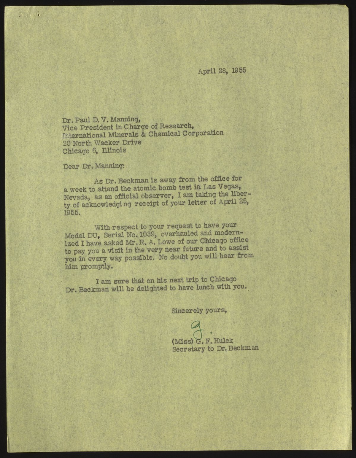 Hulek, G. F. “Letter from G. F. Hulek to Dr. Paul D. V. Manning,” April 26, 1955. Beckman Historical Collection, Box 14, Folder 1. Science History Institute. Philadelphia. https://digital.sciencehistory.org/works/37720d088.